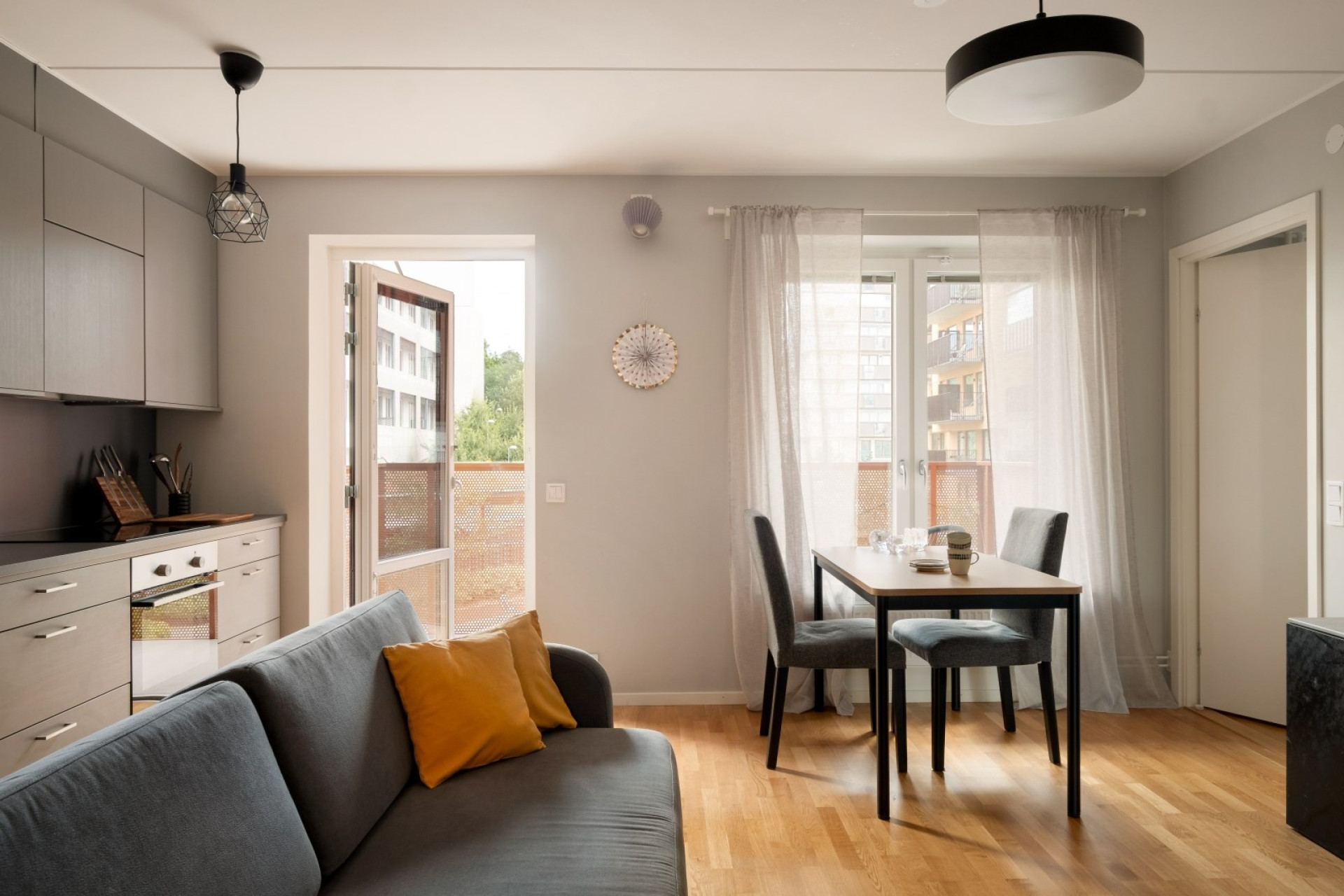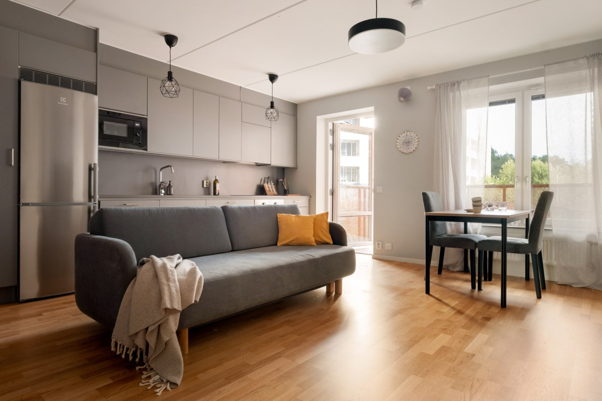 Vardagsrummet ligger med öppen planlösning mot köket och tillsammans blir de en rymlig och trivsam social yta. Här finns det plats för soffa, köksbord och arbetsplats.