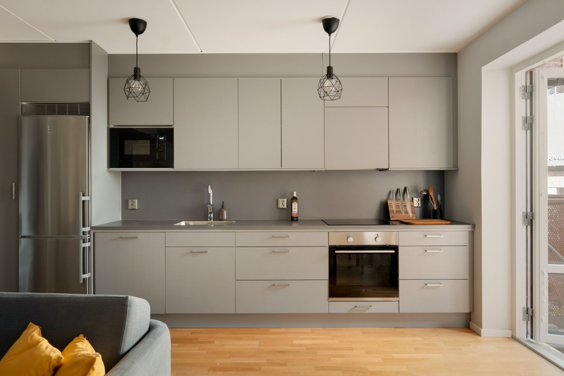 Köket är från Vedum i grått och utrustat med kyl/frys, ugn/mikro, häll och diskmaskin. Samtliga vitvaror från Electrolux samt läcker fläkt från Pandora Green Flow, dold bakom en skåplucka.