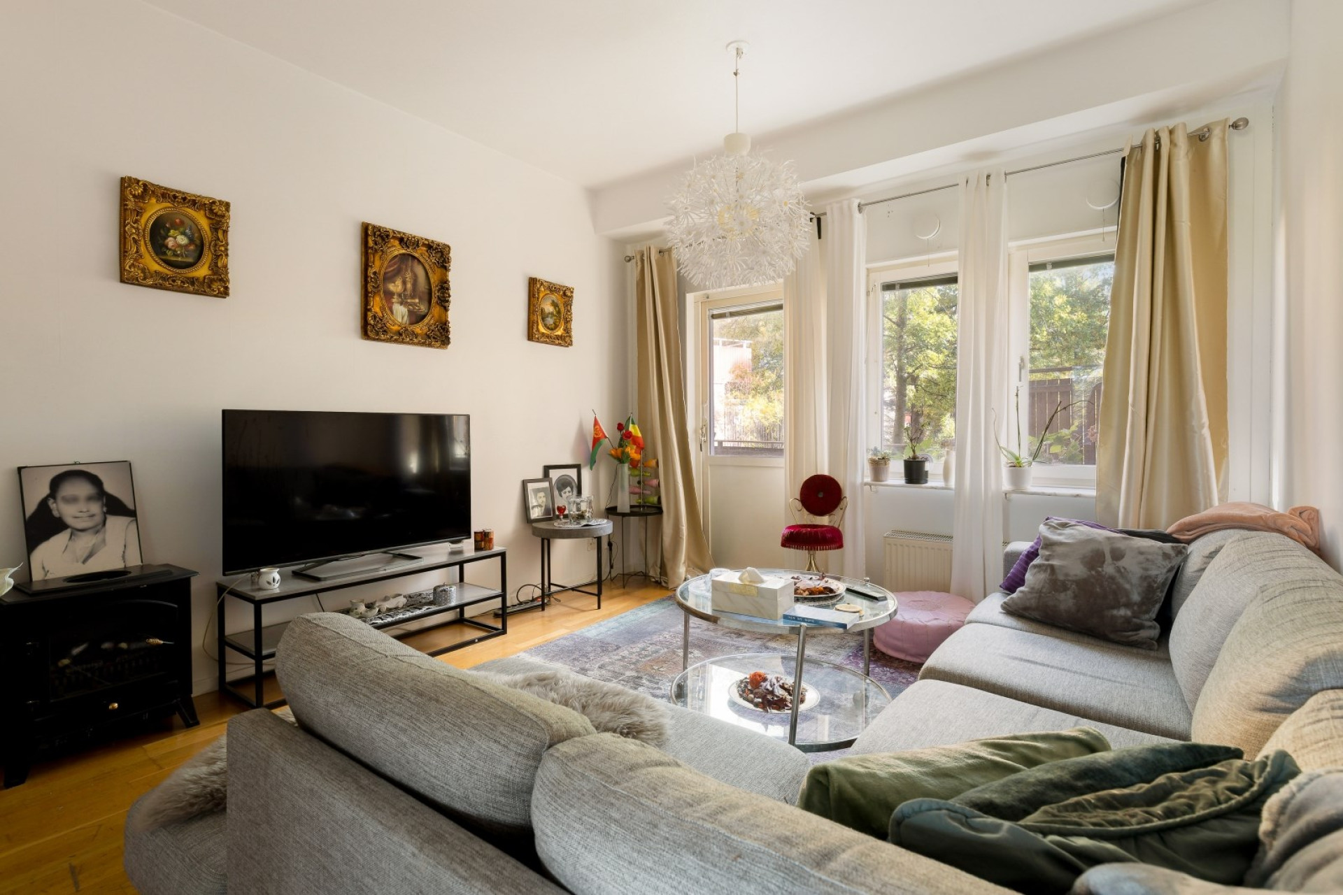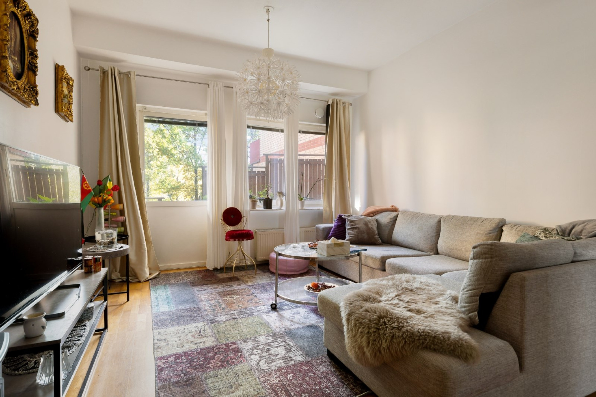 Högt i tak och luftigt vardagsrum med fönster som släpper in härligt ljus. Från vardagsrummet är det utgång till lägenheten rymliga uteplats.