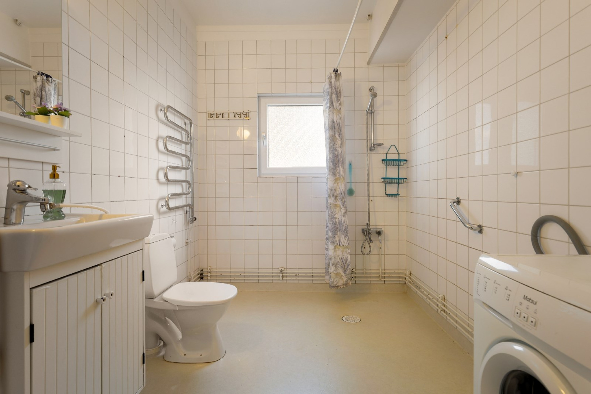 Badrum med fönster, våtrumsmatta på golv och kaklade väggar. Här finns: wc, dusch, tvättmaskin, vattenburen handdukstork, kommod och spegel.