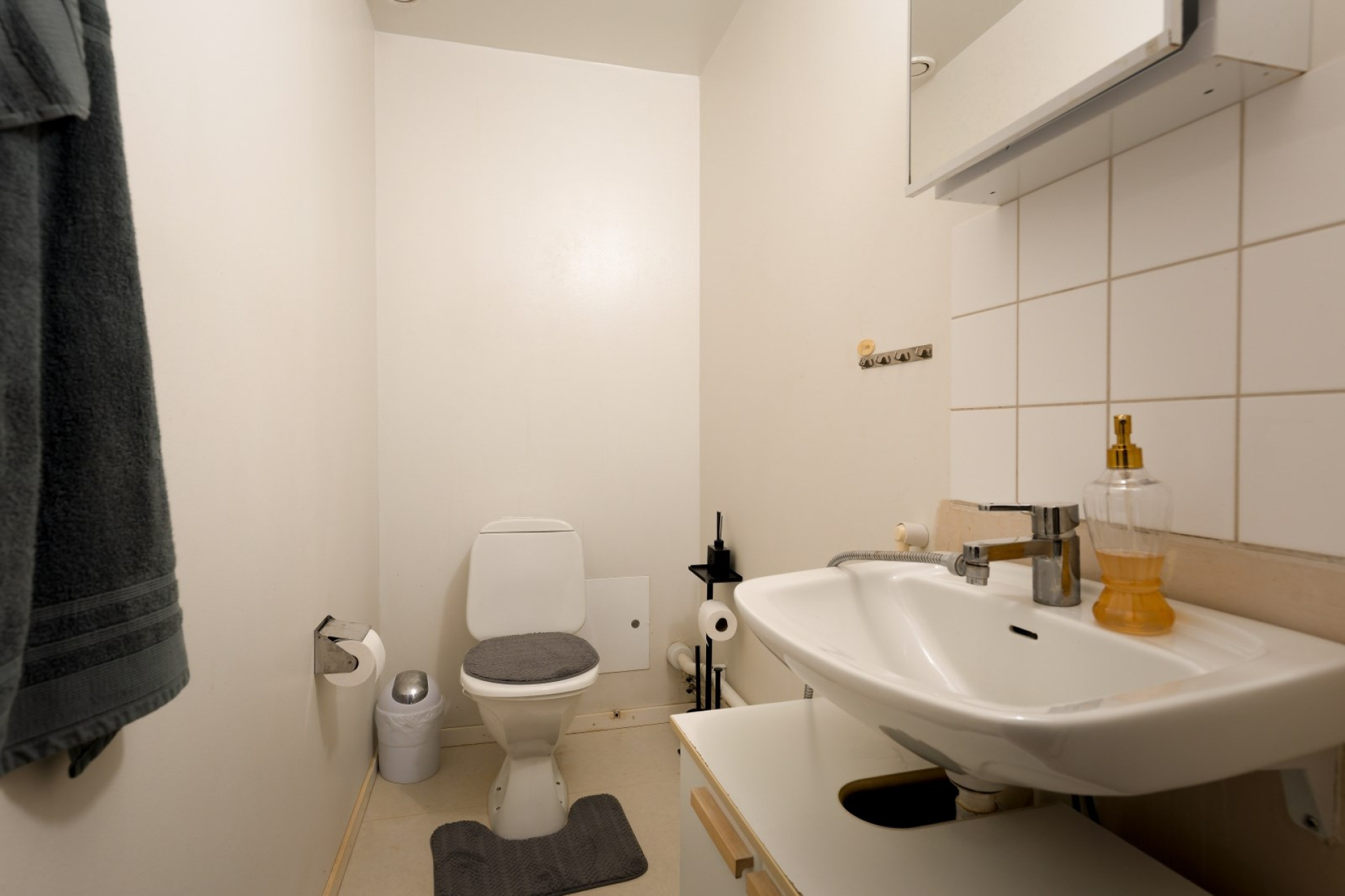 Gästtoalett med wc, tvättställ och spegelskåp.