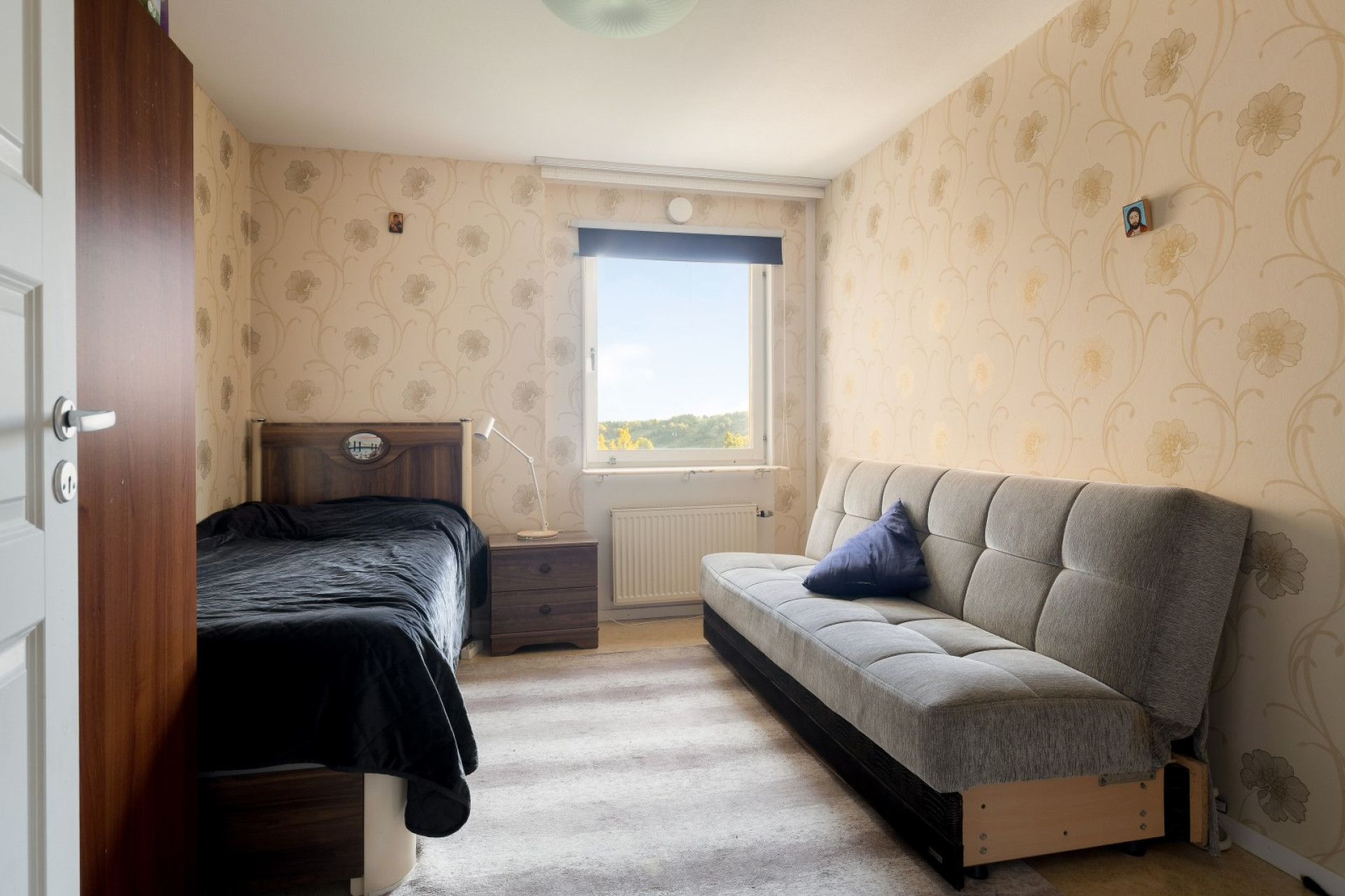 Ljust och rymligt sovrum med fönster.