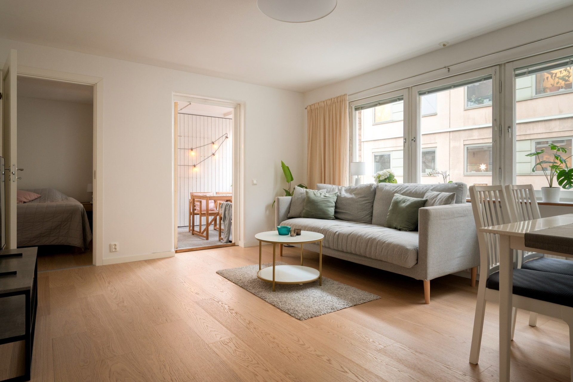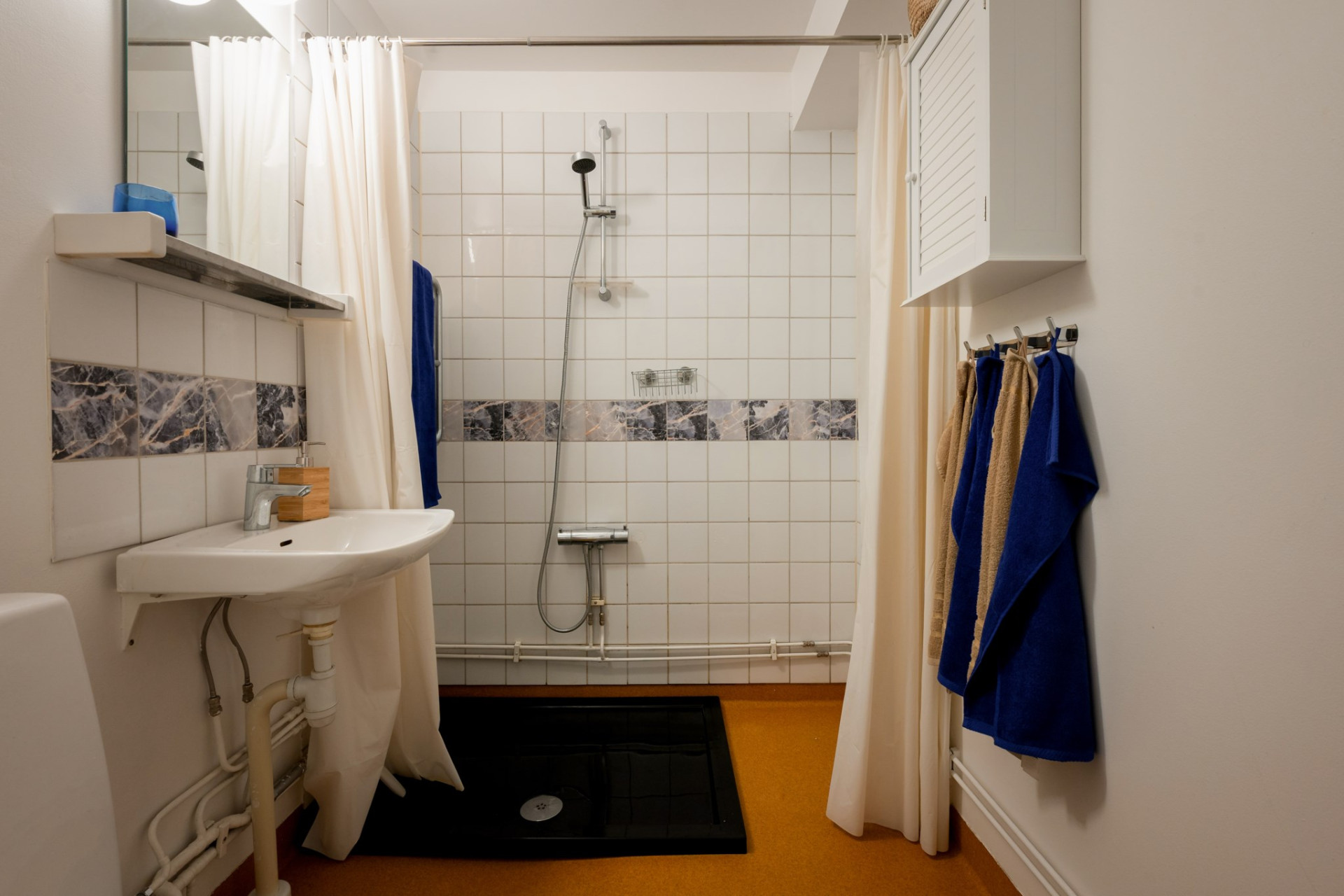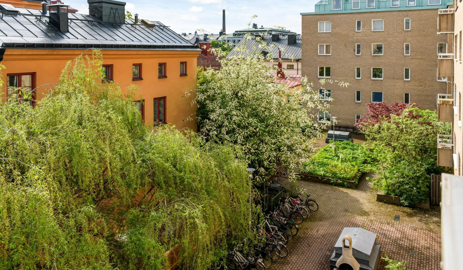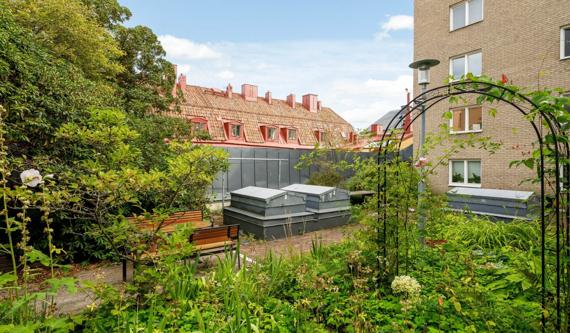 Lugn och trevlig innergård med planteringar, grillmöjligheter och flera sittplatser. En aktiv trädgårdsgrupp finns för de som är intresserade. 2 tvättstugor med vardera 3 maskiner, 1 torktumlare och 1 torkrum. Festlokal som kan hyras för 300kr/dygn. Övernattningslägenhet som kan hyras för 200kr/dygn. Cykelförråd och barnvagnsförråd finns i huset