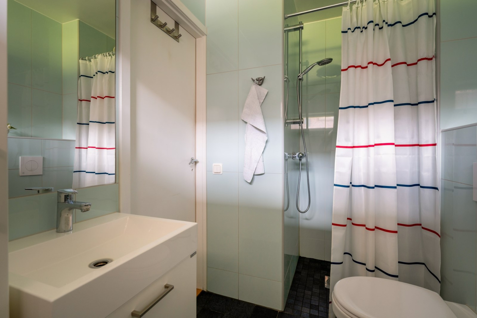 Badrummet är kaklat i ljusgrönt med svart klinkergolv. Utrustat med dusch, wc, tvättställ med kommod, handdukstork samt tvättmaskin med arbetsbänk och väggskåp ovan. Dessutom finns förvaring i två badrumsskåp.