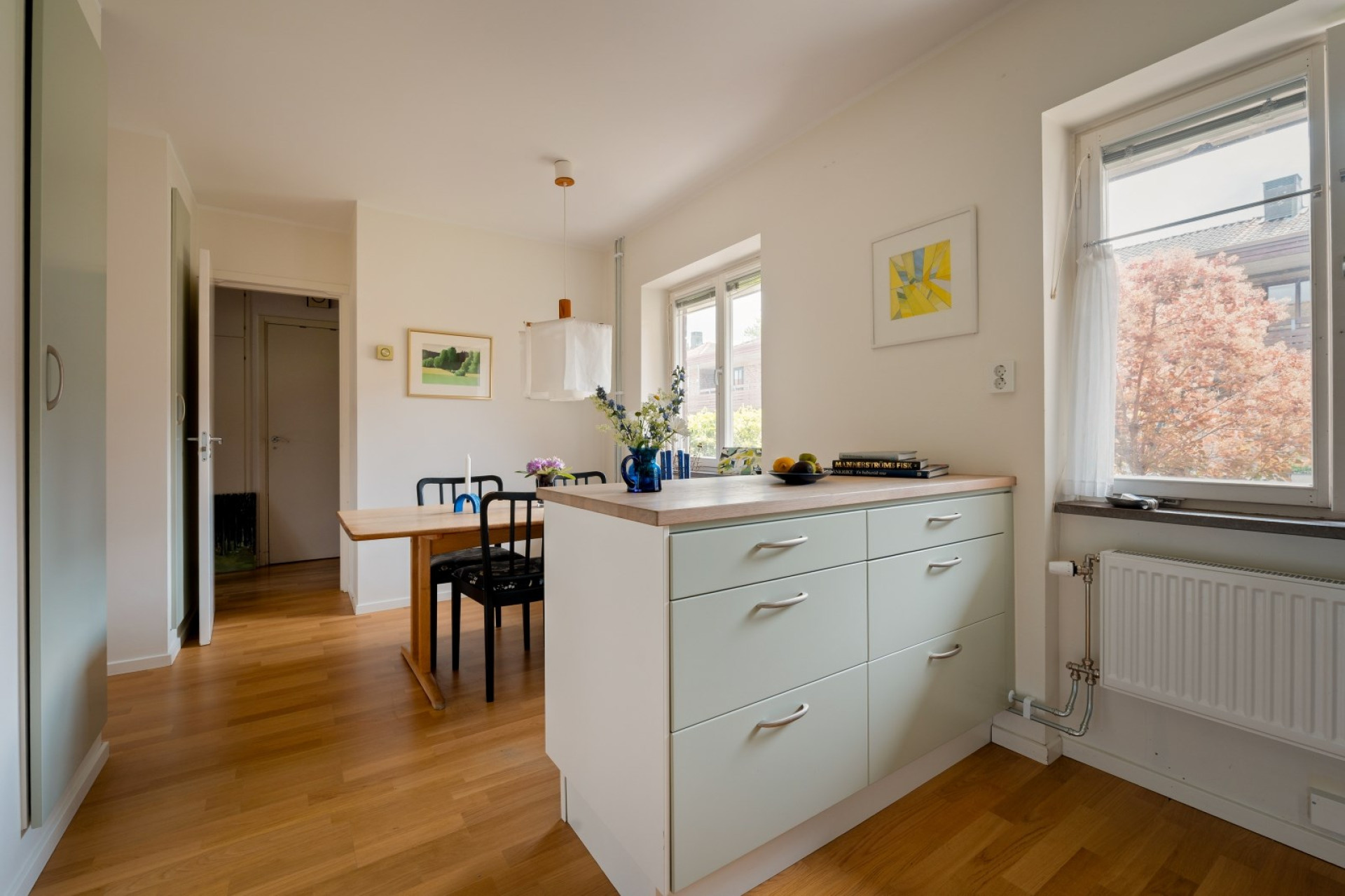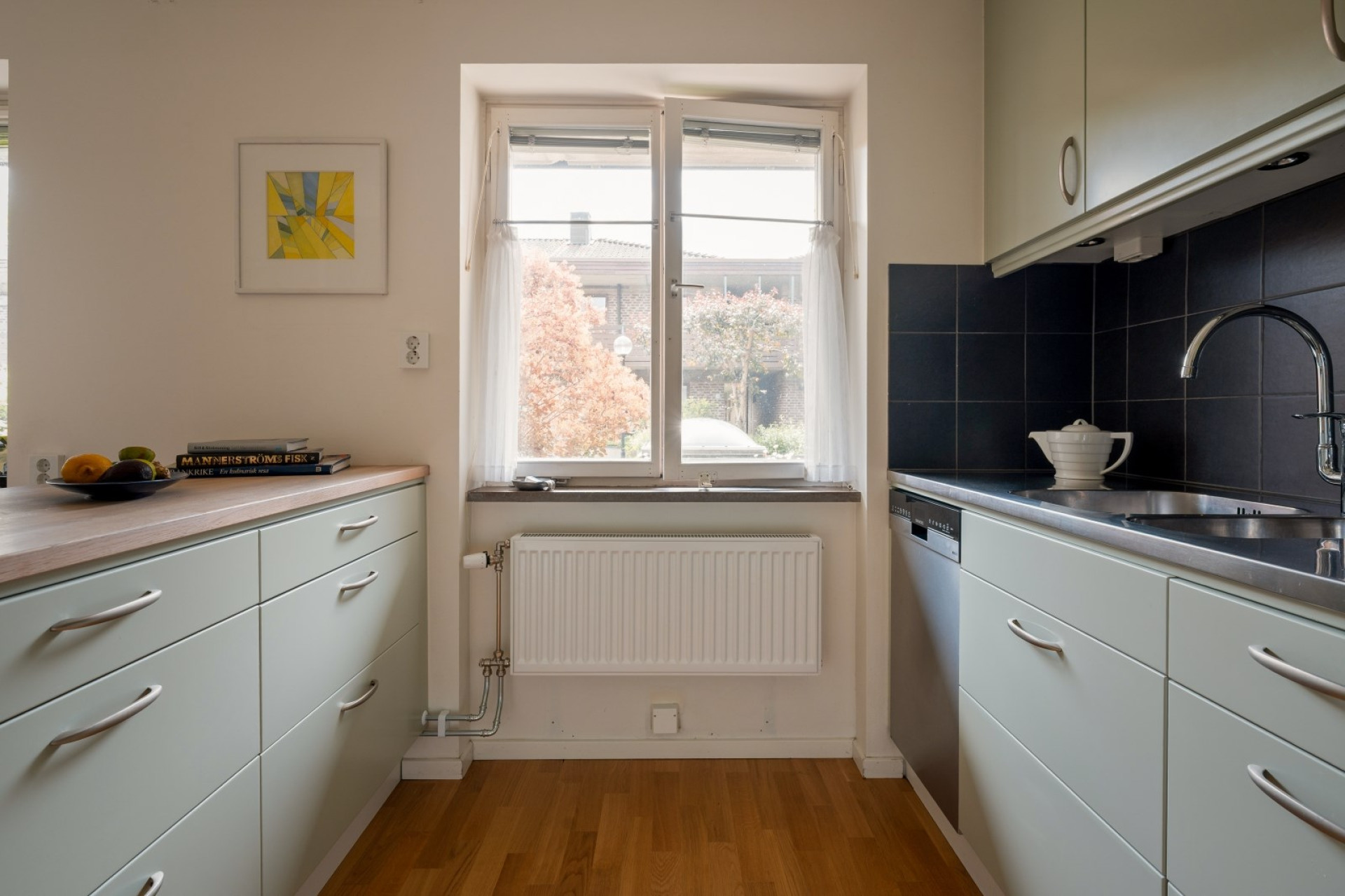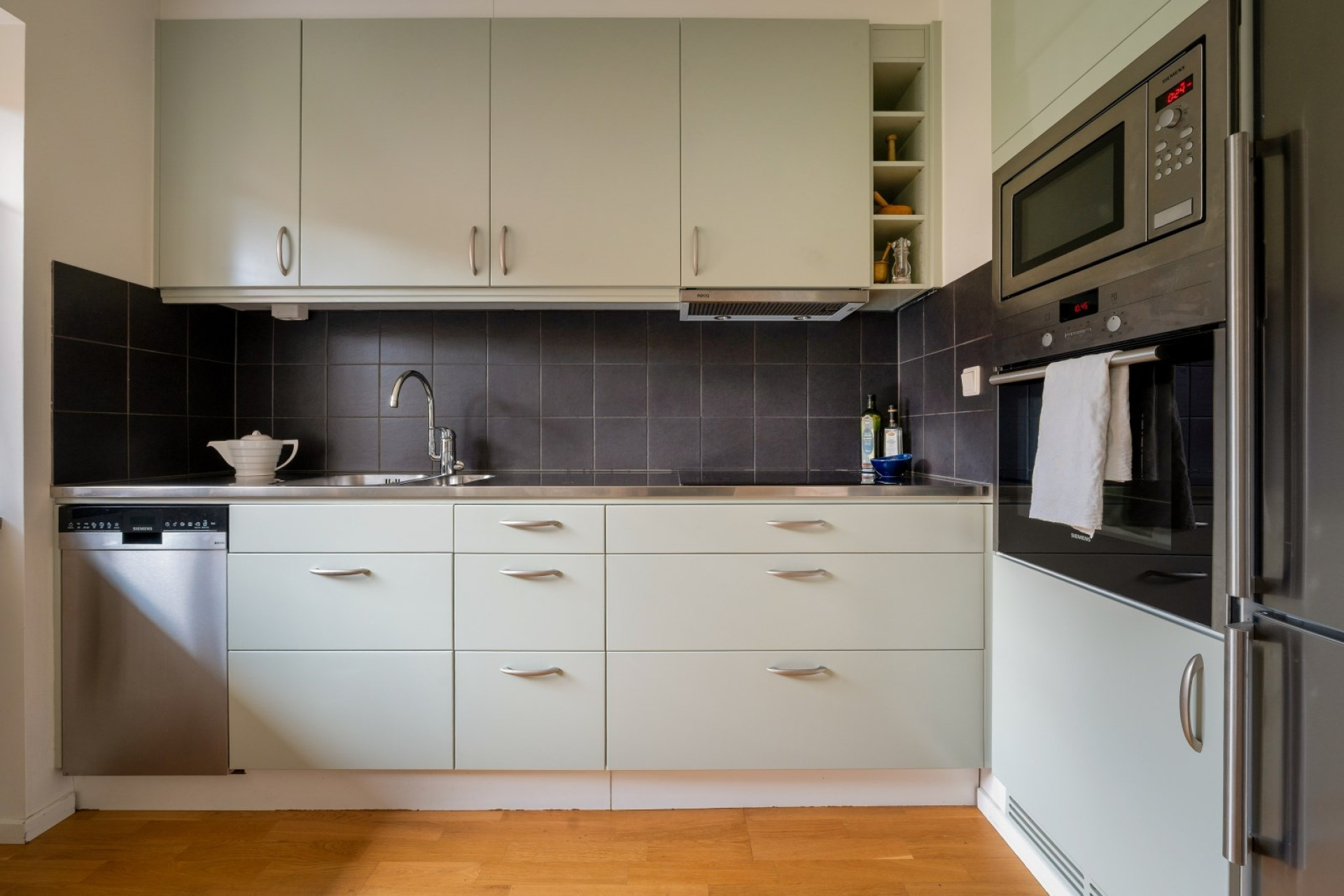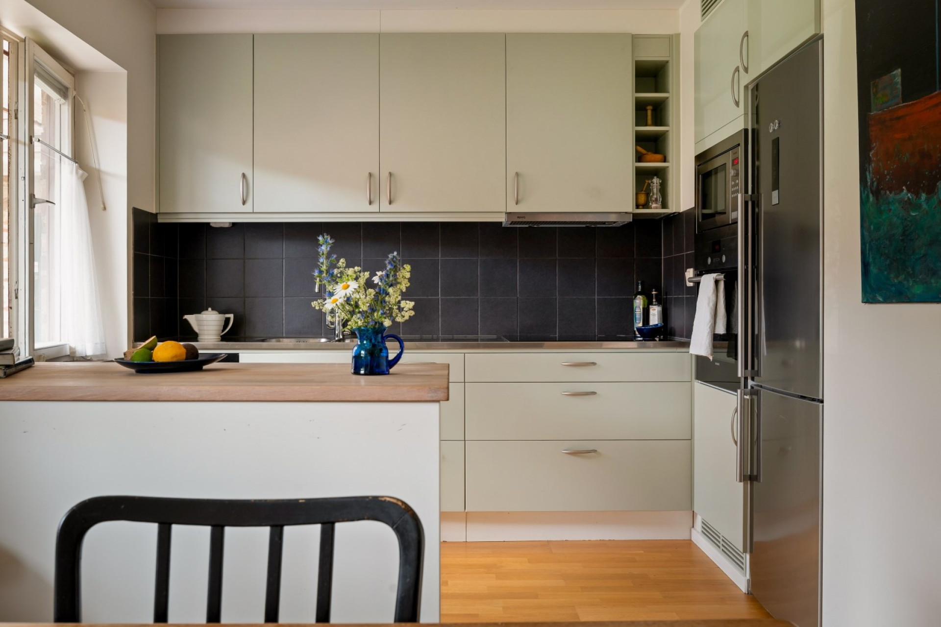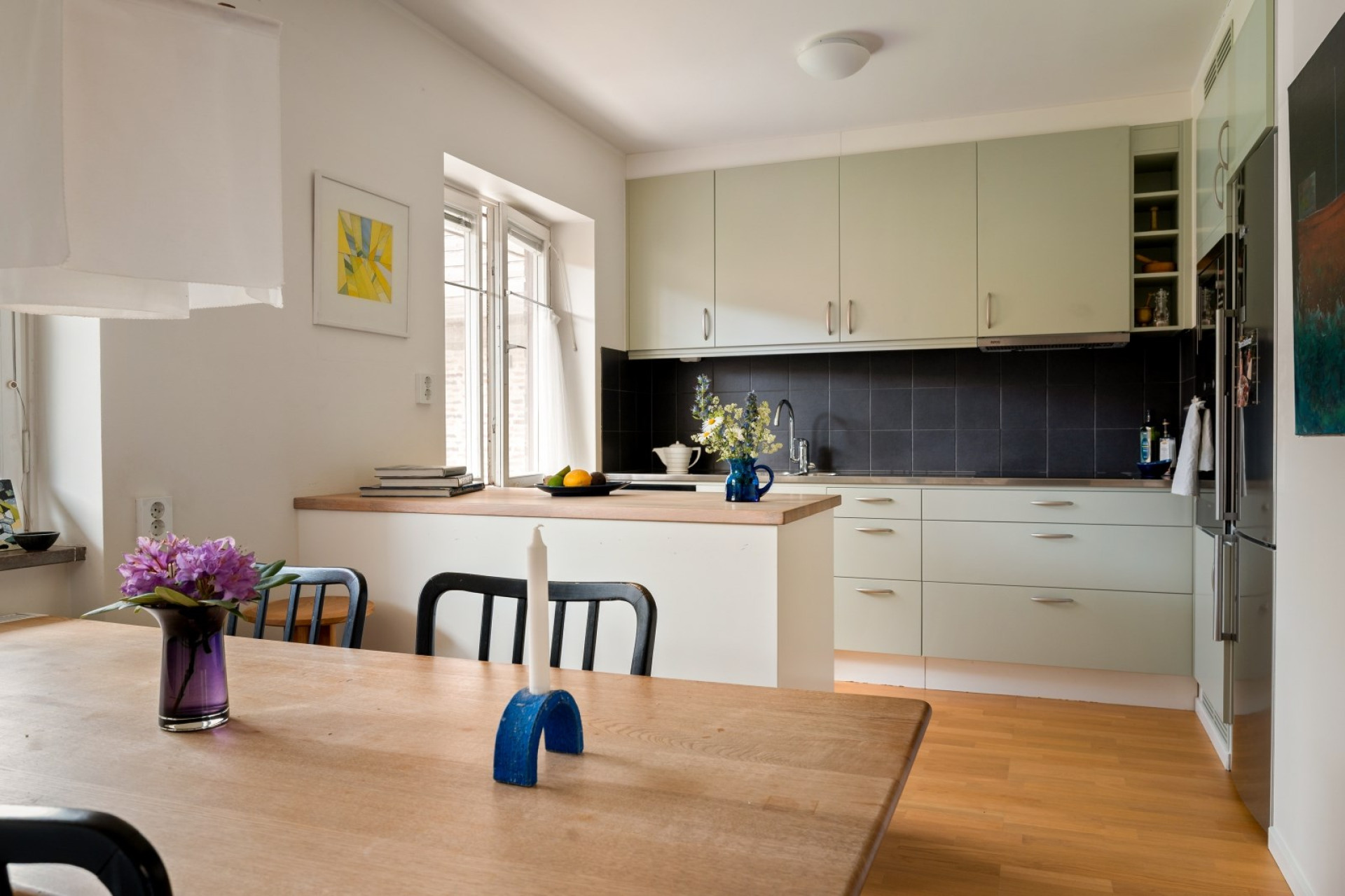 Praktiskt kök med bra förvaring bakom ljusgröna luckor. Stänkskydd i svart kakel ovan arbetsbänk i rostfritt. I köket ryms ett stort matbord och stolar. Köket är utrustat med kombinerad kyl/frys, mikrovågsugn, ugn och diskmaskin.