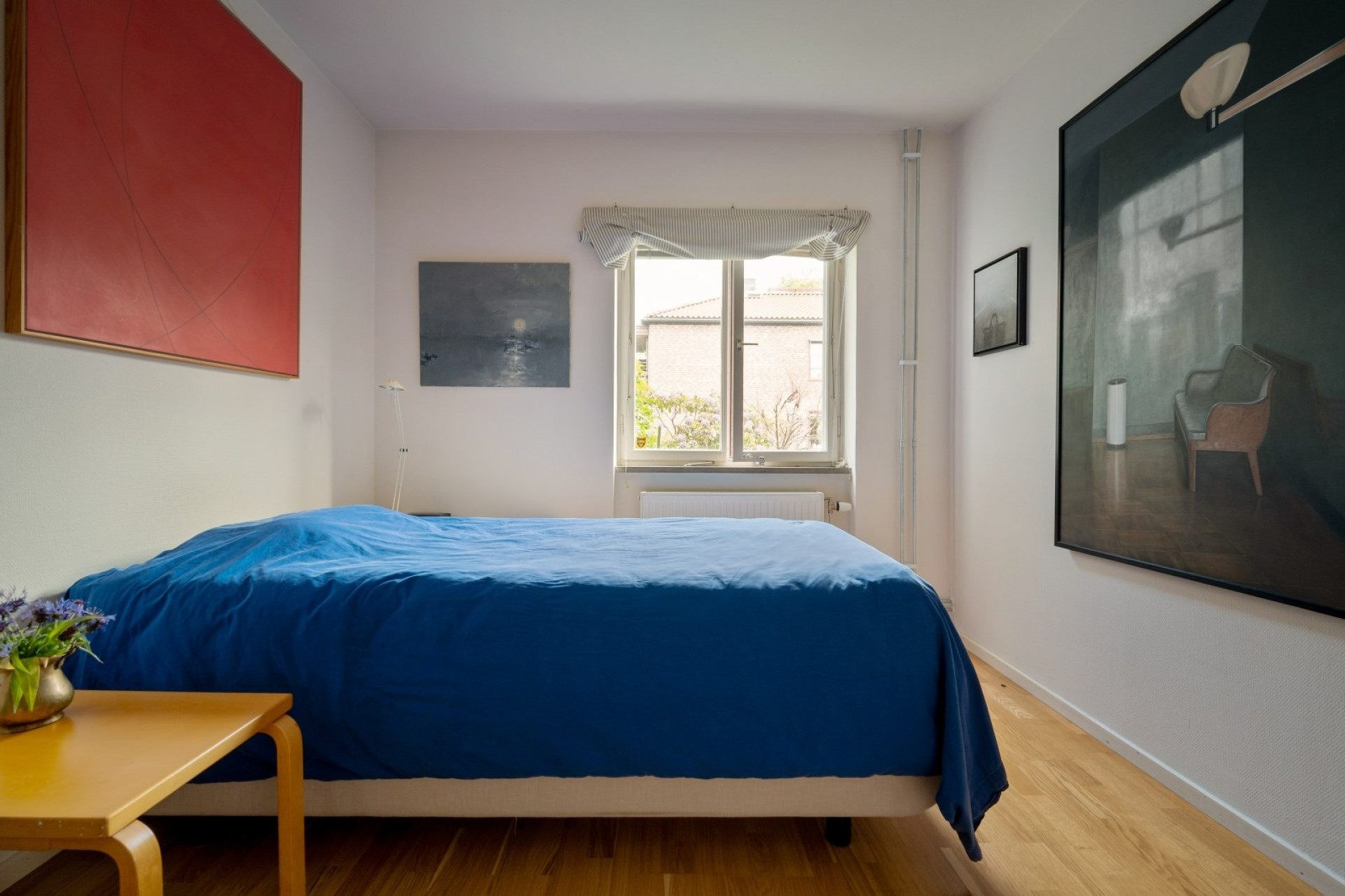 Sovrummet vetter mot innergården och rymmer dubbelsäng med sängbord och förvaringsmöbel.