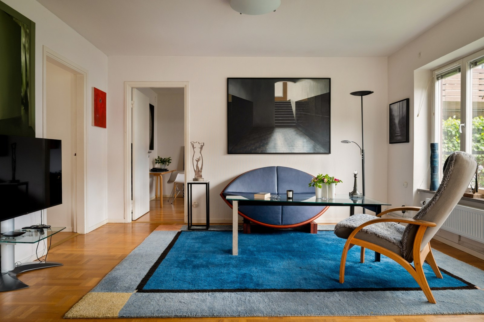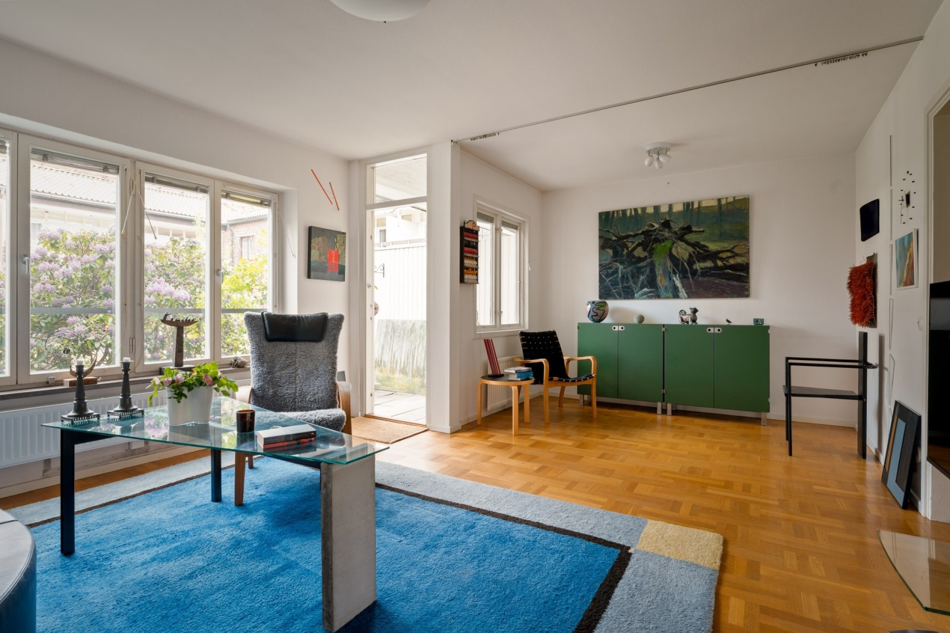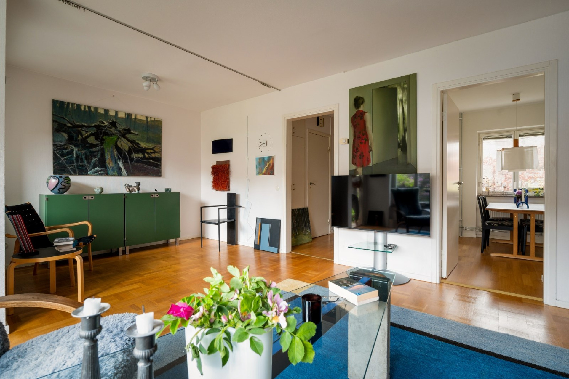 Ljust och rymligt vardagsrum med vackert parkettgolv. Här ryms soffgrupp och övrigt möblemang utan problem. Från vardagsrummet finns utgång till uteplatsen.