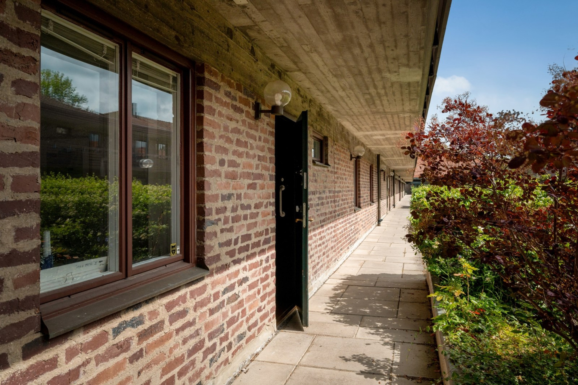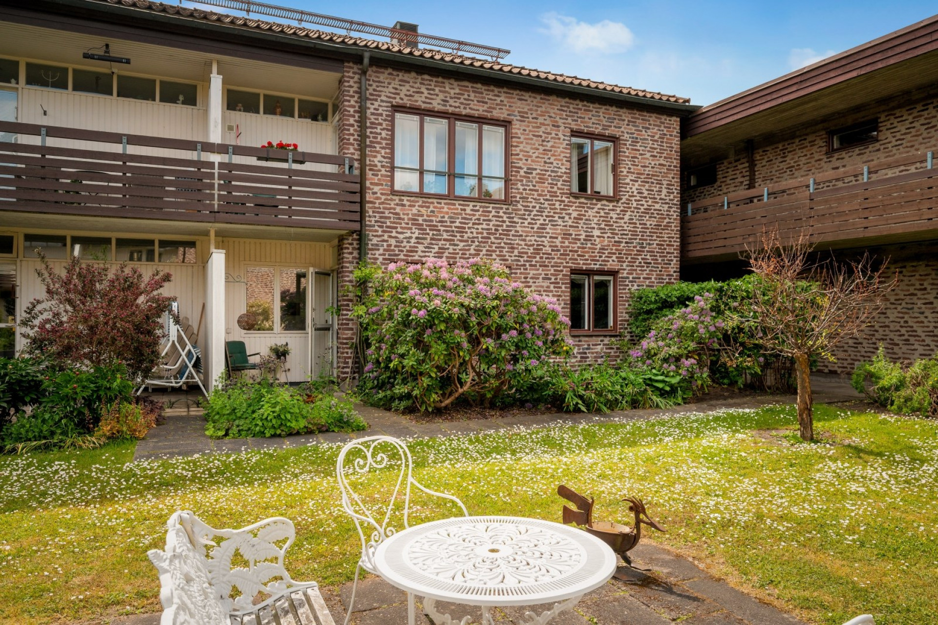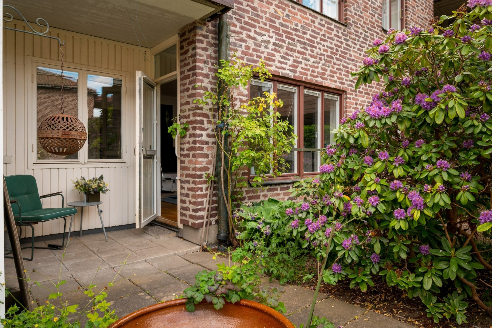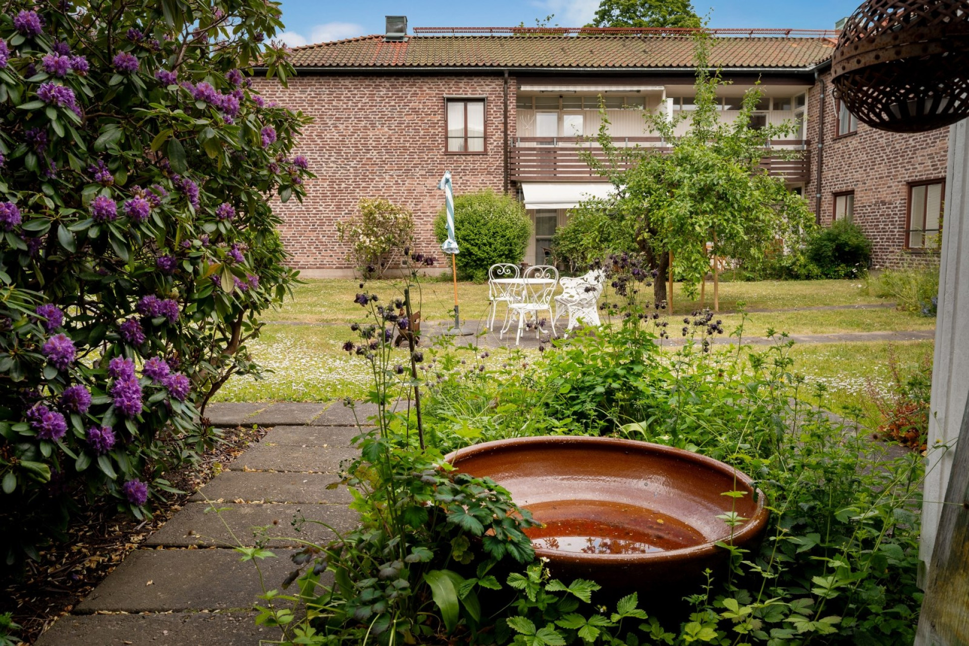 Stenbelagd uteplats som vetter mot föreningens trivsamma gård med sittmöbler. Här finns plats för utemöbler och i rabatterna finns gott om grönska med bl.a. en stor lilablommande rhododendron.