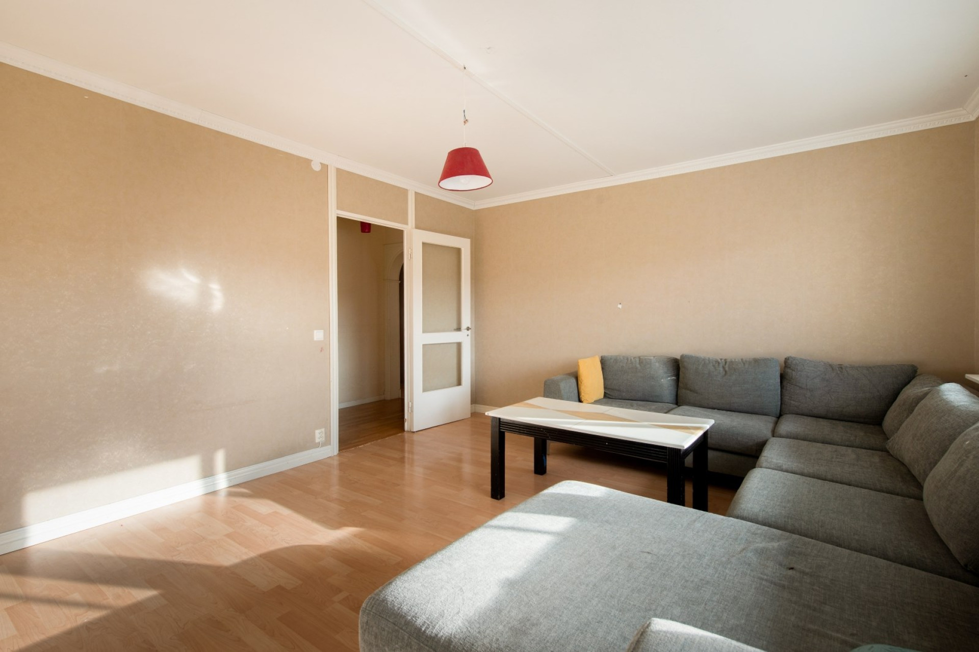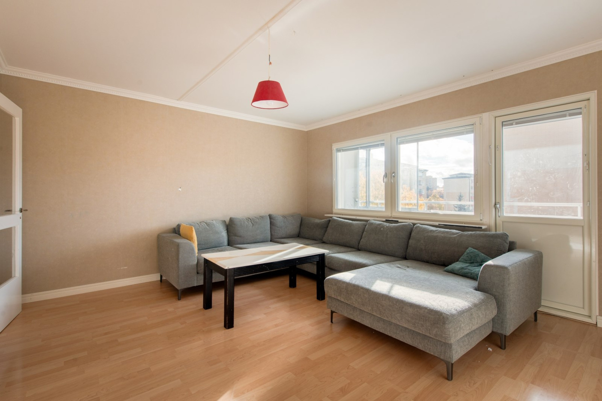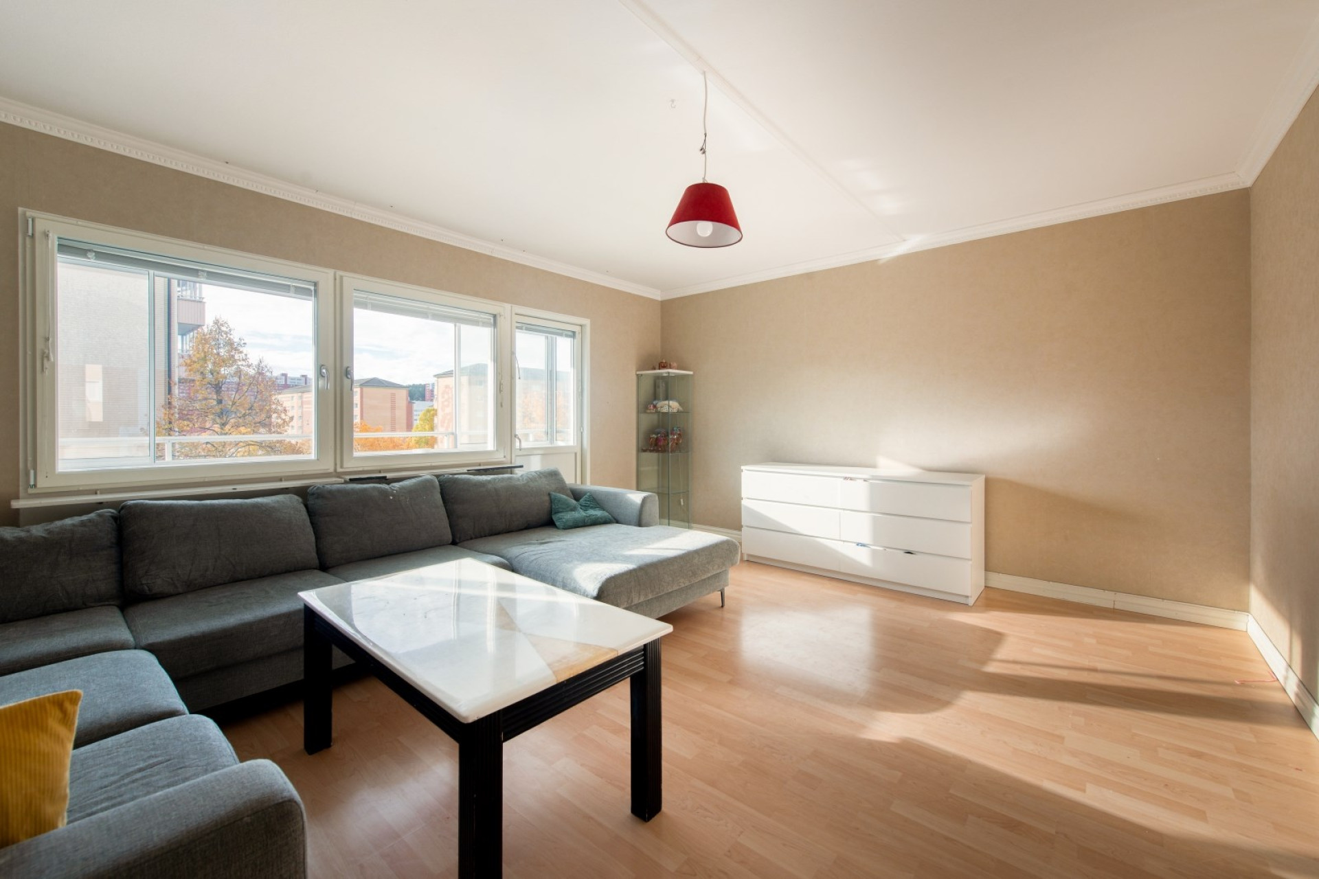 Rymligt och lättmöblerat vardagsrum med stora fönsterpartier som släpper in härligt ljus. Här finns gott om plats för möblemang. Från vardagsrummet är det utgång till lägenhetens rymliga inglasade balkong.