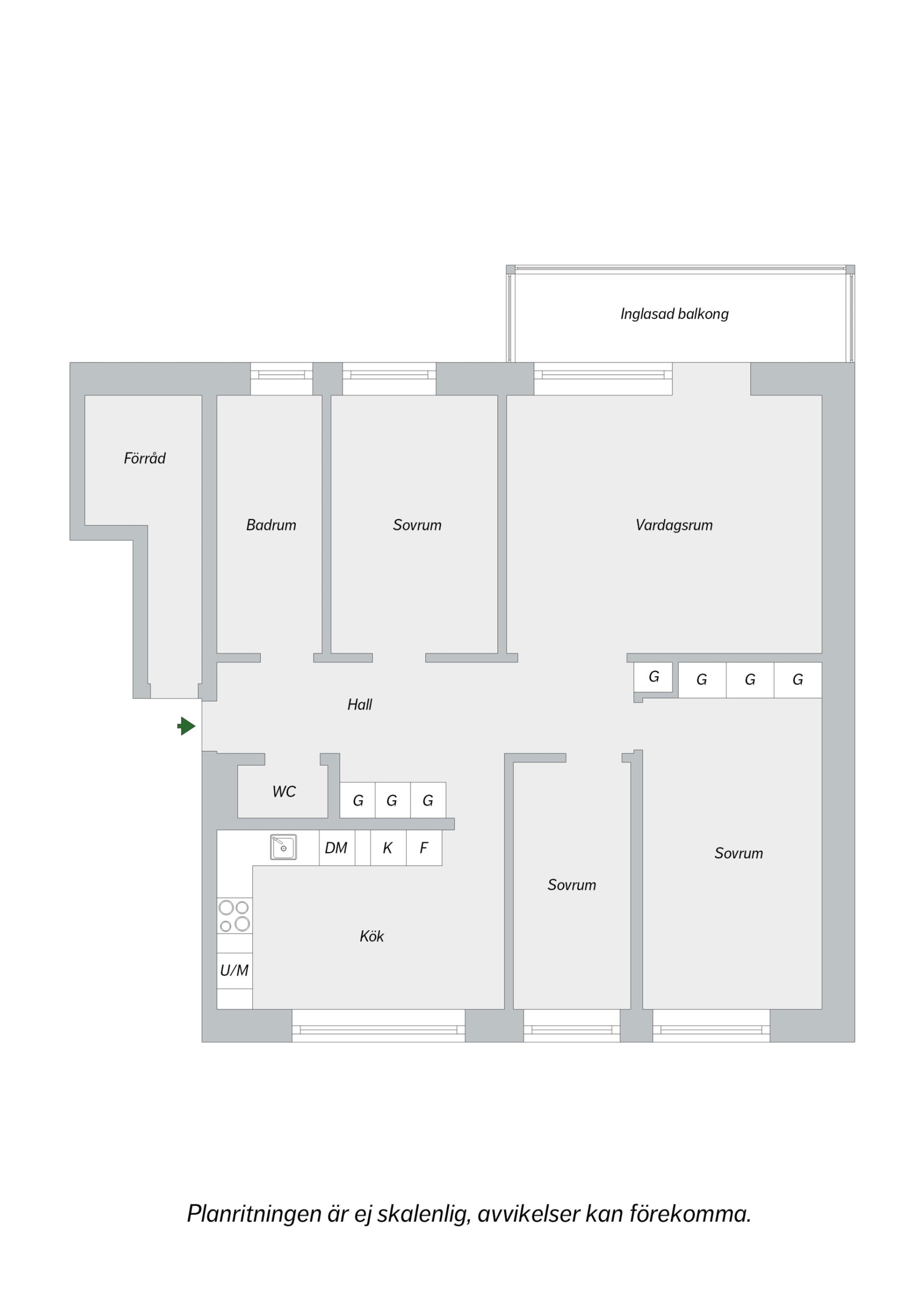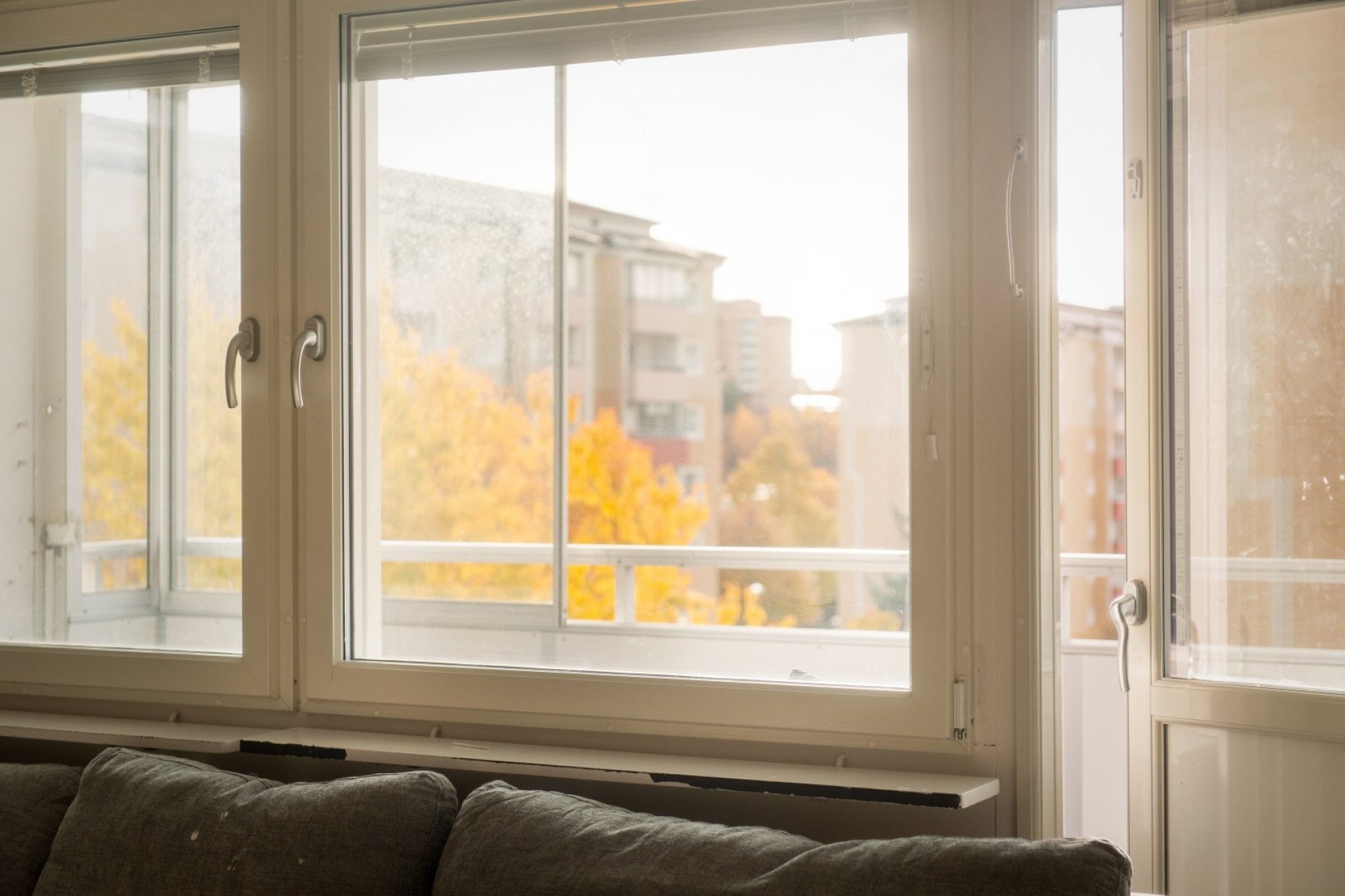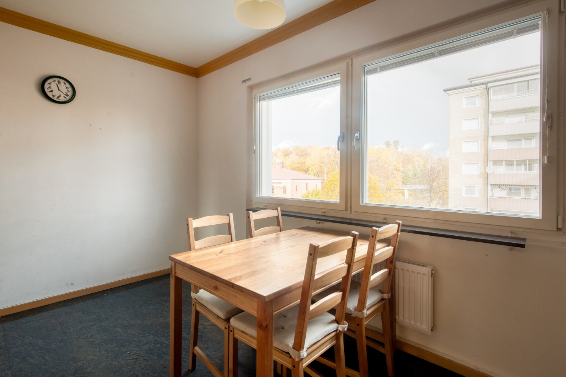 Rymligt och lättmöblerat vardagsrum med stora fönsterpartier som släpper in härligt ljus. Här finns gott om plats för möblemang. Från vardagsrummet är det utgång till lägenhetens rymliga inglasade balkong.