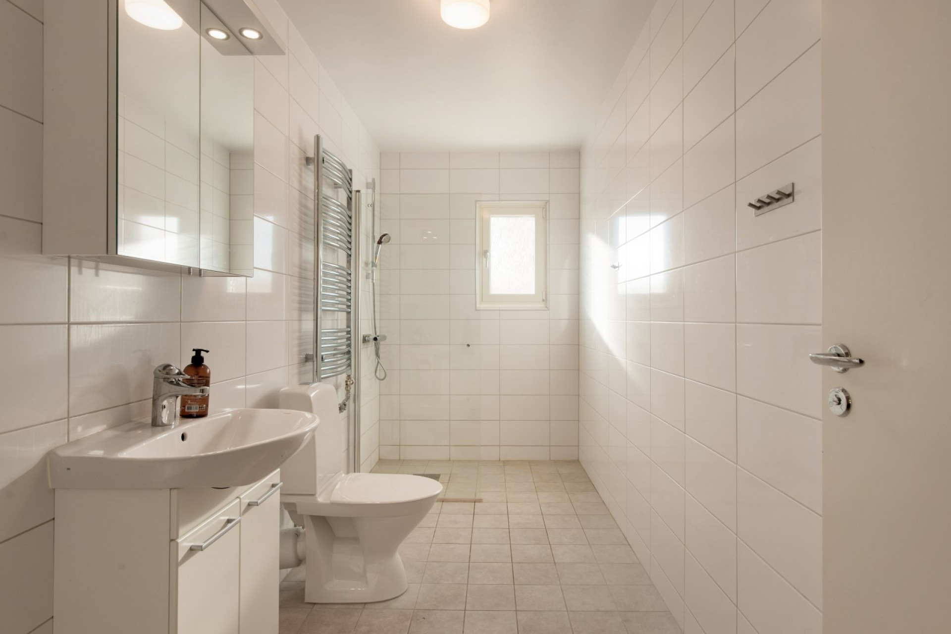 Helkaklat badrum med fönster. Badrumsutrustningen består av: wc, dusch, vattenburen handdukstork, kommod, spegelskåp. Detta är ett badrum man gärna spenderar tid i!