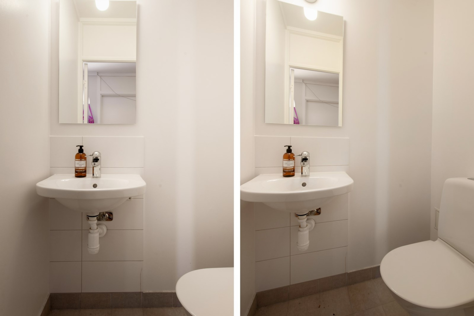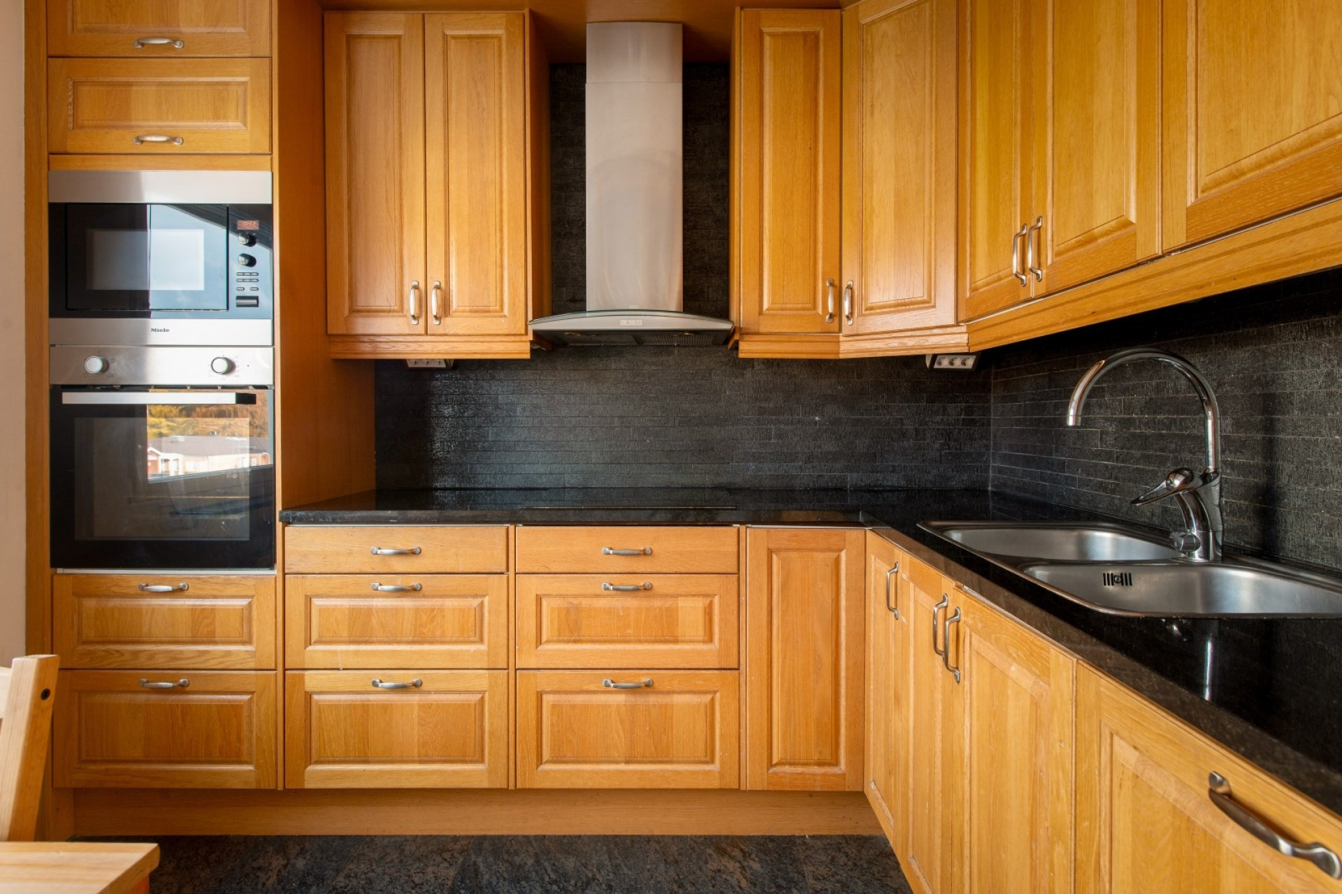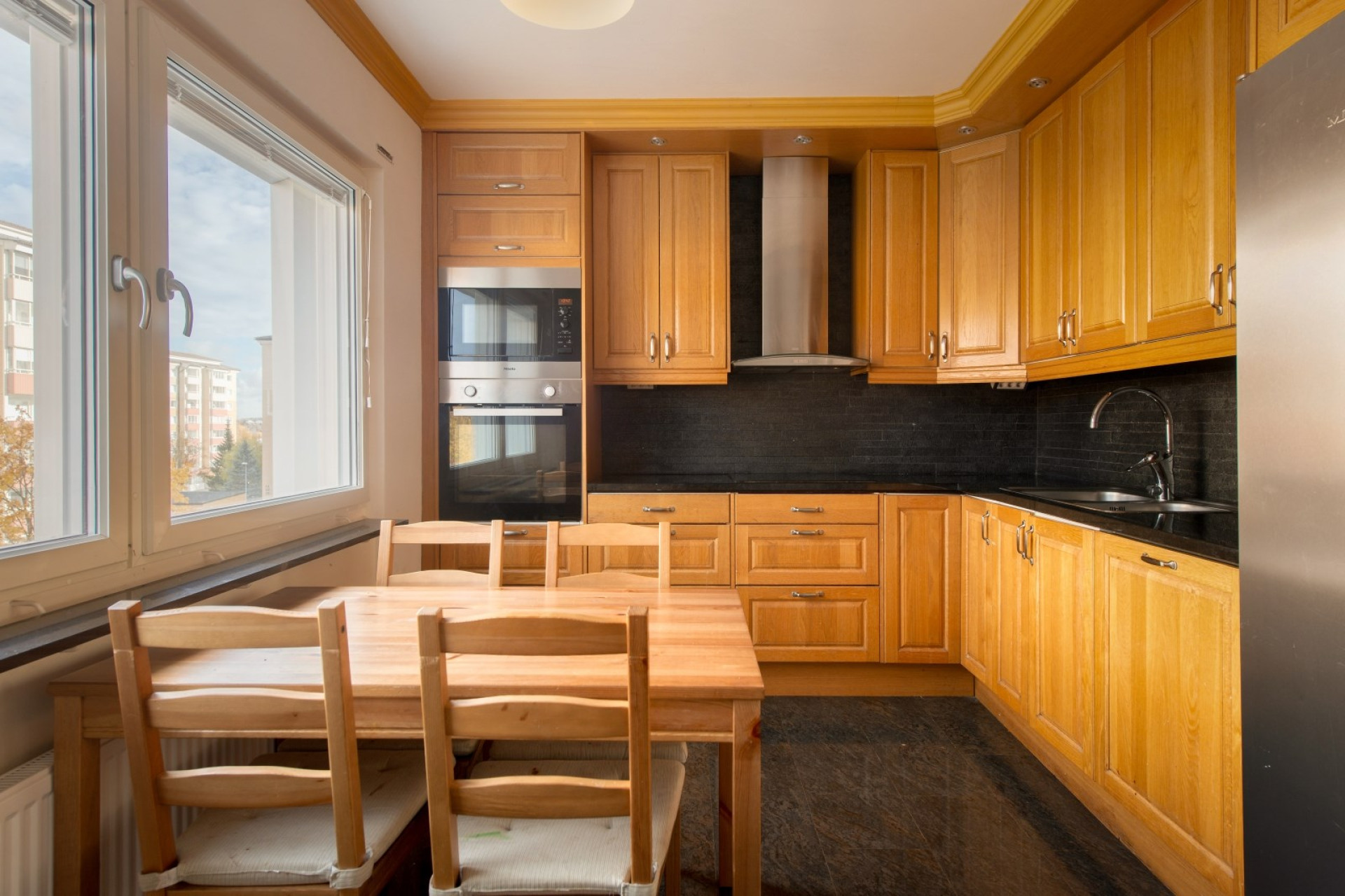Stilrent och fullutrustat kök med matplats invid fönstret. Här erbjuds gott om förvaring och mycket bra arbetsytor som underlättar matbestyren. Kökets maskinpark som består av: inbyggd micro, inbyggdugn, integrerad diskmaskin, induktionshäll, fläkt, kylskåp och frys. Här blir det ett nöje att laga mat och bjuda hem gäster på middag.
