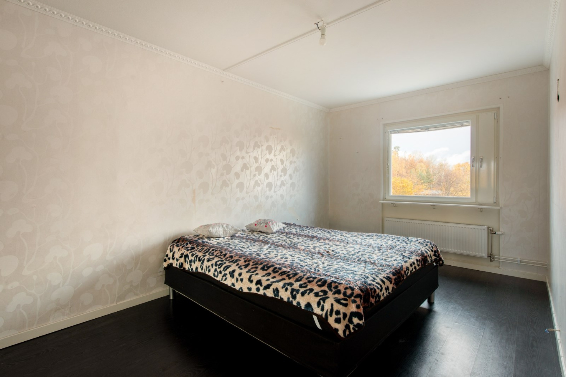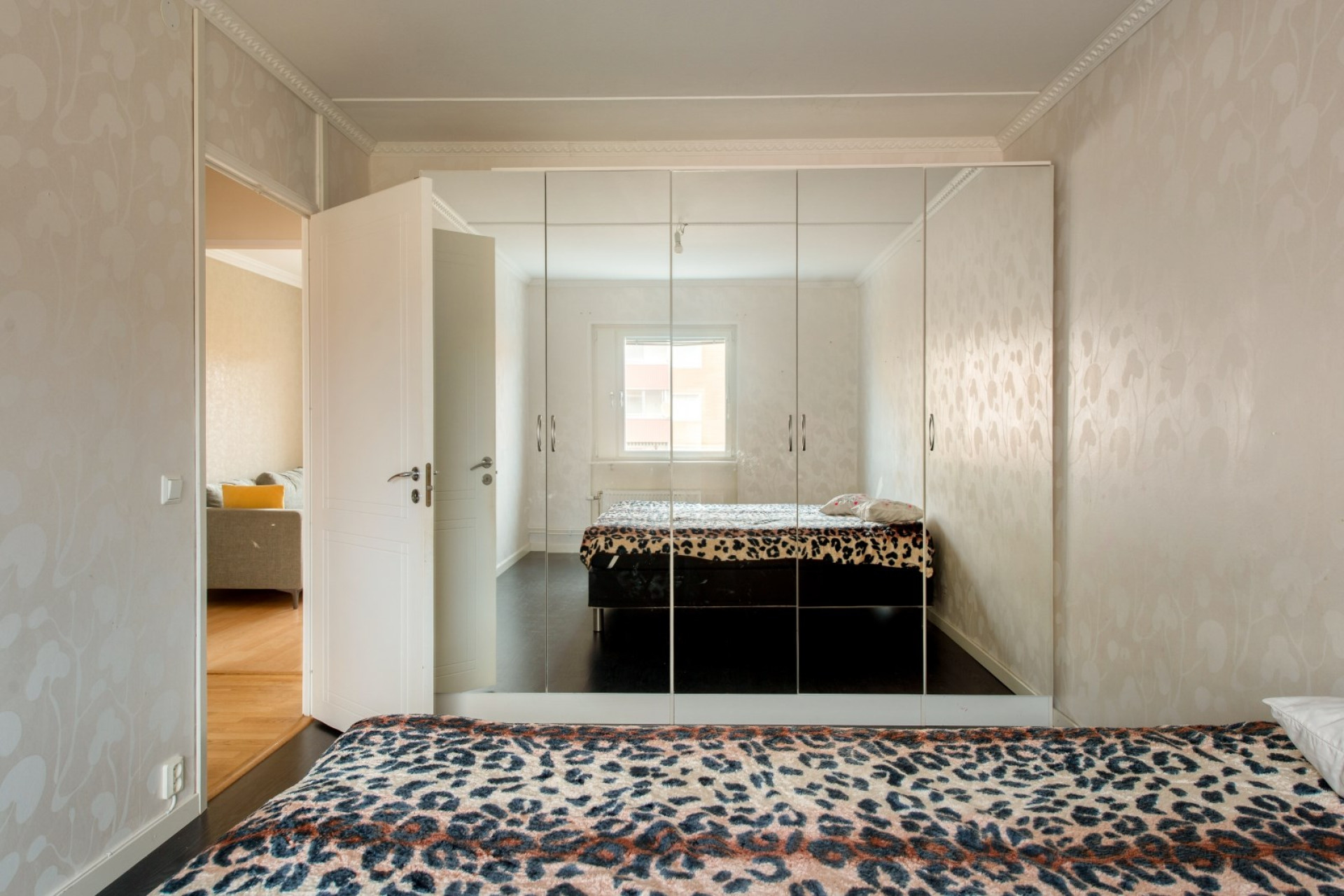 Stort sovrum med garderober och fönster. Här finns plats med sovrumsmöblemang såsom dubbelsäng och mer därtill.
