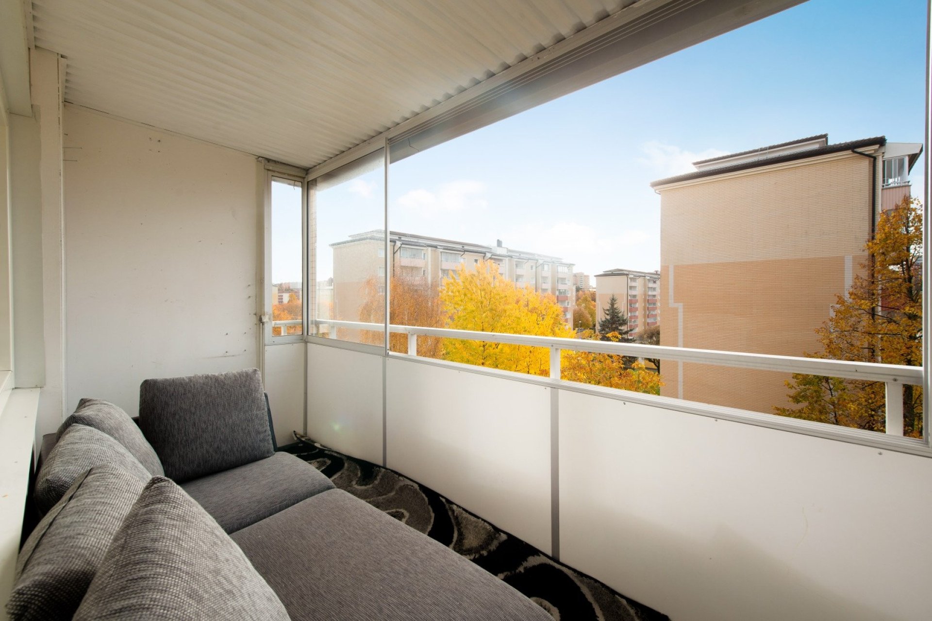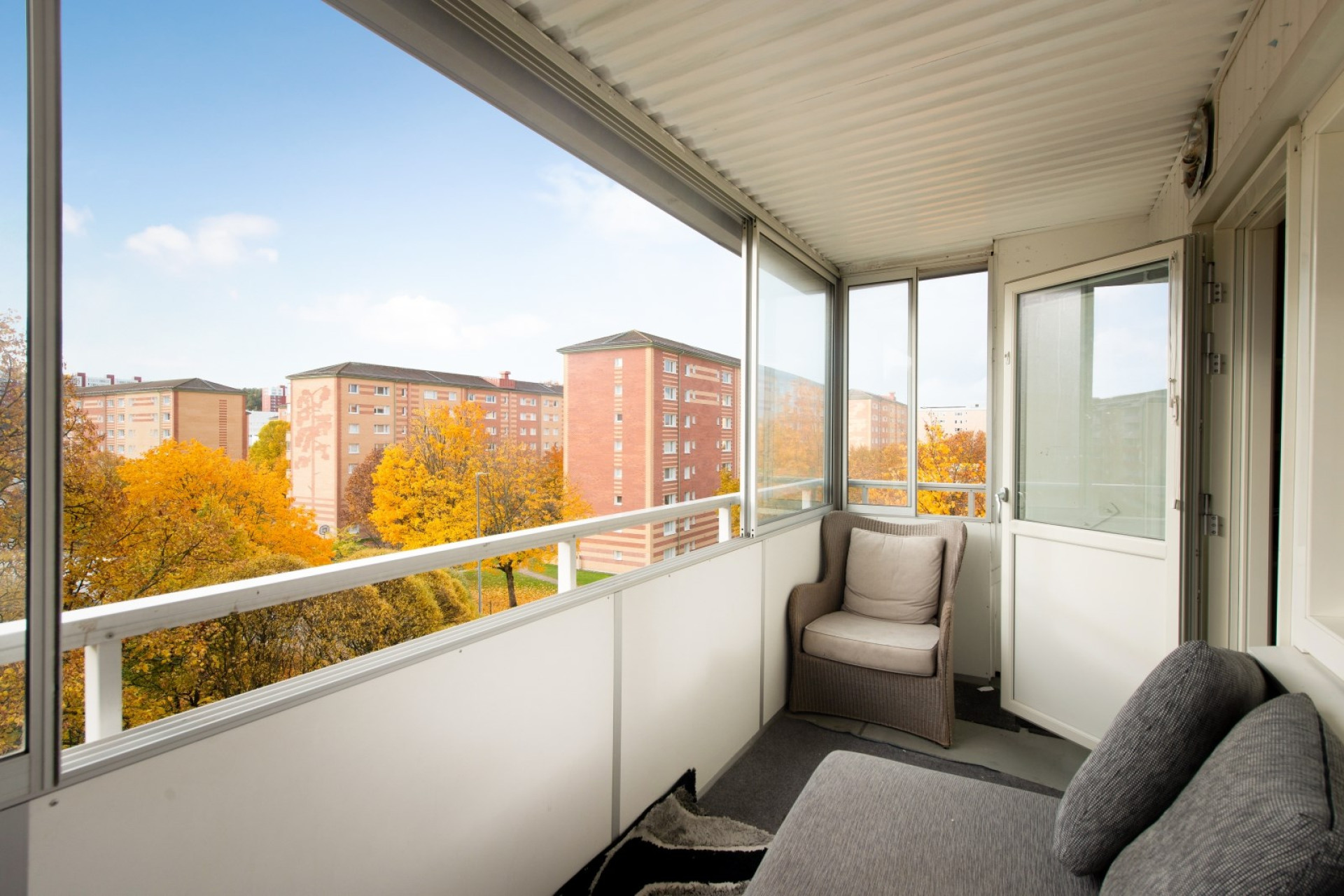 Stor inglasad balkong i soligt söderläge. Balkongen bjuder på gott om plats att möblera med utemöbler och blommor. Det här kan bli en riktigt mysig plats för avkoppling där de praktiska skjutbara glasdörrarna kan öppnas upp eller stängas till efter säsong. Inglasningen möjliggör också en utökad användning under året