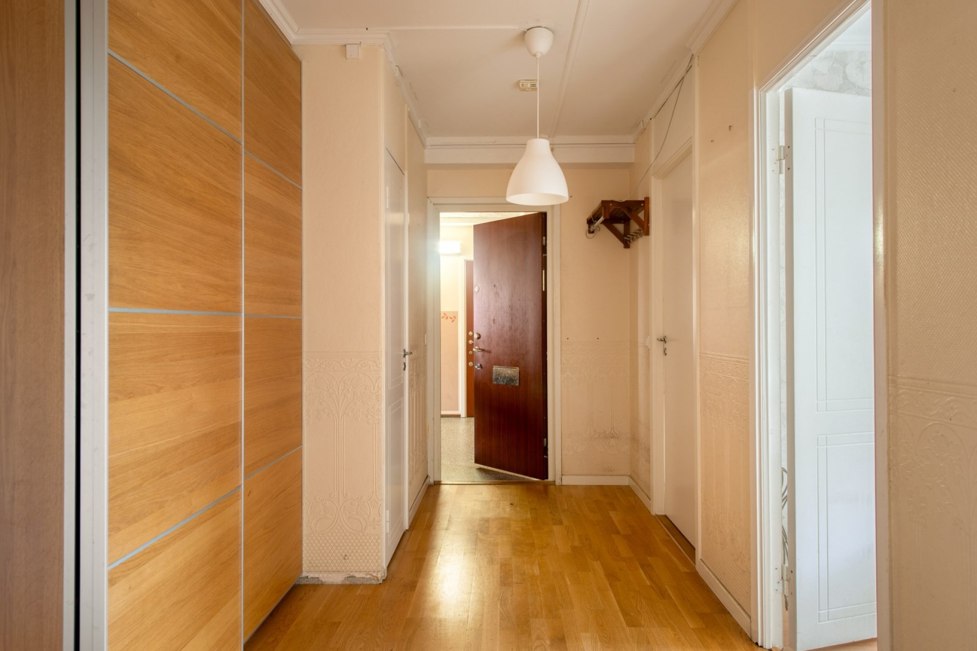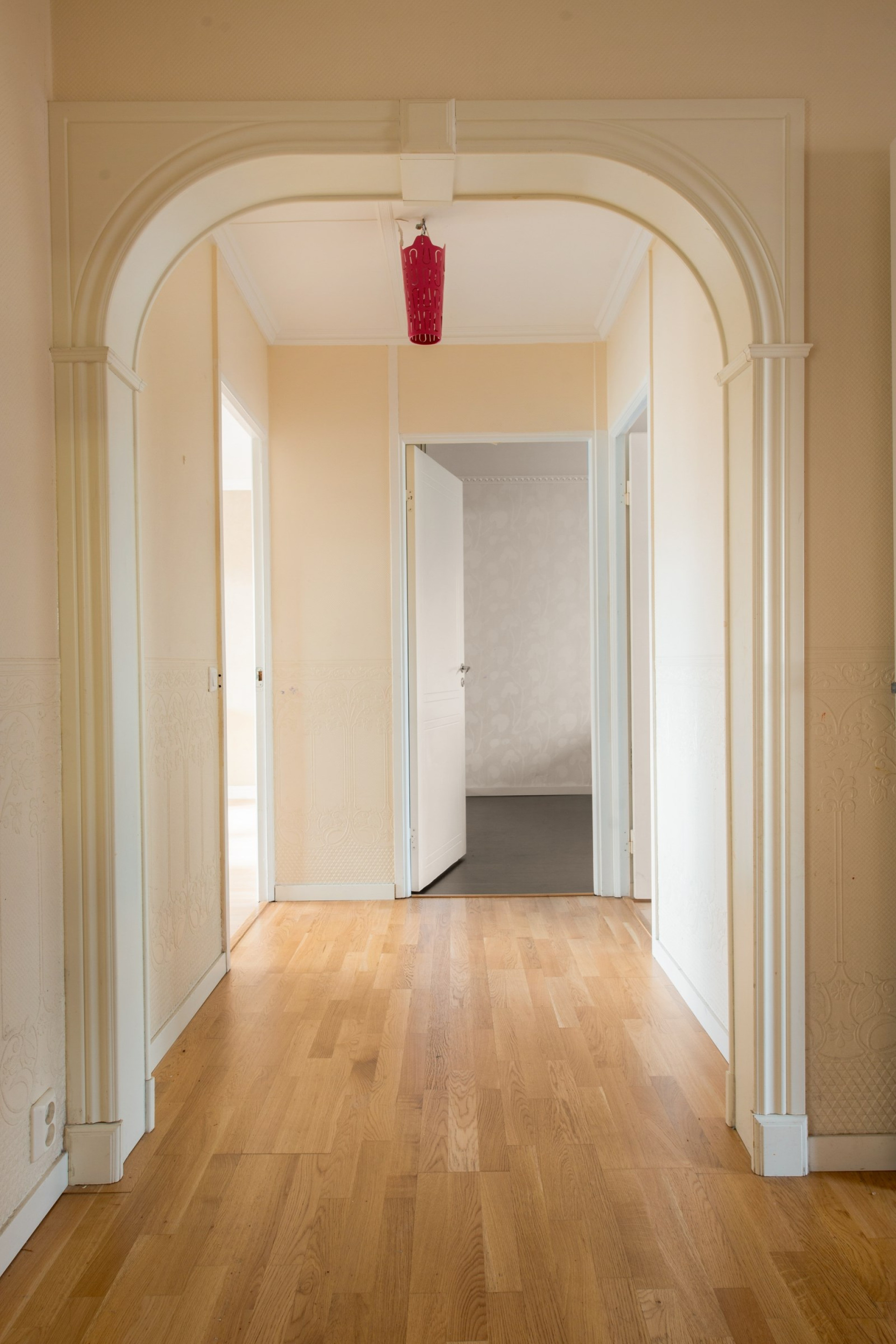 Välkomnande hall med garderober och hatthylla. Här finns plats för avhängning av ytterkläder och skor.