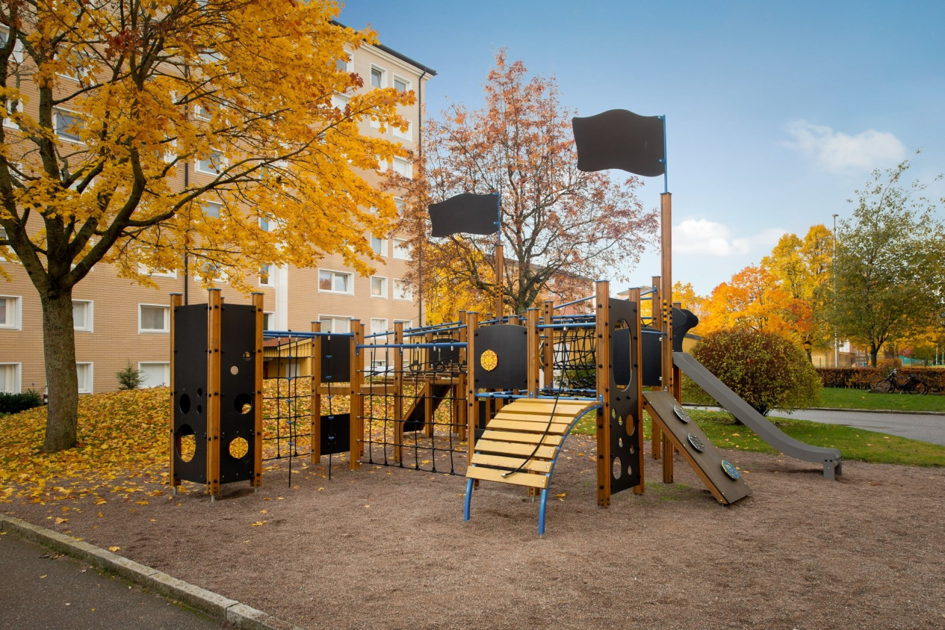 Det finns bastu, cykelförråd, fritidslokal, förråd och tvättstuga i angränsande fastighet.
