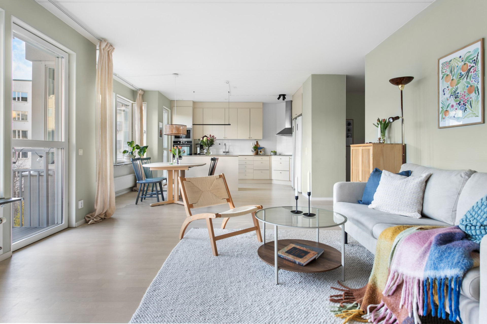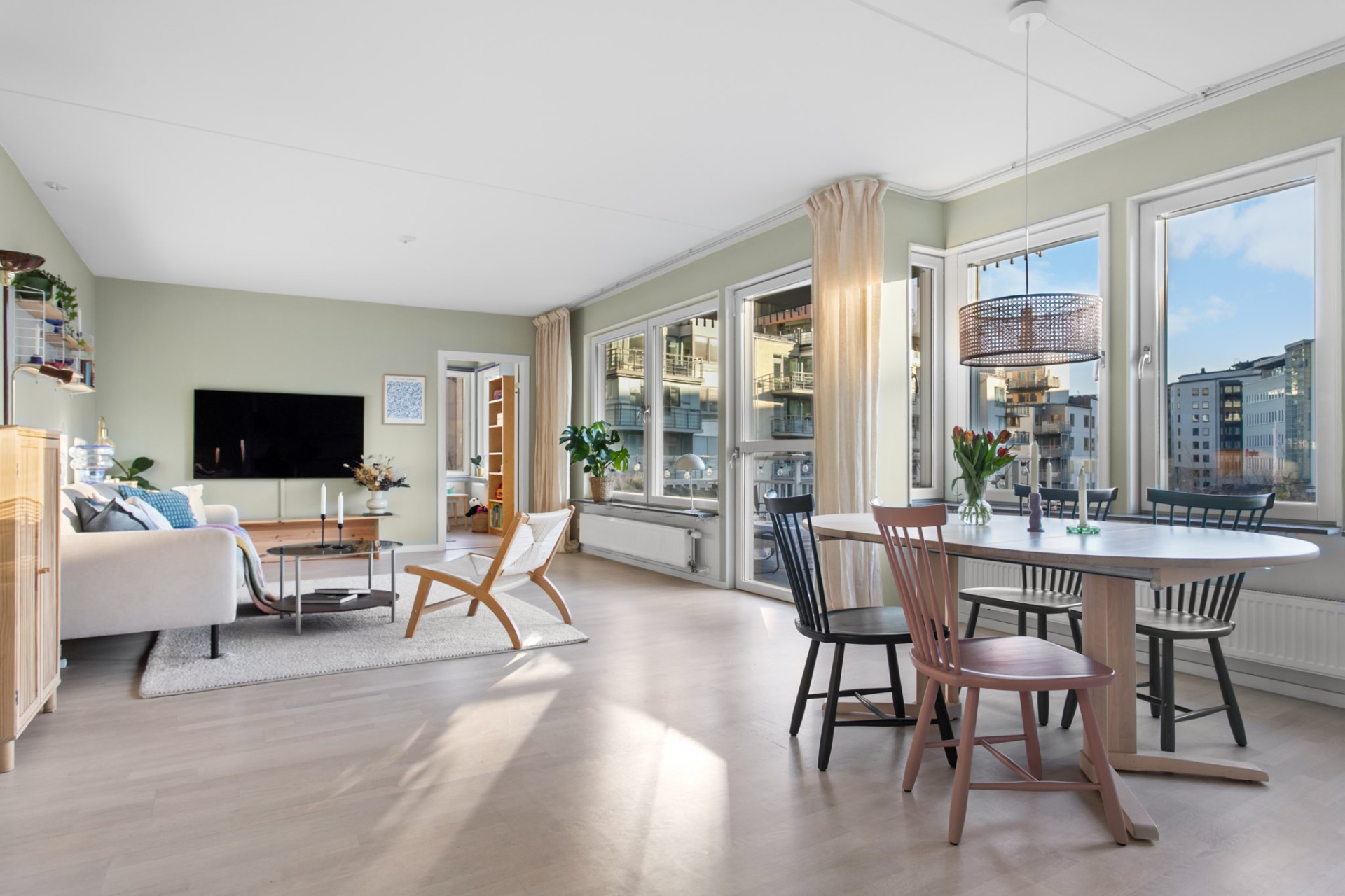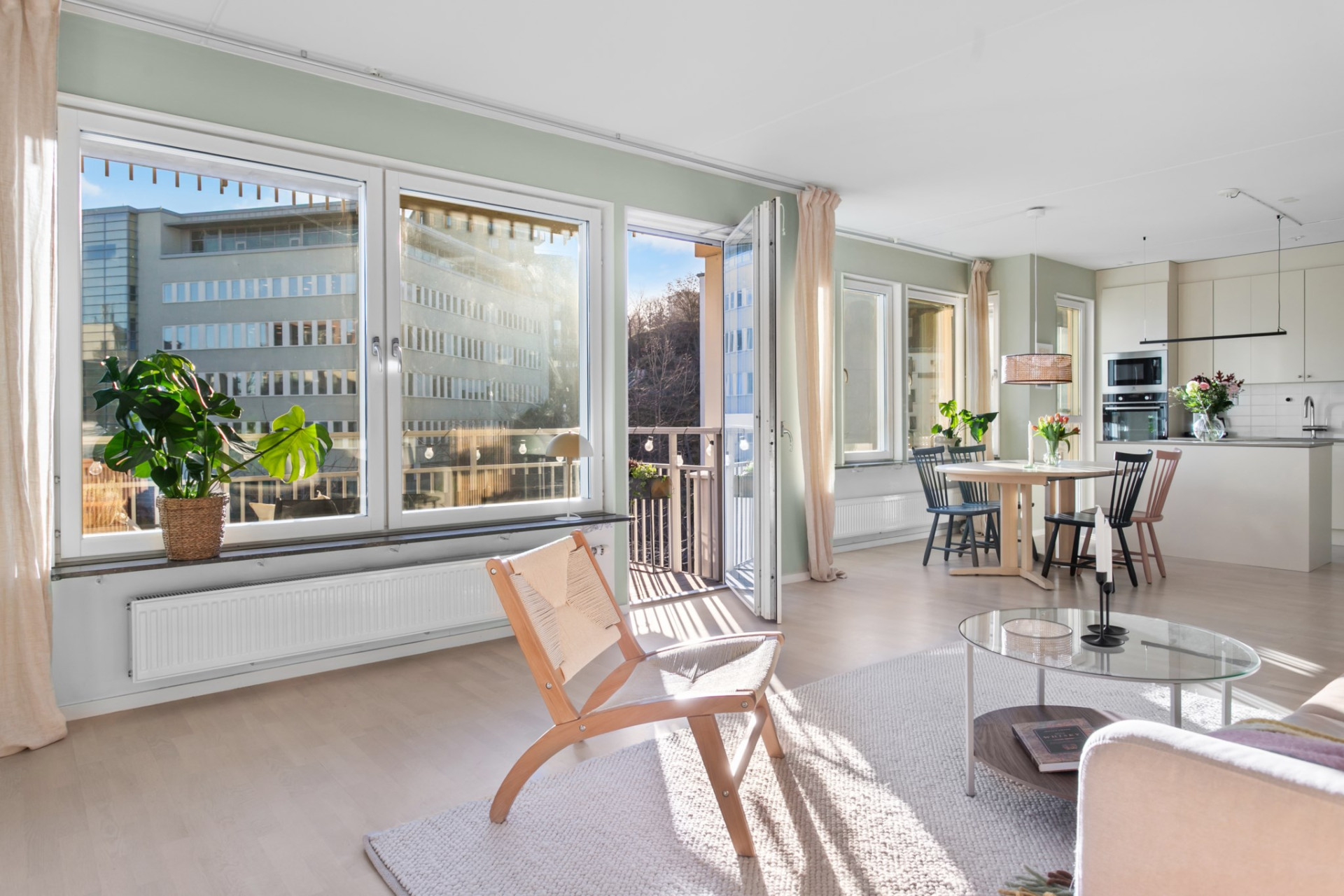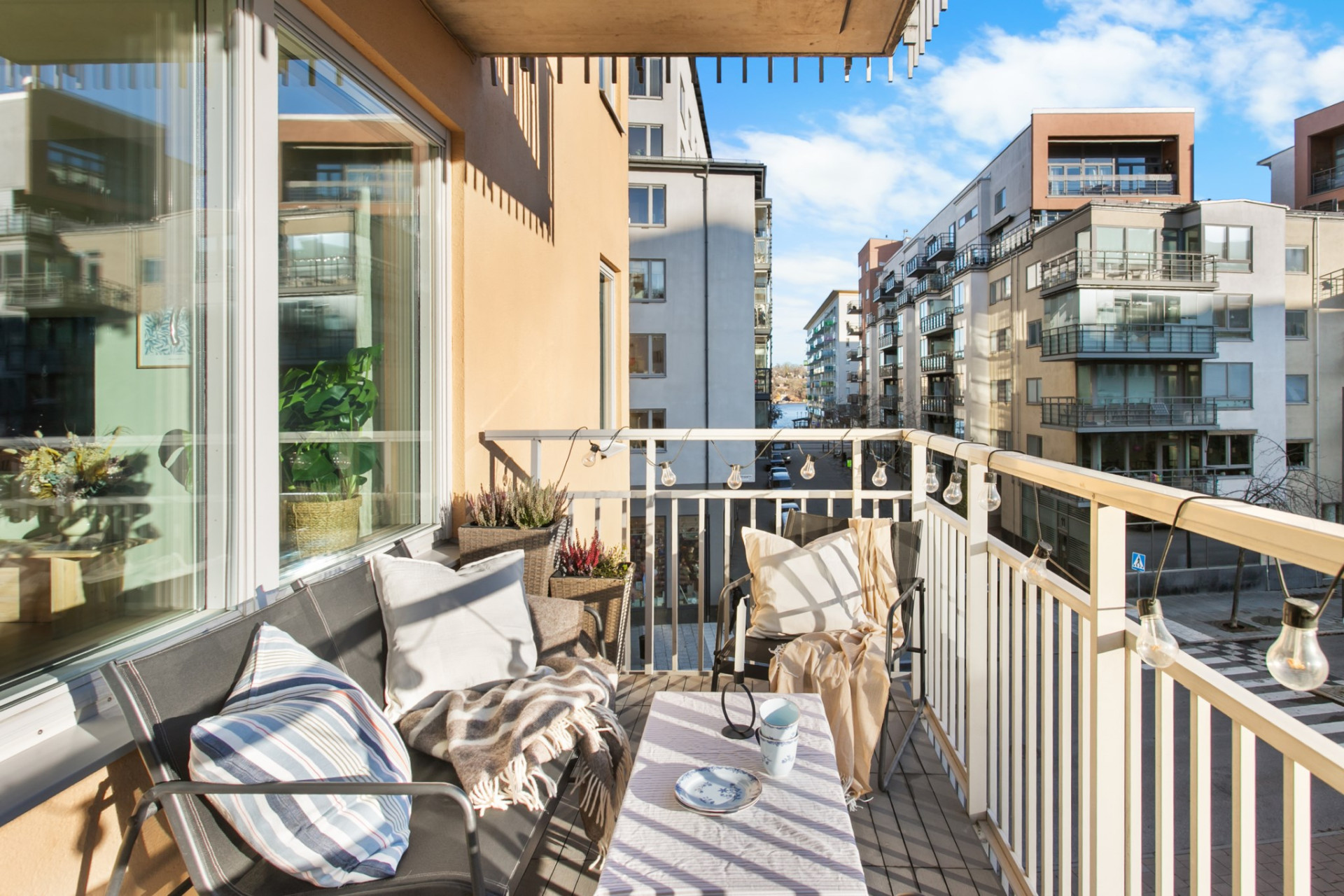Ljus, renoverad trea med vitbehandlade golv, stort master bedroom, solig balkong och rofylld parkutsikt vid Liljeholmskajen. Välkommen!