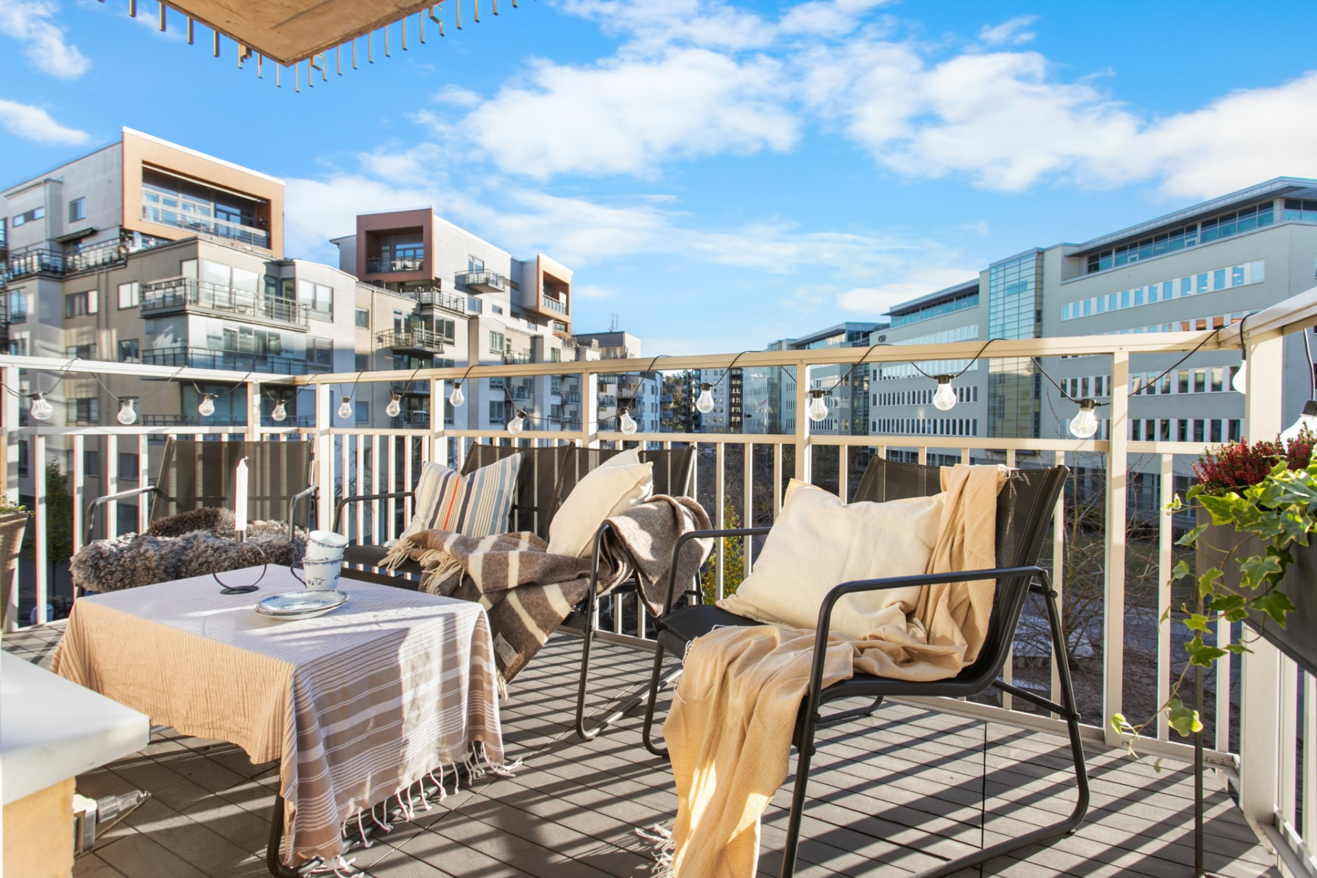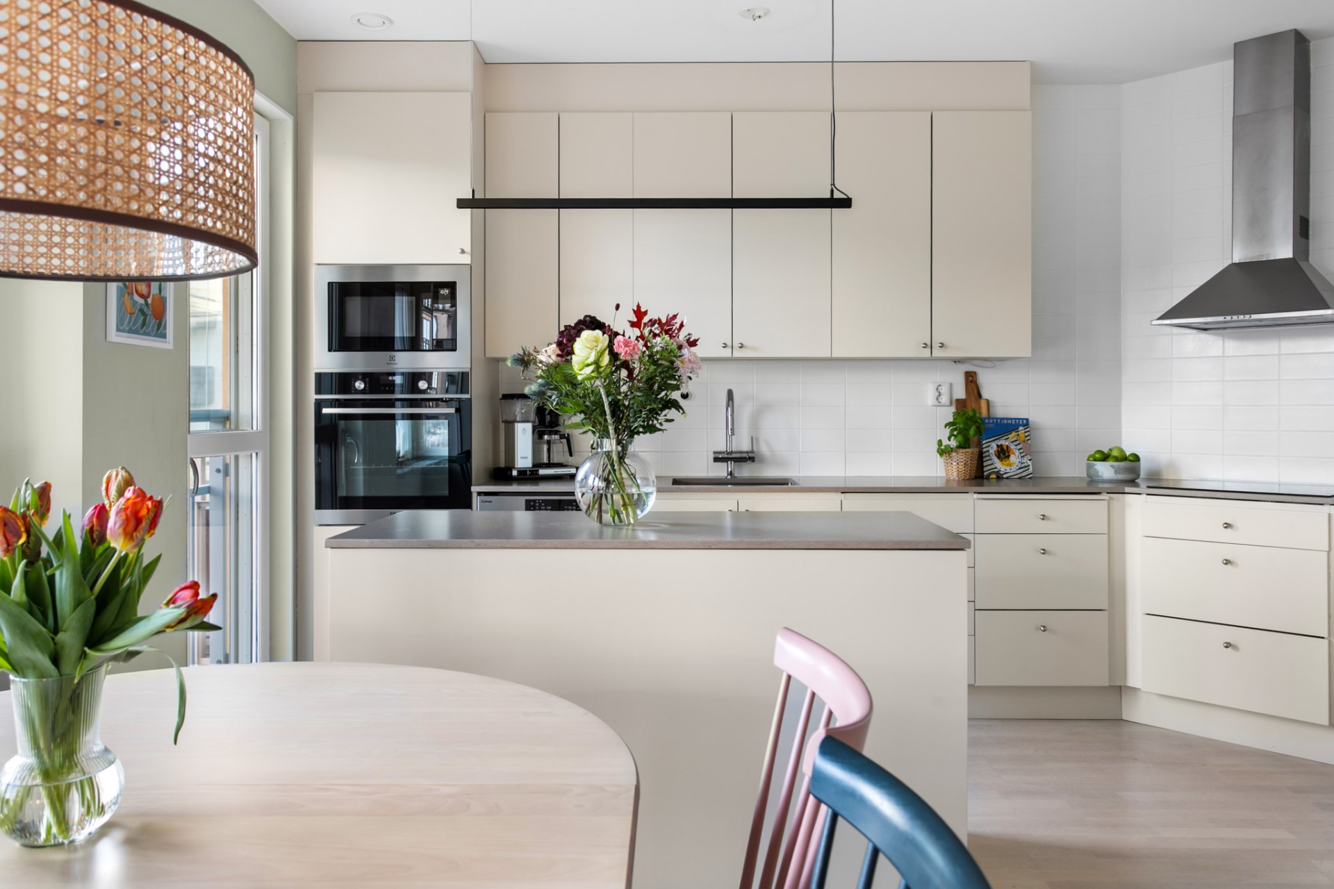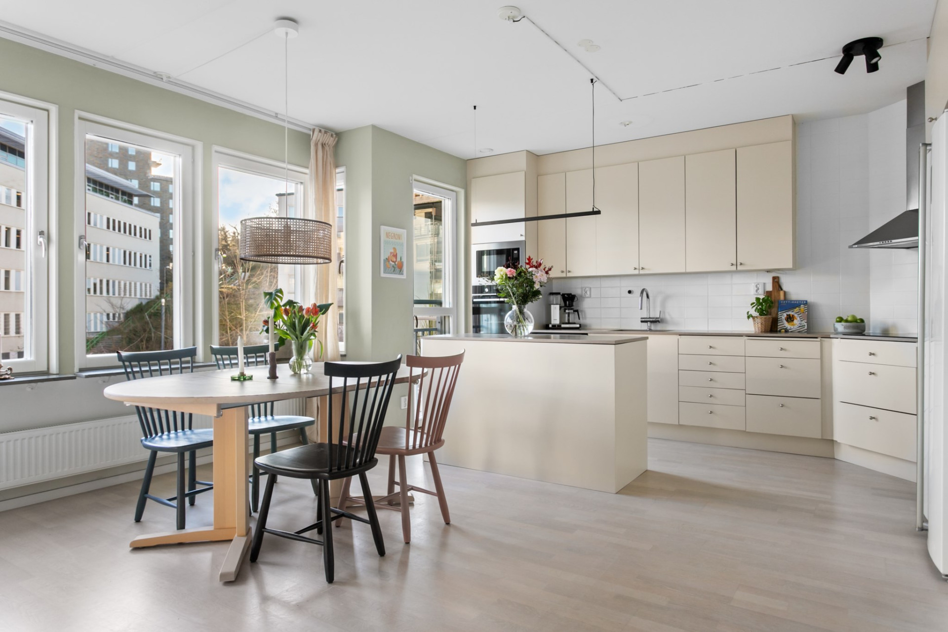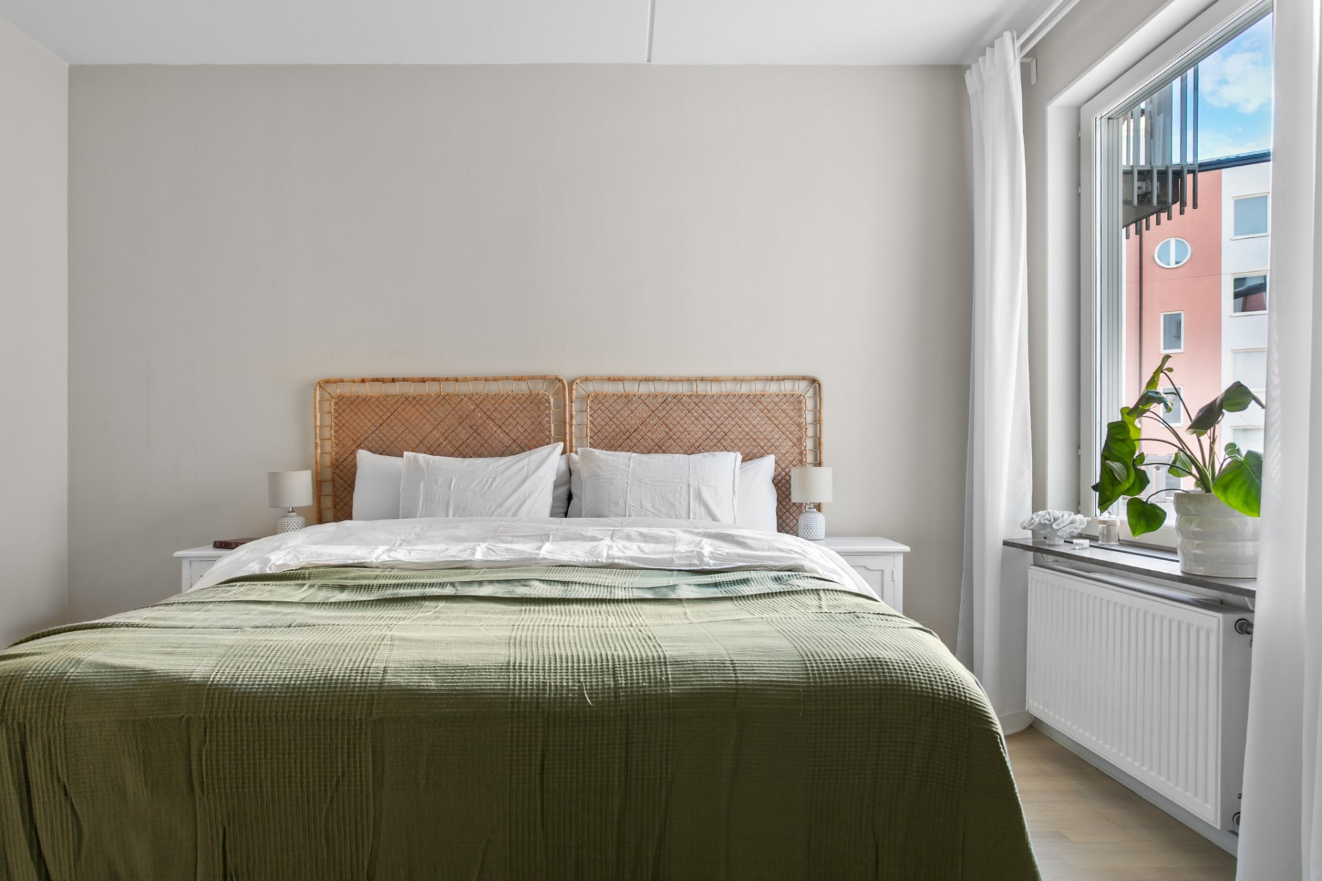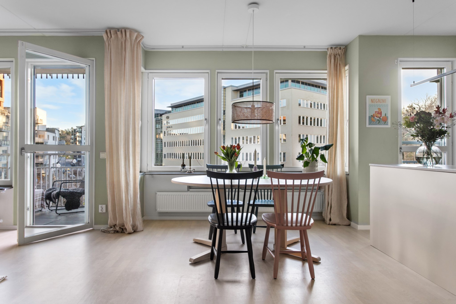 Ljus, renoverad trea med vitbehandlade golv, stort master bedroom, solig balkong och rofylld parkutsikt vid Liljeholmskajen. Välkommen!