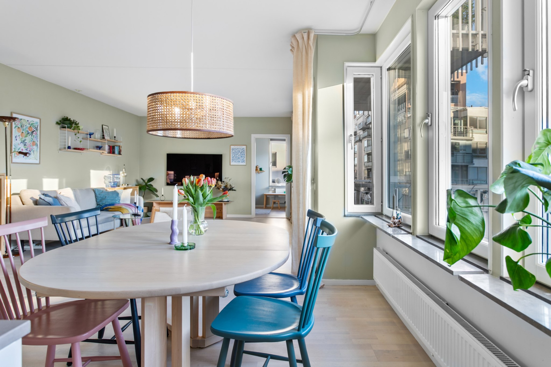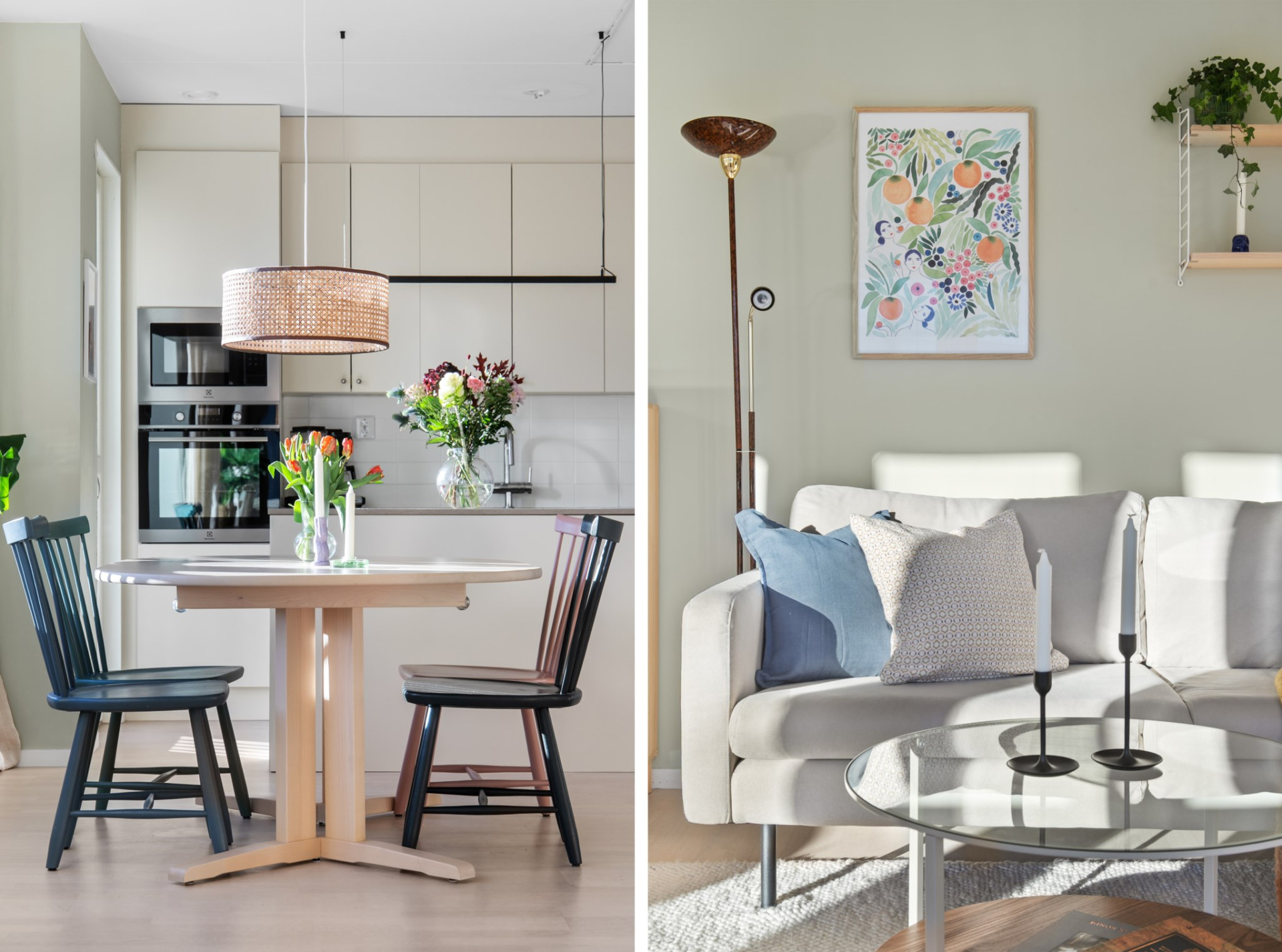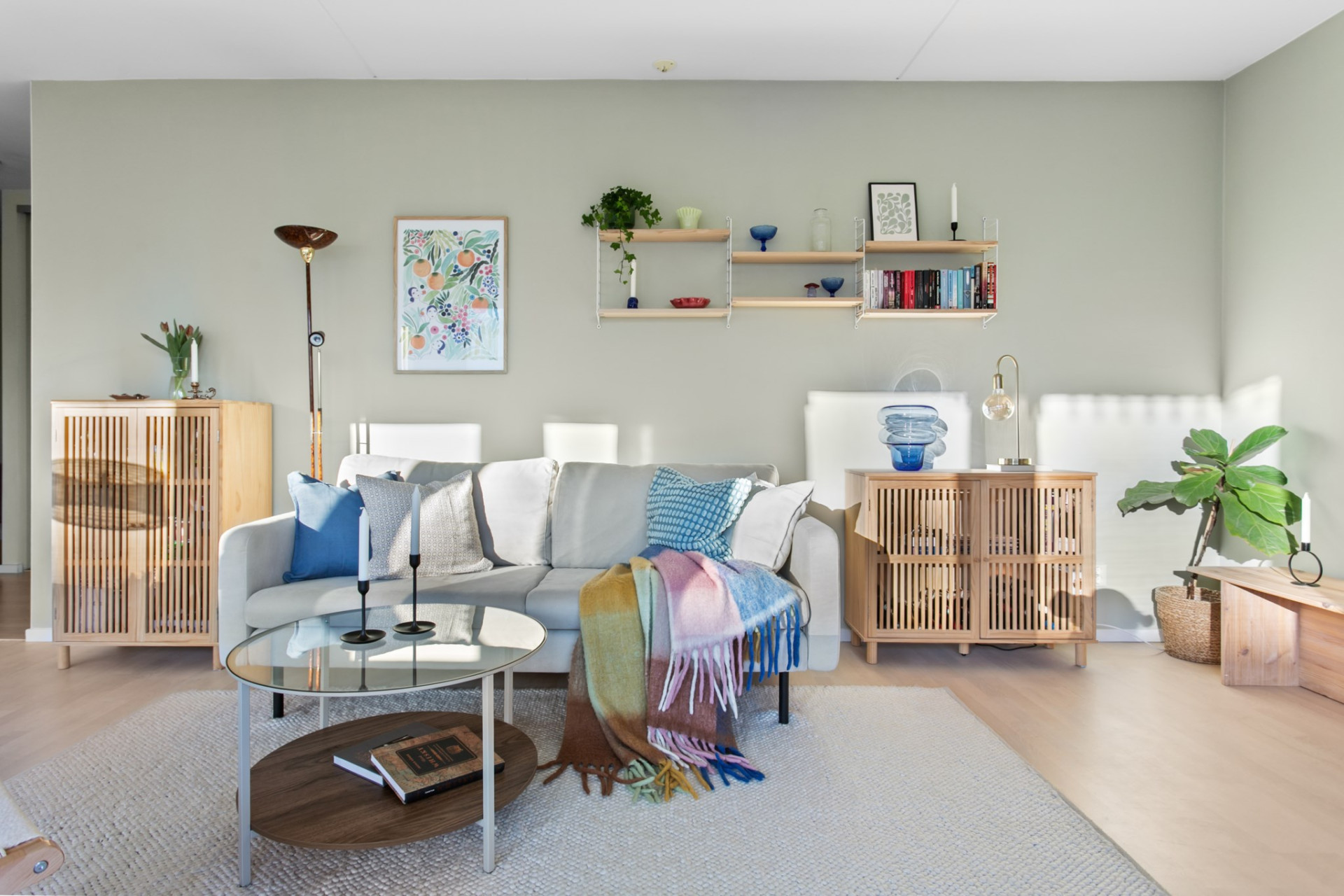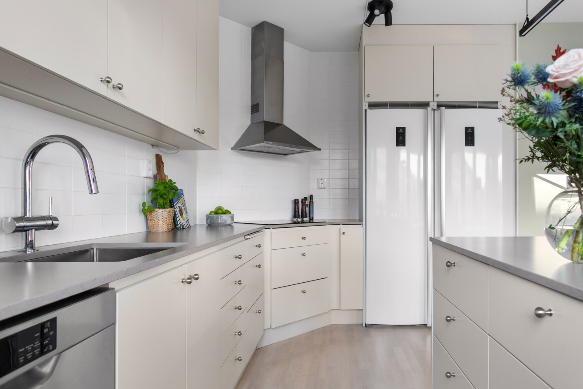 Ljus, renoverad trea med vitbehandlade golv, stort master bedroom, solig balkong och rofylld parkutsikt vid Liljeholmskajen. Välkommen!