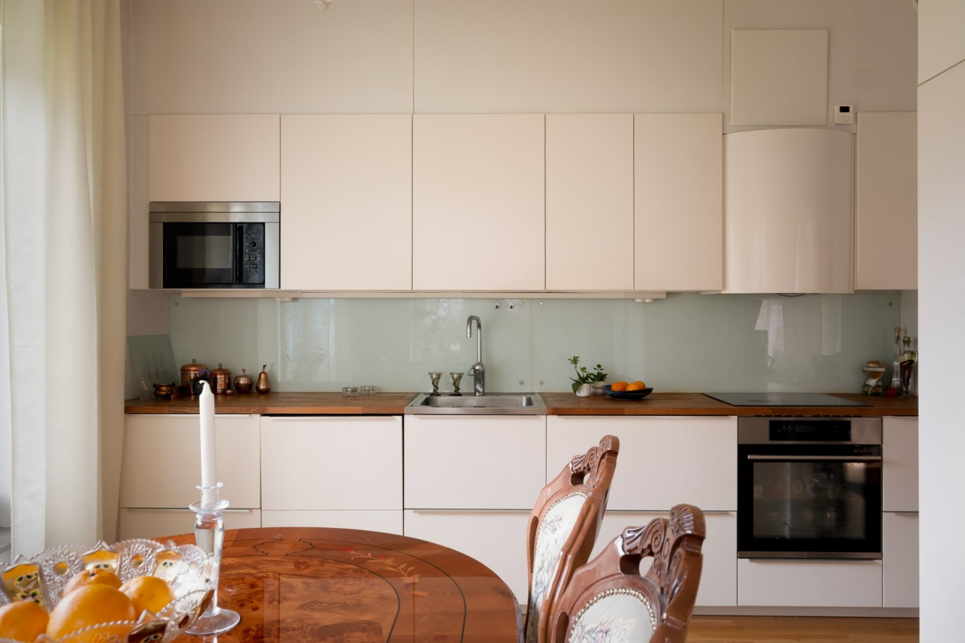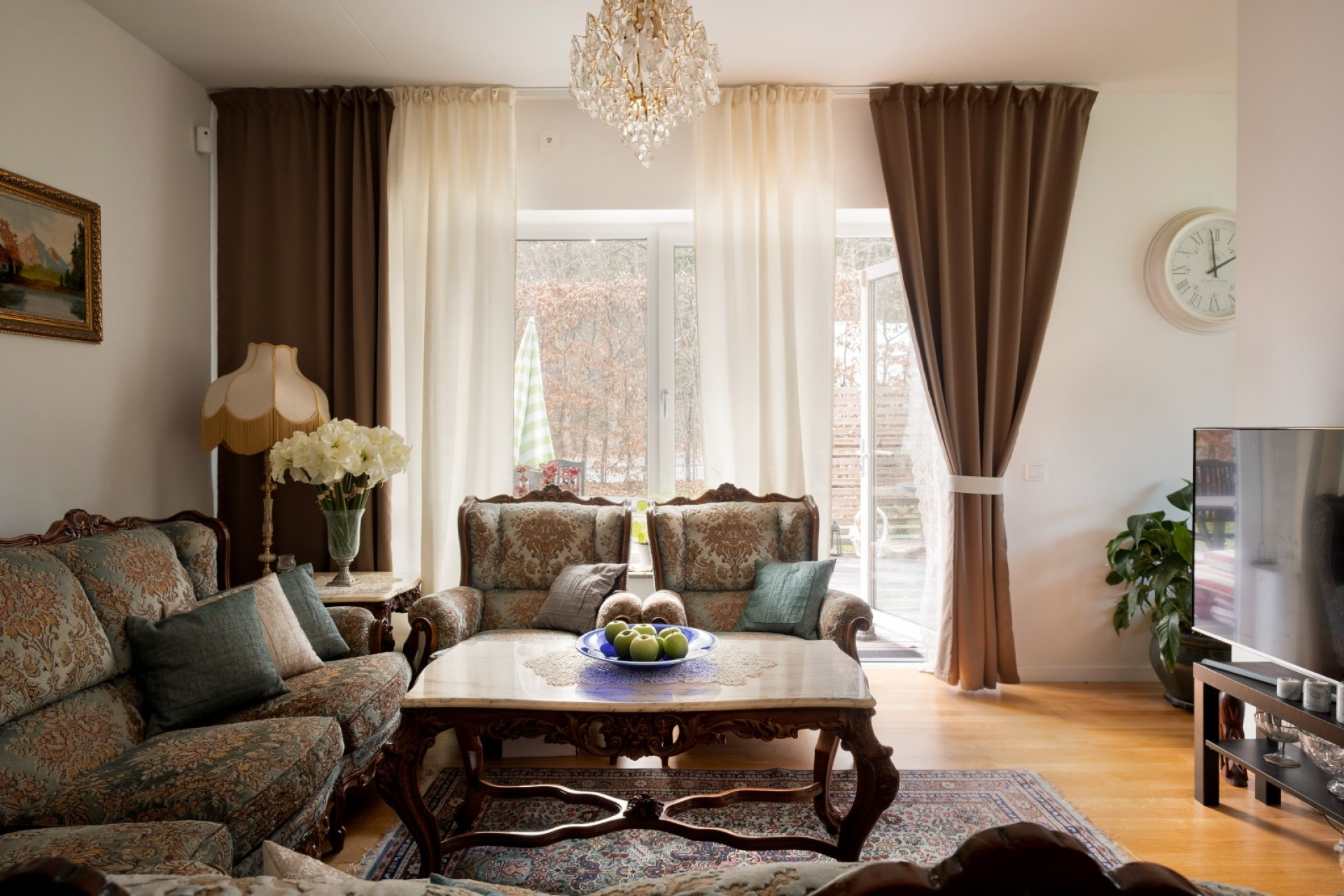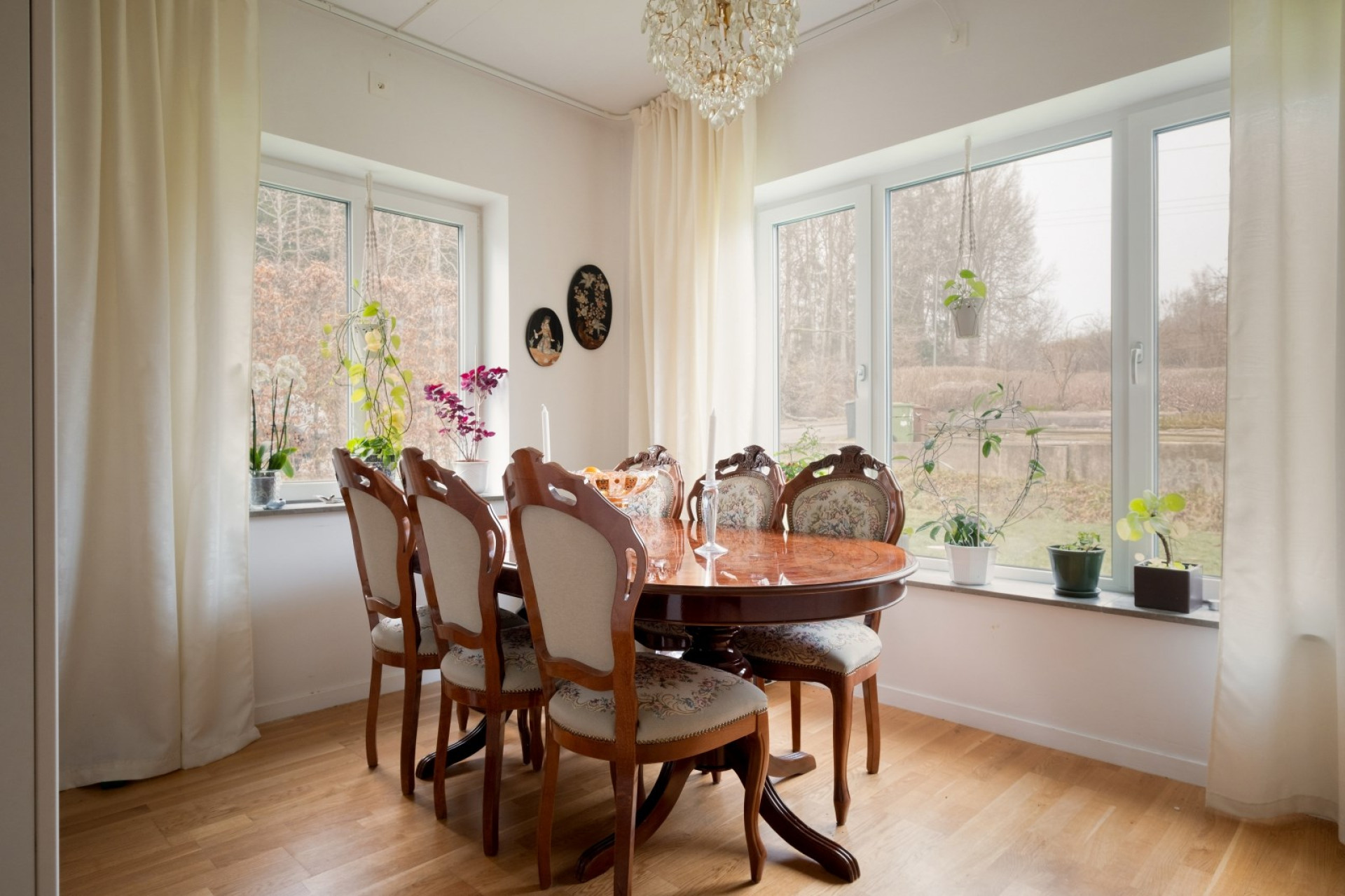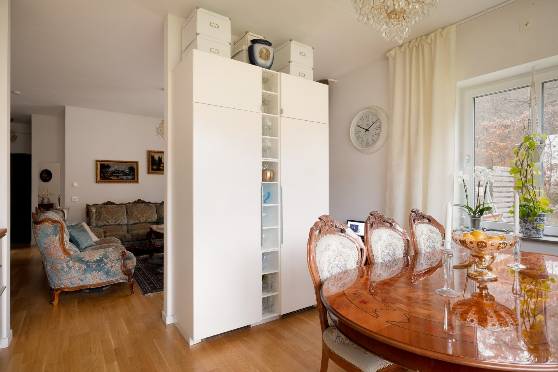 Den öppna planlösningen mellan kök och vardagsrum skapar en social och ljus miljö där både vardag och fest får ta plats. Stora fönster skänker rikligt med naturligt ljus och bidrar till den inbjudande atmosfären.