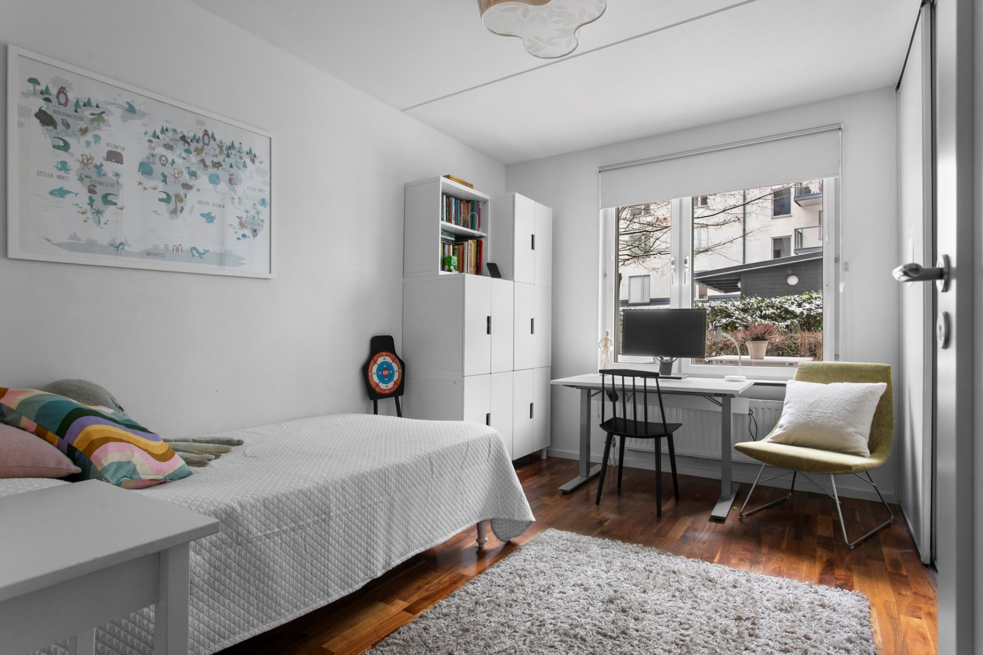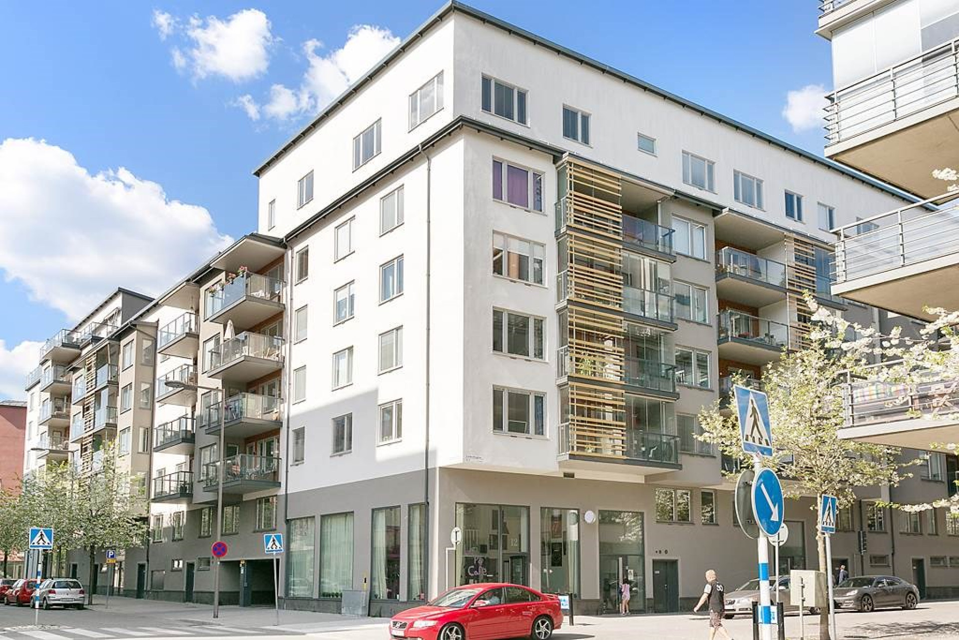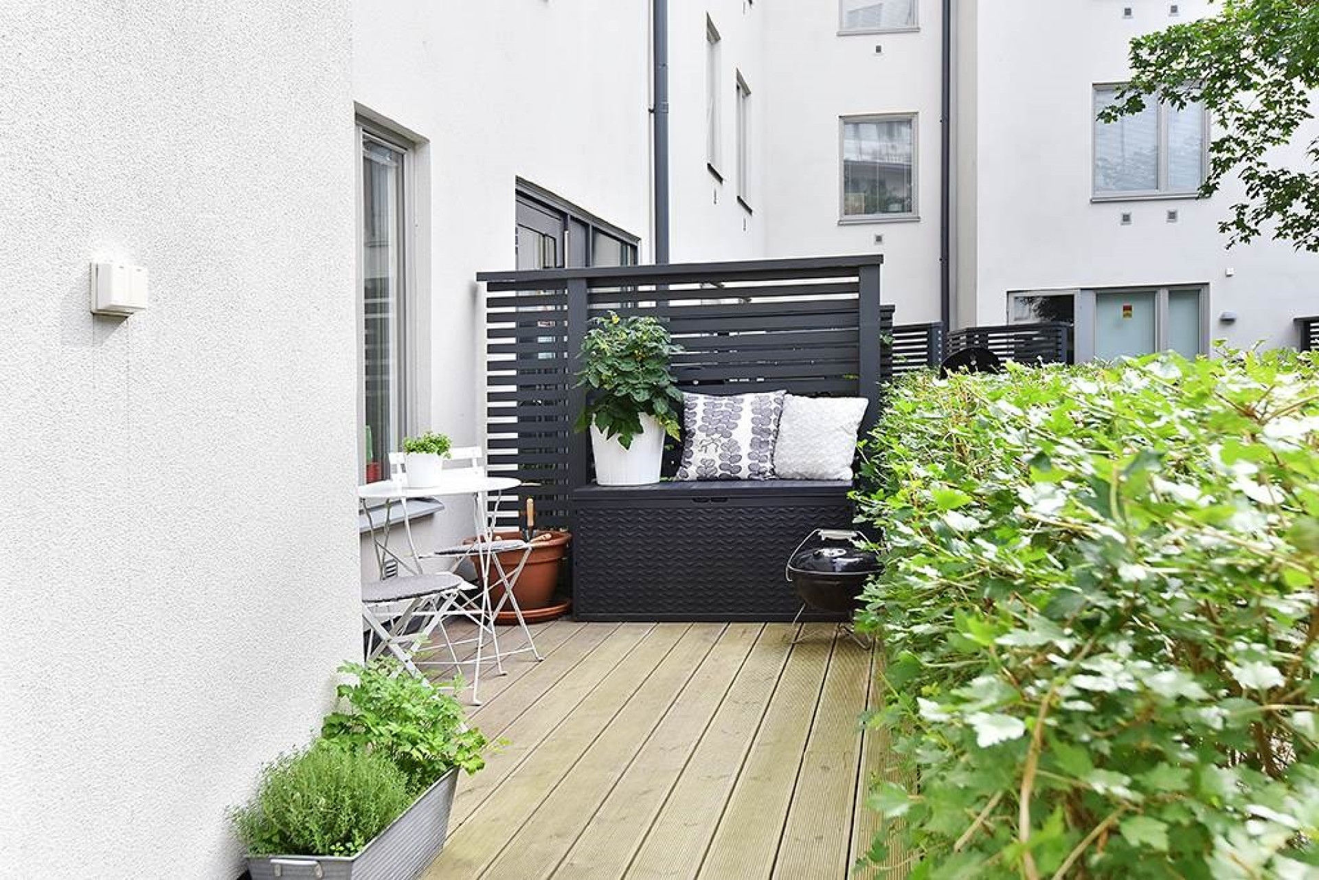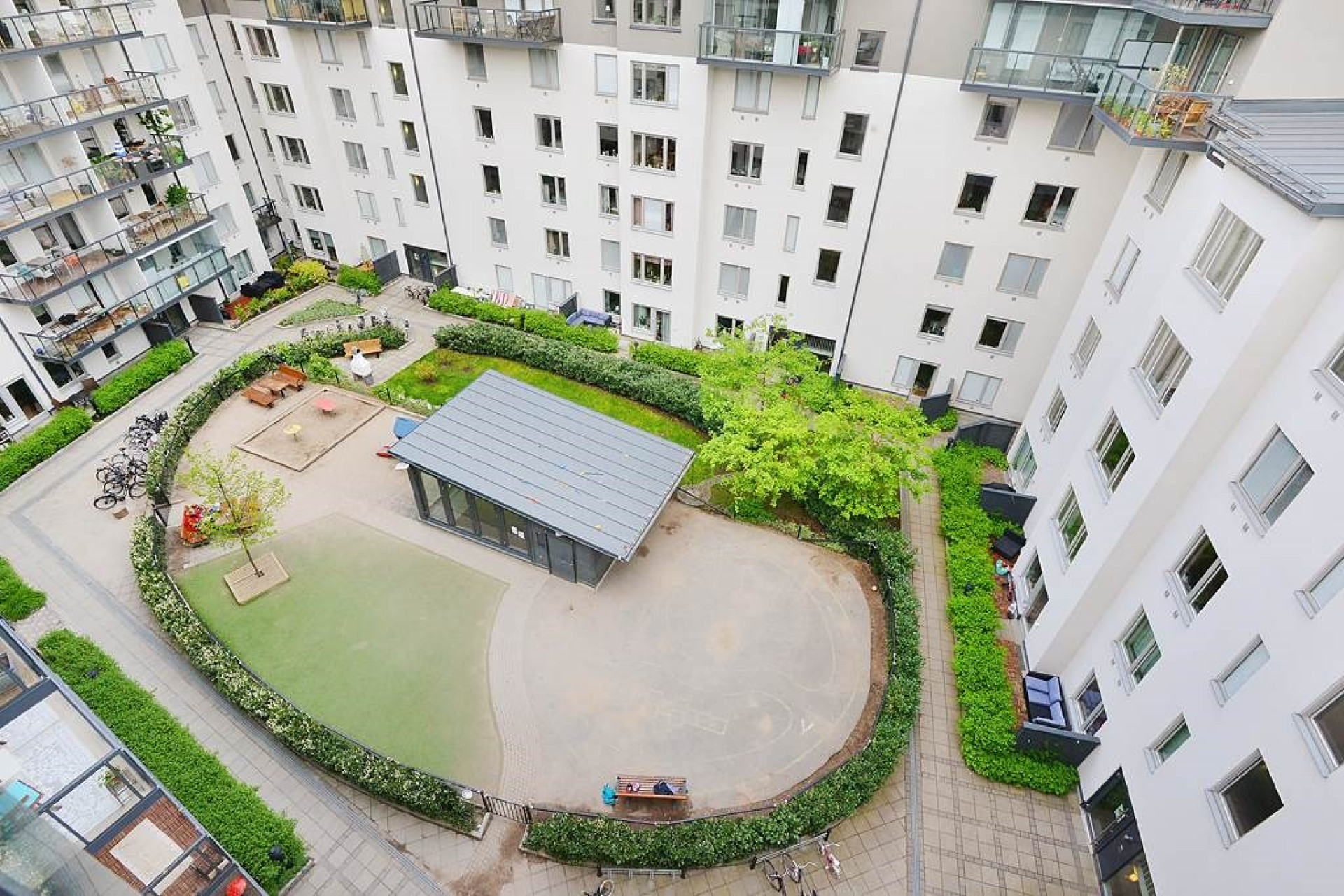 Den stora uteplatsen med trätrall, västläge och utsikt mot den lugna, lummiga innergården skapar en privat utomhusyta som är ovanligt generös för lägenhetsboende. Här kan man öppna dörren och låta barnen springa ut direkt på gården, fika i solen eller njuta av sena sommarkvällar. Uteplatsen fungerar året runt och blir ett naturligt extra rum, precis som i ett modernt radhus. Uteplatsen har eftermiddagssol.