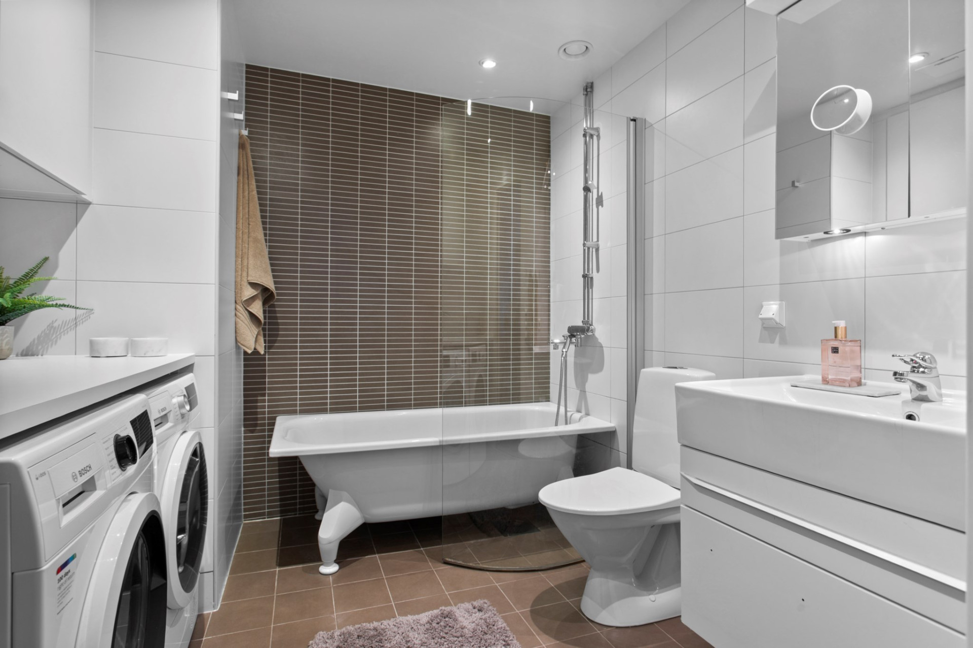 Ett stort och helkaklat badrum en suite till det största sovrummet. Här finner ni badkar , kommod, spegelskåp, tvättmaskin, torktumlare samt praktiska arbetsytor och förvaring. Vitt kakel kombineras med mörkt klinkergolv och golvvärme, ett rum med påtaglig spa-känsla.