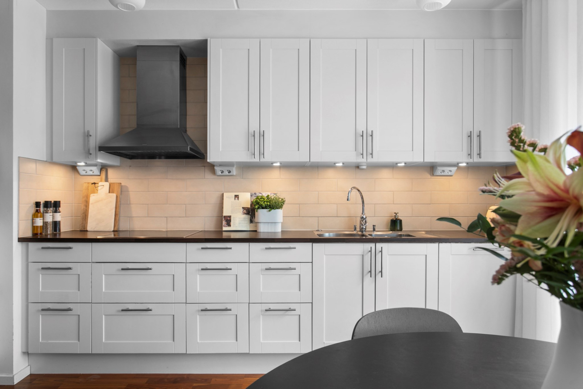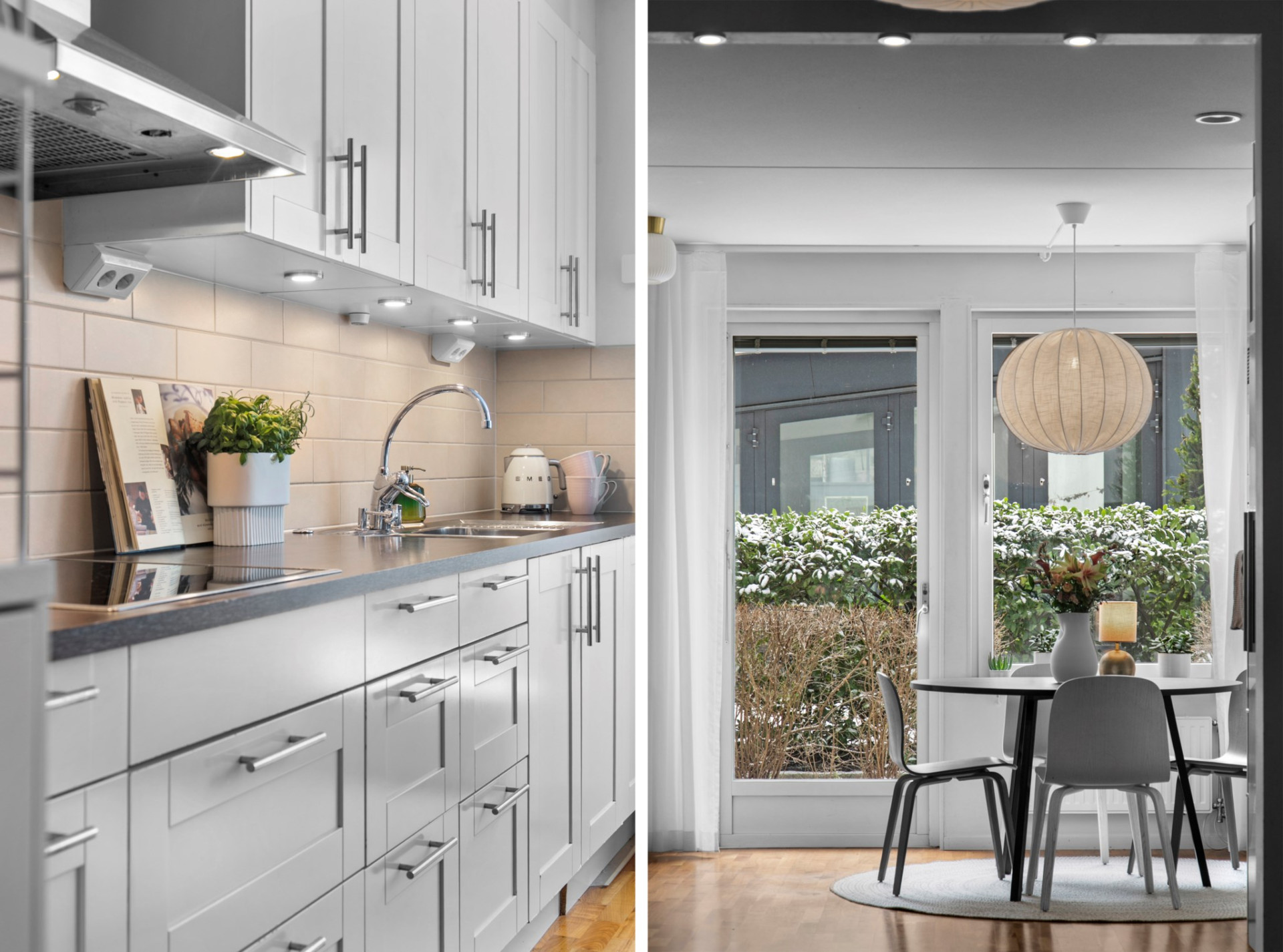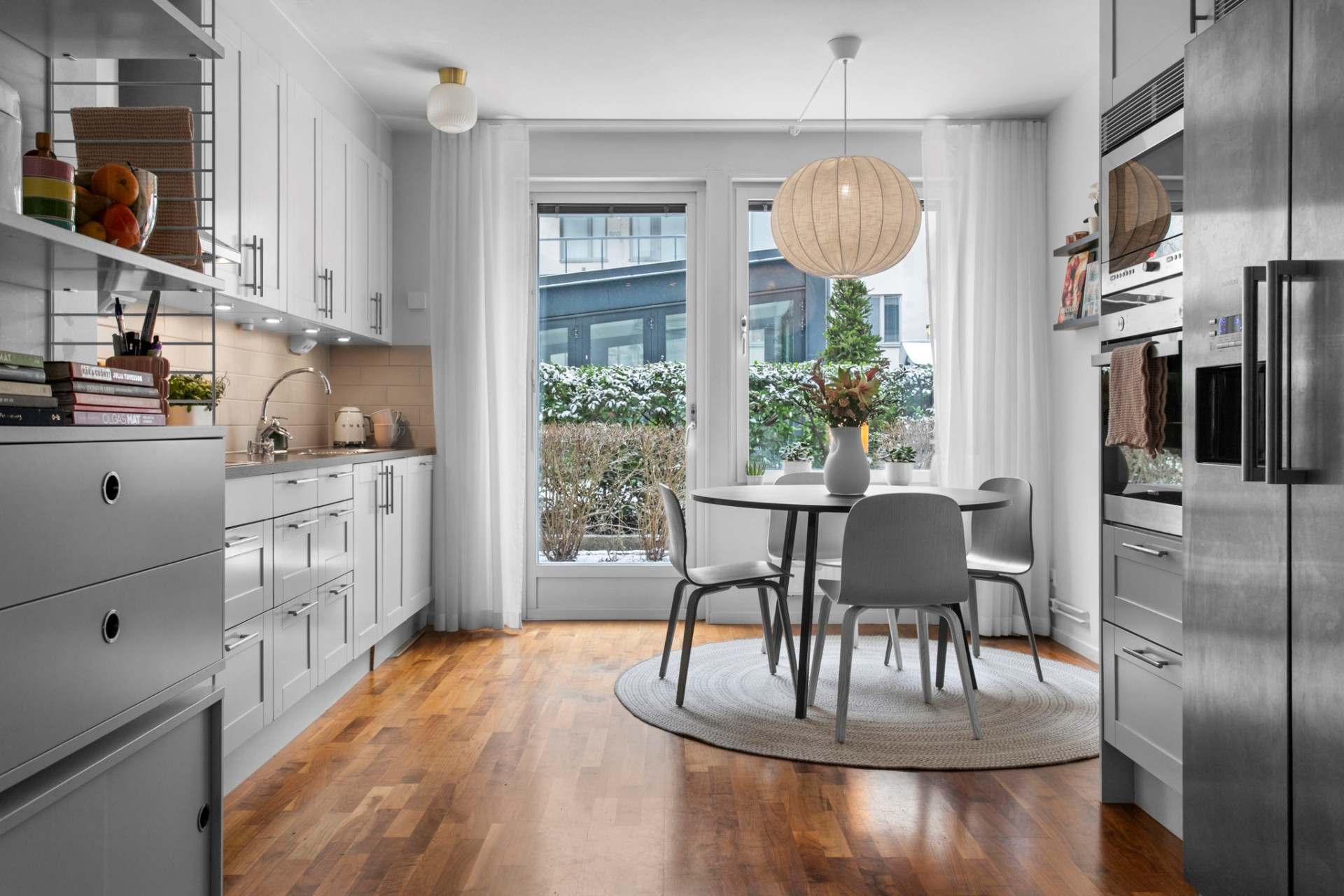 Här finns gott om plats för ett rymligt matbord vid fönsterpartiet som vetter ut mot uteplatsen, vilket skapar en känsla av att köket fortsätter ut i det fria, precis som i ett radhus.