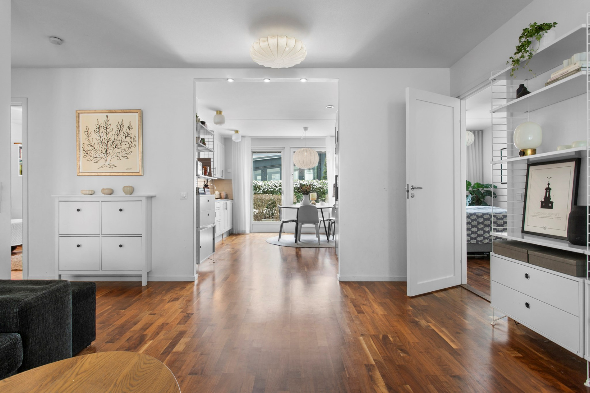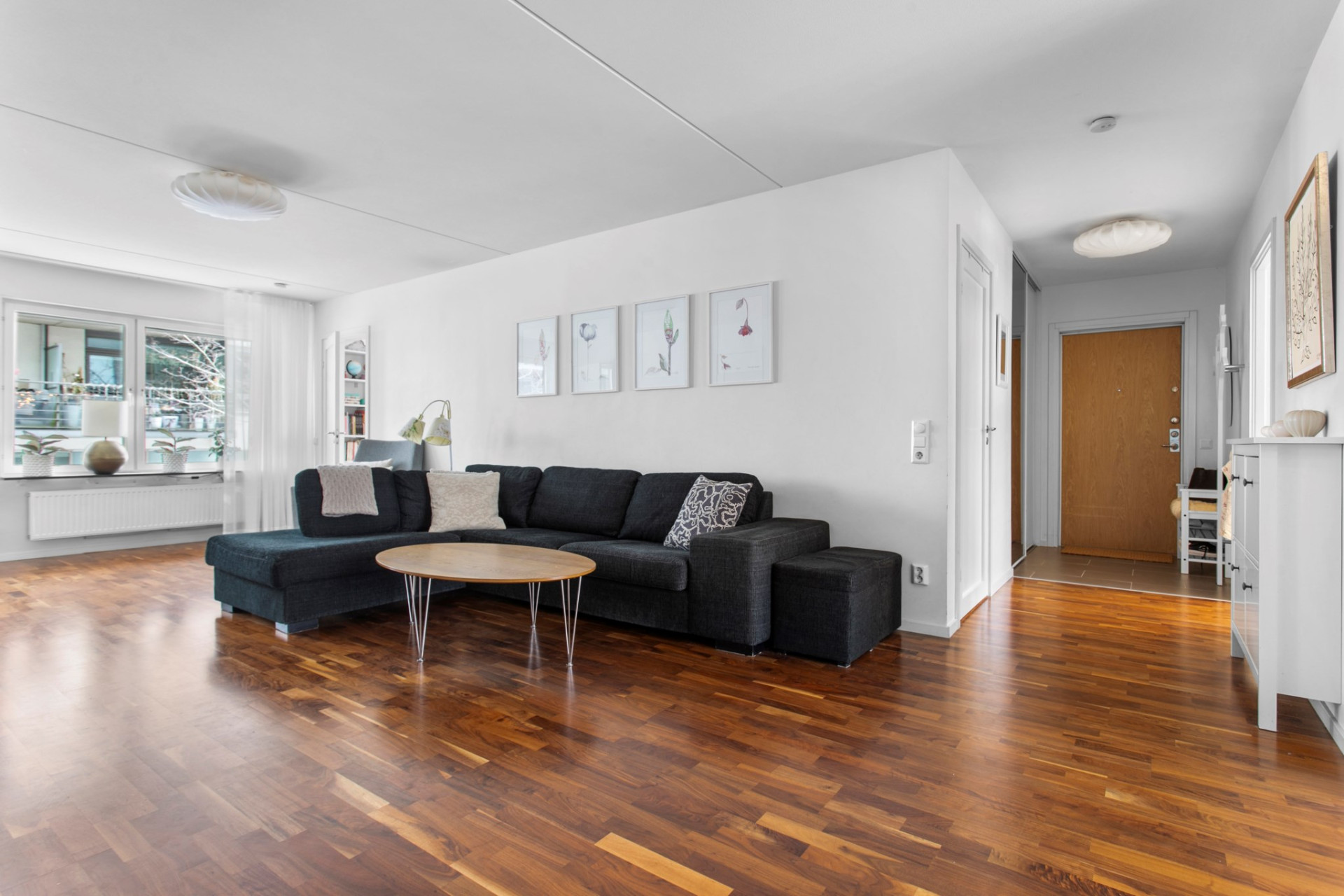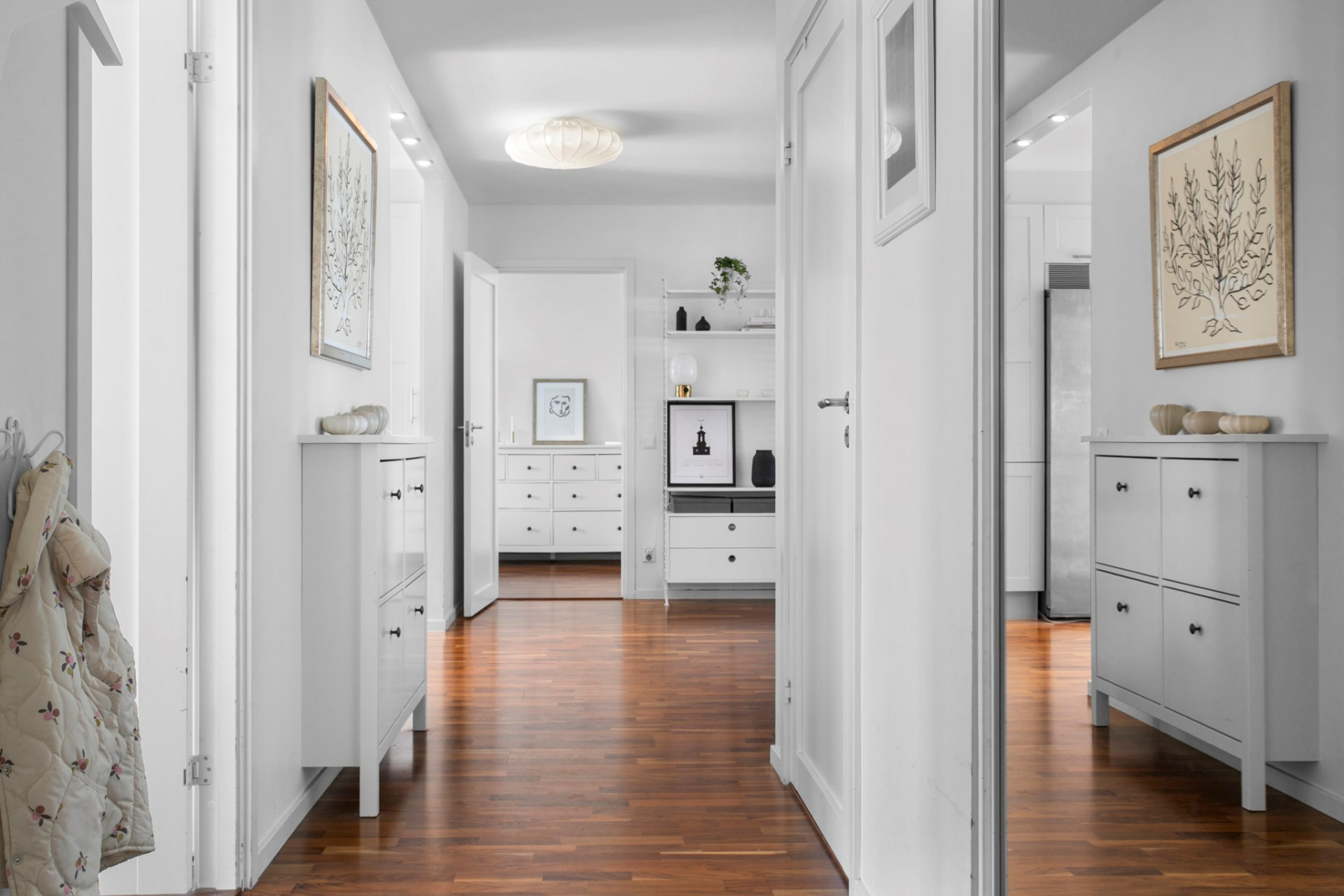En ljus och välkomnande entré med generösa avhängningsmöjligheter i garderober med skjutdörrar. Klinkergolv vid entrén övergår snyggt i den vackra valnötsparketten som löper vidare genom bostaden. Ytterdörren är en säkerhetsdörr som effektivt stänger ute ljud från trapphuset.