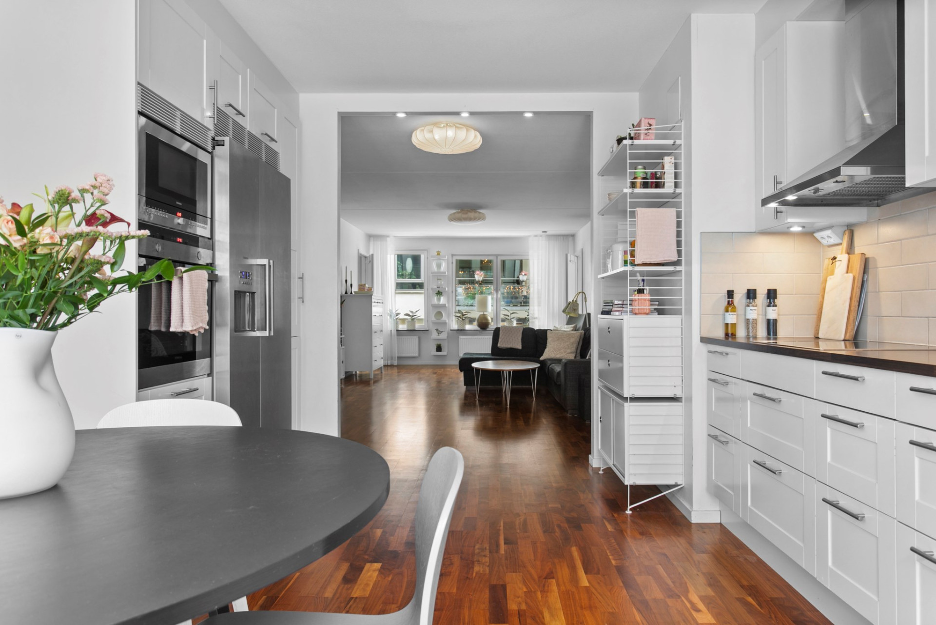 Den öppna planlösningen mot vardagsrummet förstärker den sociala atmosfären och även härifrån har man nära till uteplatsen och innergården.