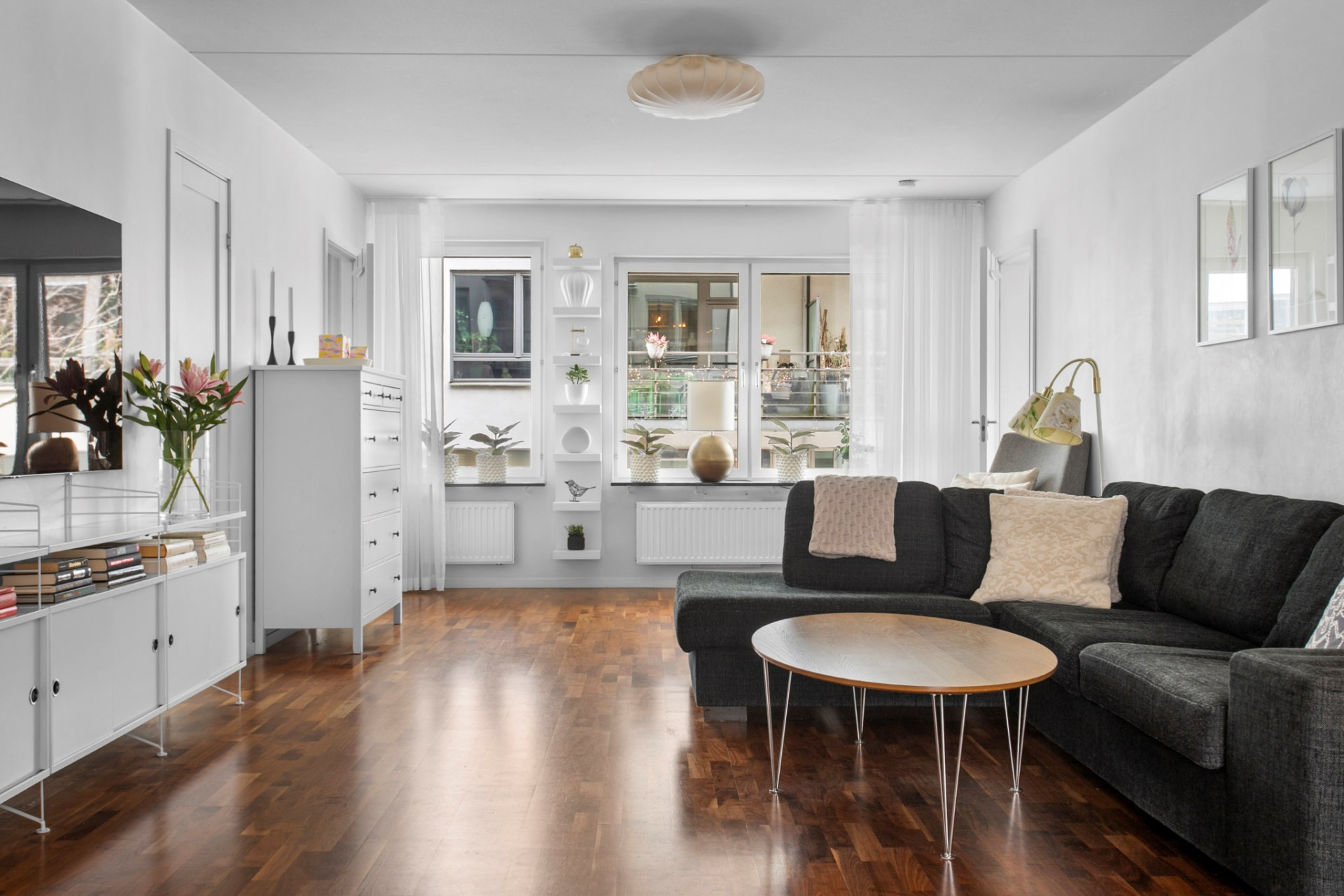 Ett ljust och luftigt vardagsrum med stort fönsterparti, där känslan av rymd är påtaglig. Här finns gott om plats för både en större soffgrupp och en rejäl matplats. Rummets kontakt med uteplatsen och grönytorna utanför är en av hemmets största kvaliteter och påminner återigen om radhusboende.