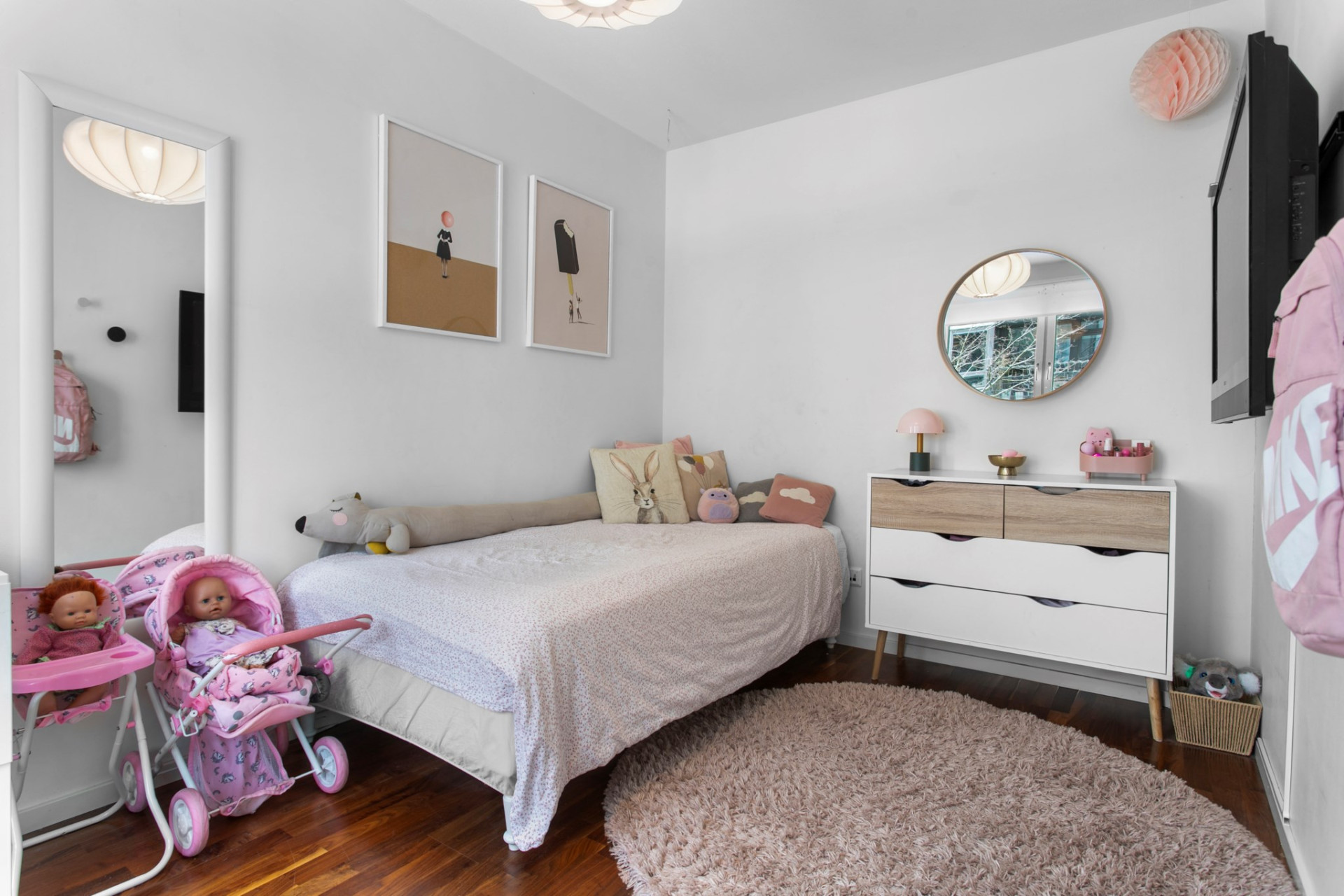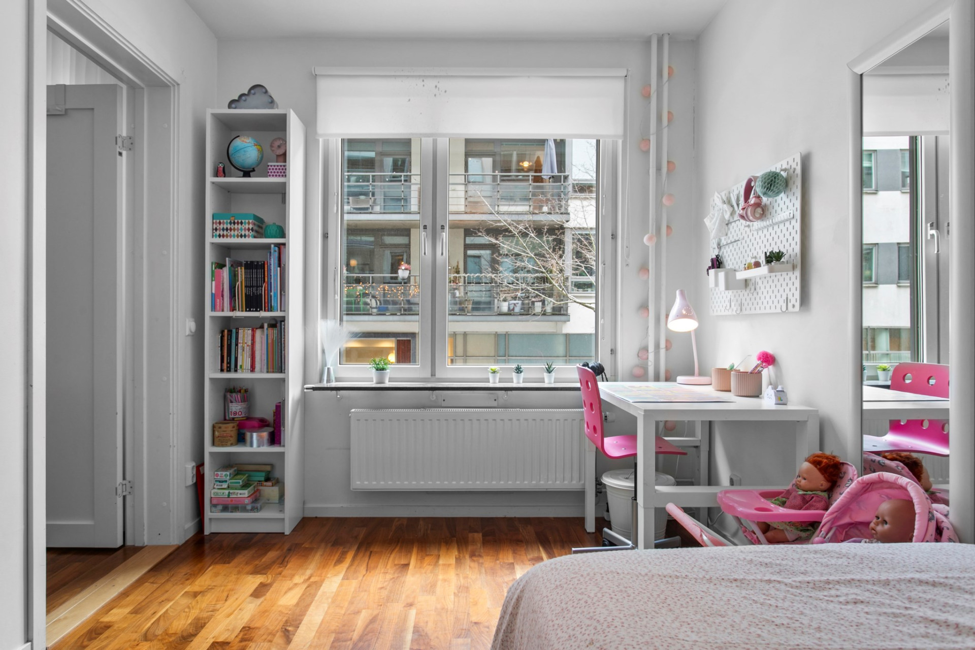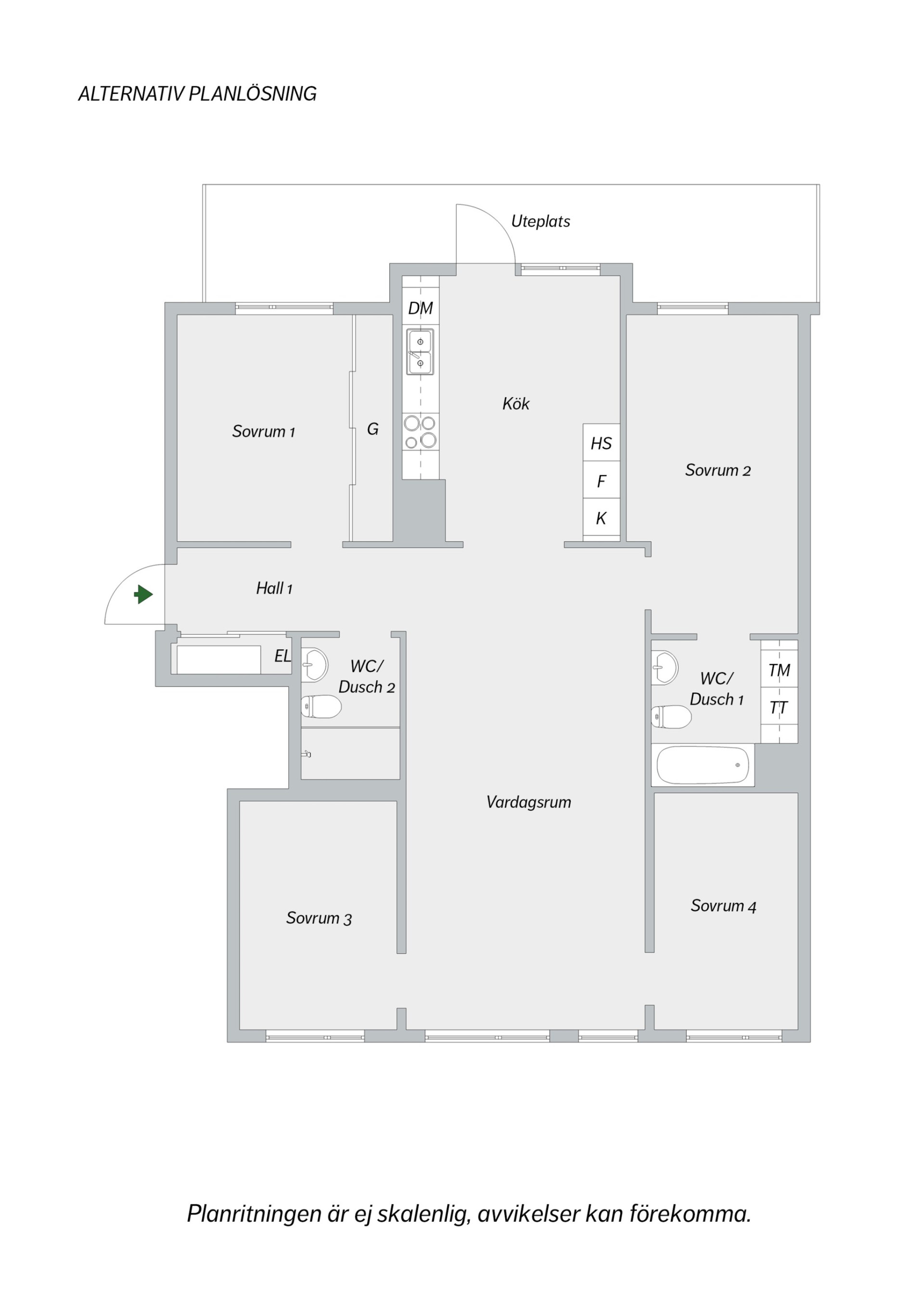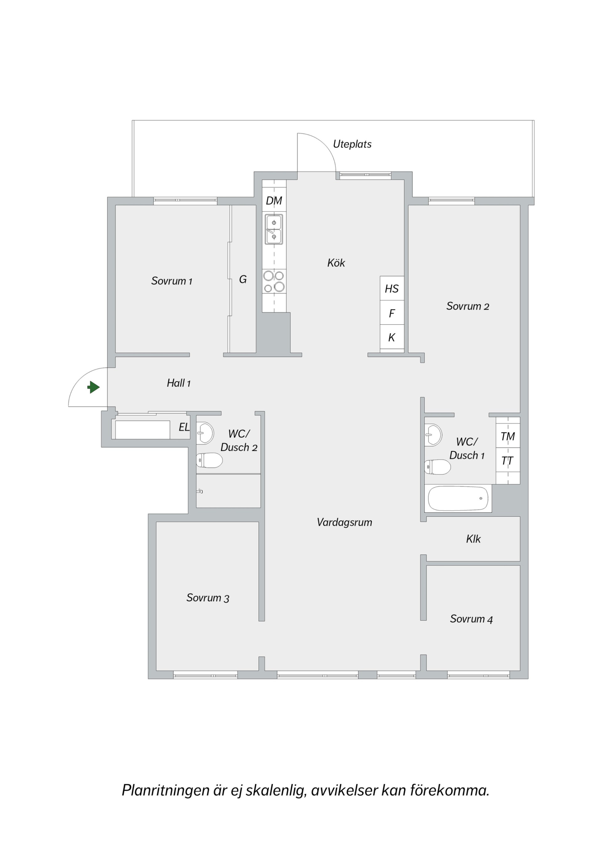 Två sovrum vetter mot den lugna innergården. De andra två sovrummen nås från vardagsrummet och vetter mot stillsamma Grönbrinksgatan. Det största sovrummet har ett eget badrum med tvättdel.