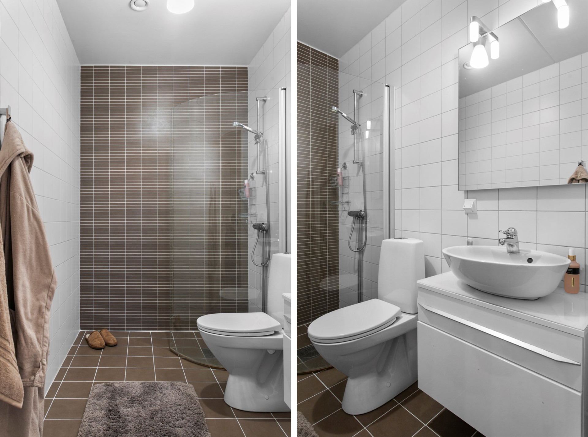 Påkostat och helkaklat duschrum med glasvägg, wc, kommod, spegel, god förvaring och golvvärme. Det ljusa kaklet bryts av med mörkt klinkergolv . Badrummet nås direkt från hallen.