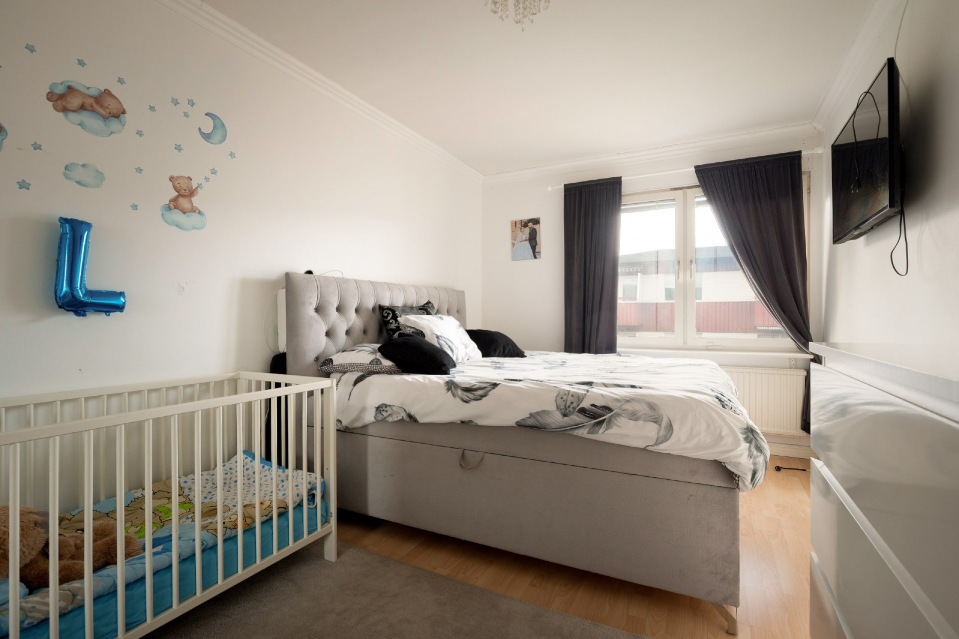 Stort sovrum med laminatgolv, garderober och fönster. Här finns plats för dubbelsäng, nattduksbord och mer därtill.