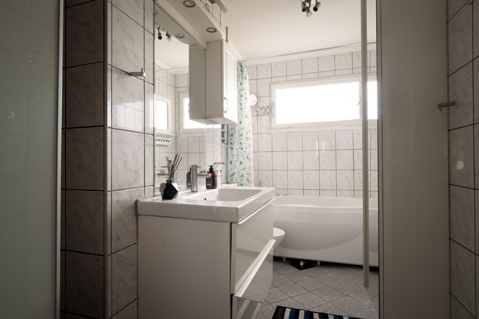 Helkaklat badrum med vädringsfönster. Badrumsutrustningen består av: wc, bubbelbadkar, skåp, kommod samt spegel med sidoskåp.