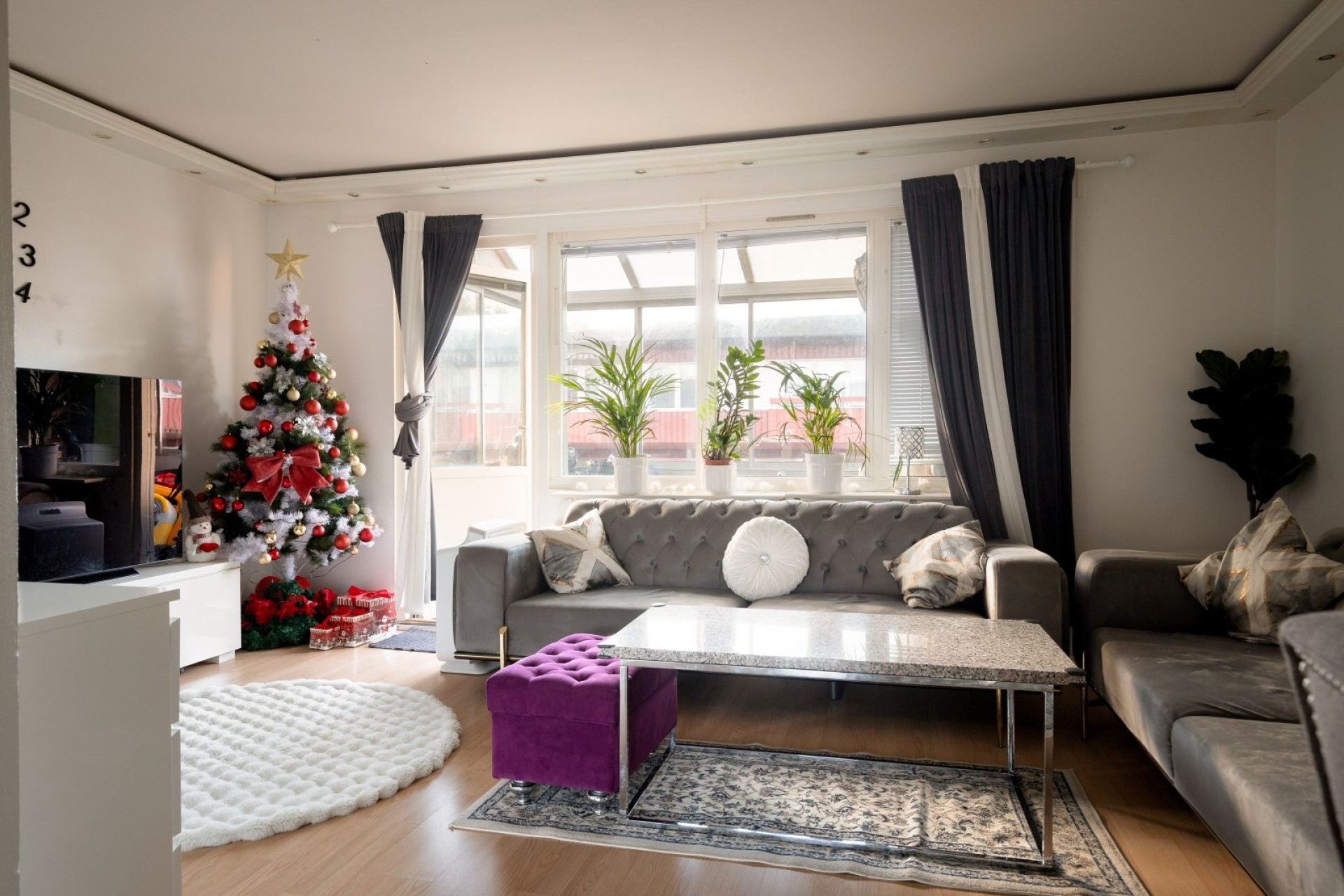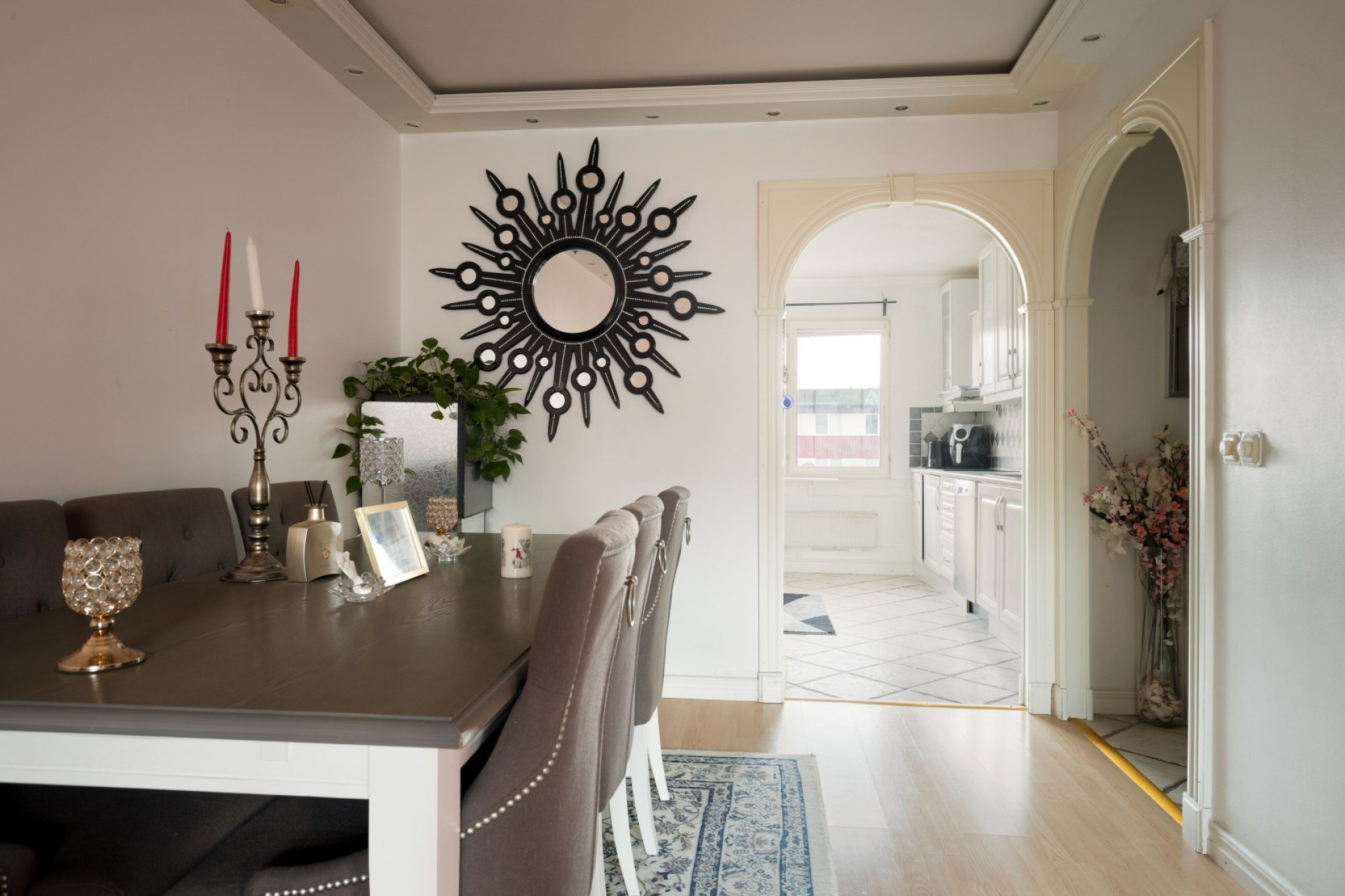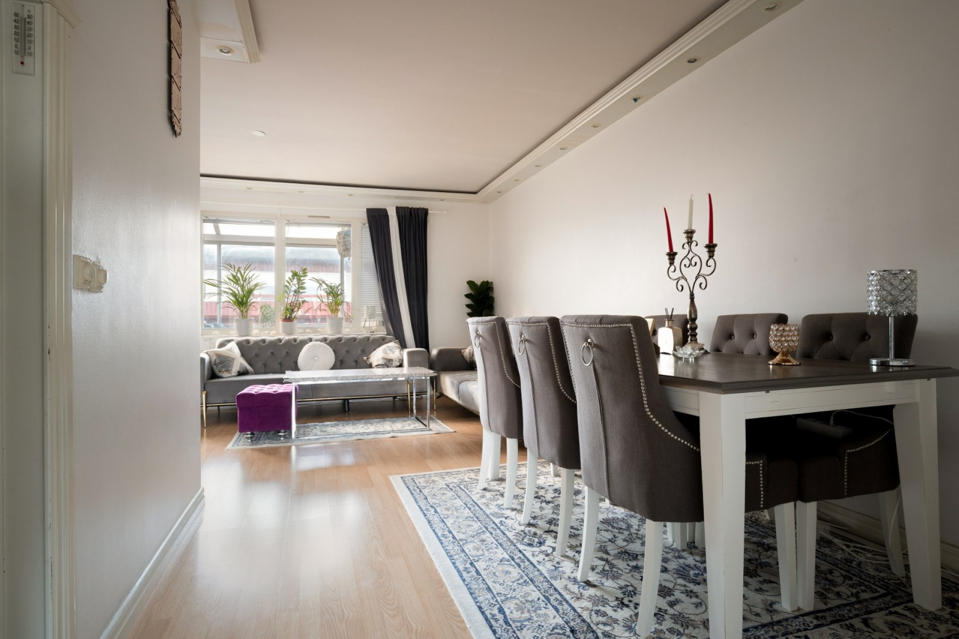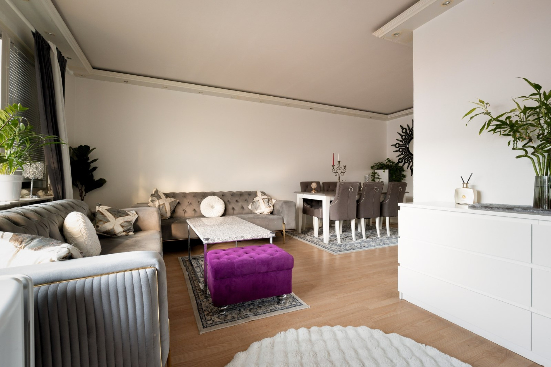 Lättmöblerat vardagsrum med laminatgolv, läcker stuckatur i tak med inbyggd spotbelysning och generösa fönsterpartier som släpper in härligt ljus. Här finns gott om plats för möblemang. Från vardagsrummet är det utgång till lägenhetens inglasade balkong.