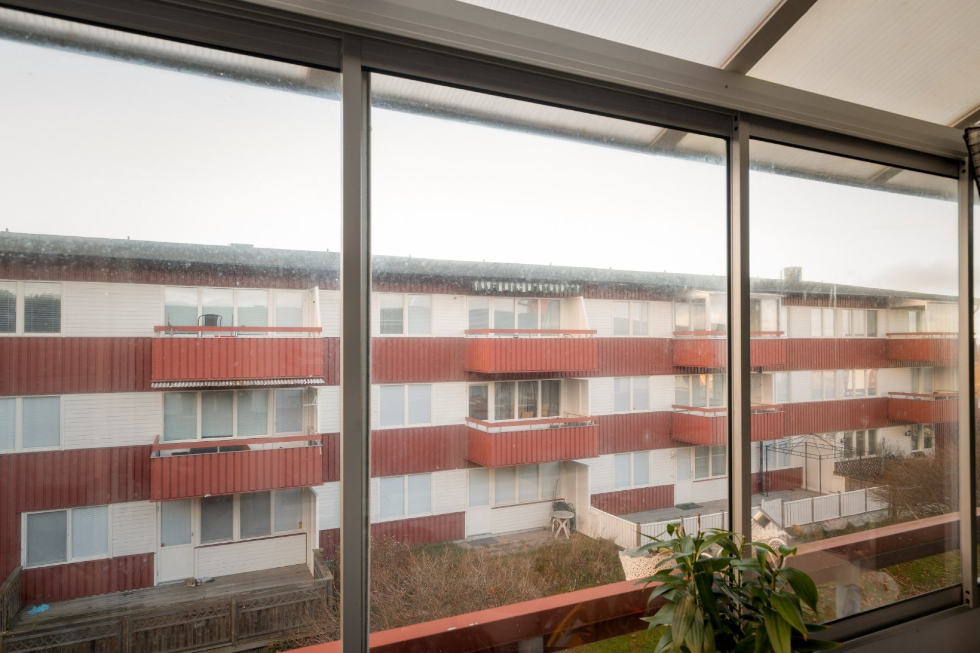 Stor inglasad balkong i västerläge. Balkongen bjuder på gott om plats att möblera med utemöbler och blommor. Det här kan bli en riktigt mysig plats för avkoppling där de praktiska skjutbara glasdörrarna kan öppnas upp eller stängas till efter säsong. Inglasningen möjliggör också en utökad användning under året