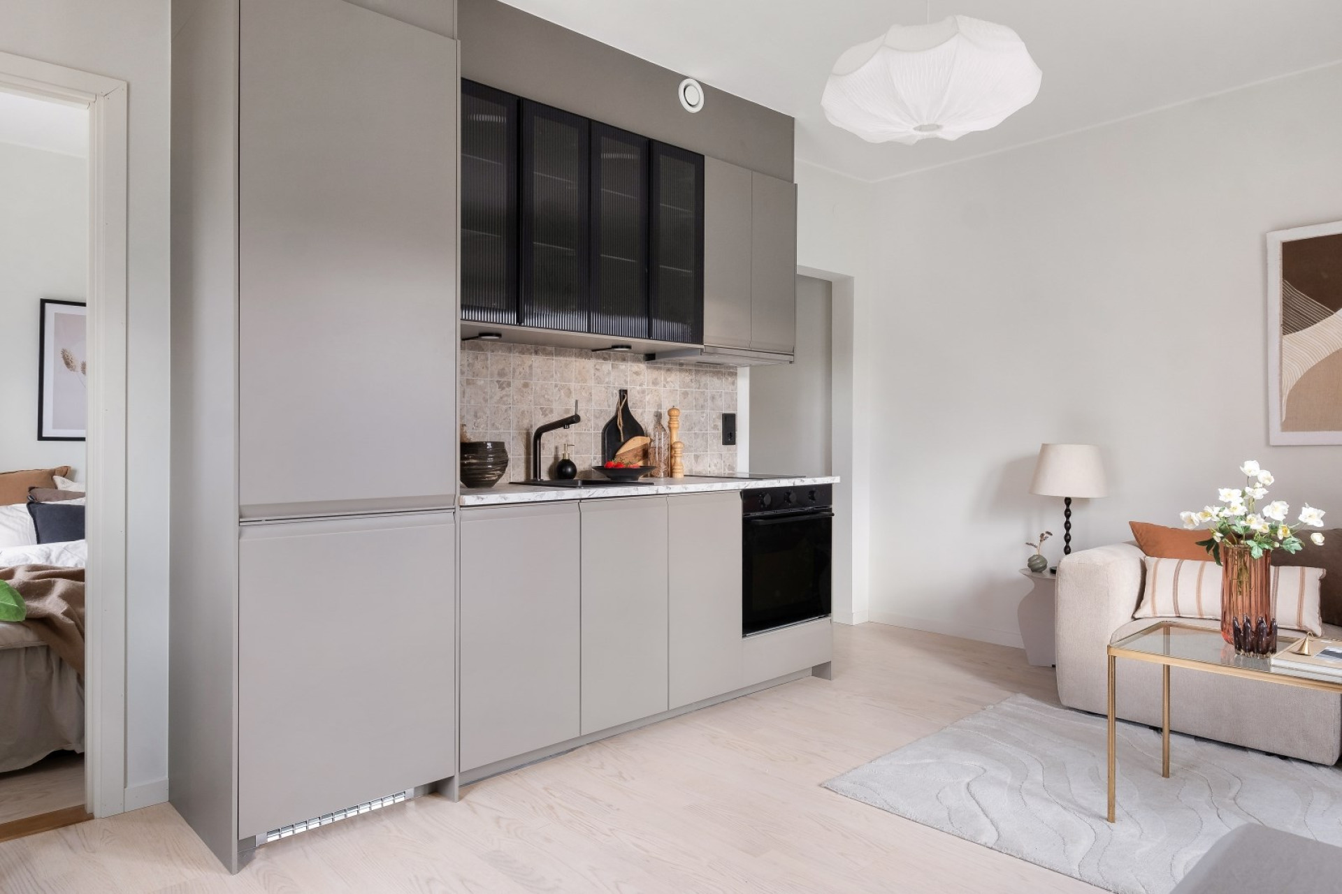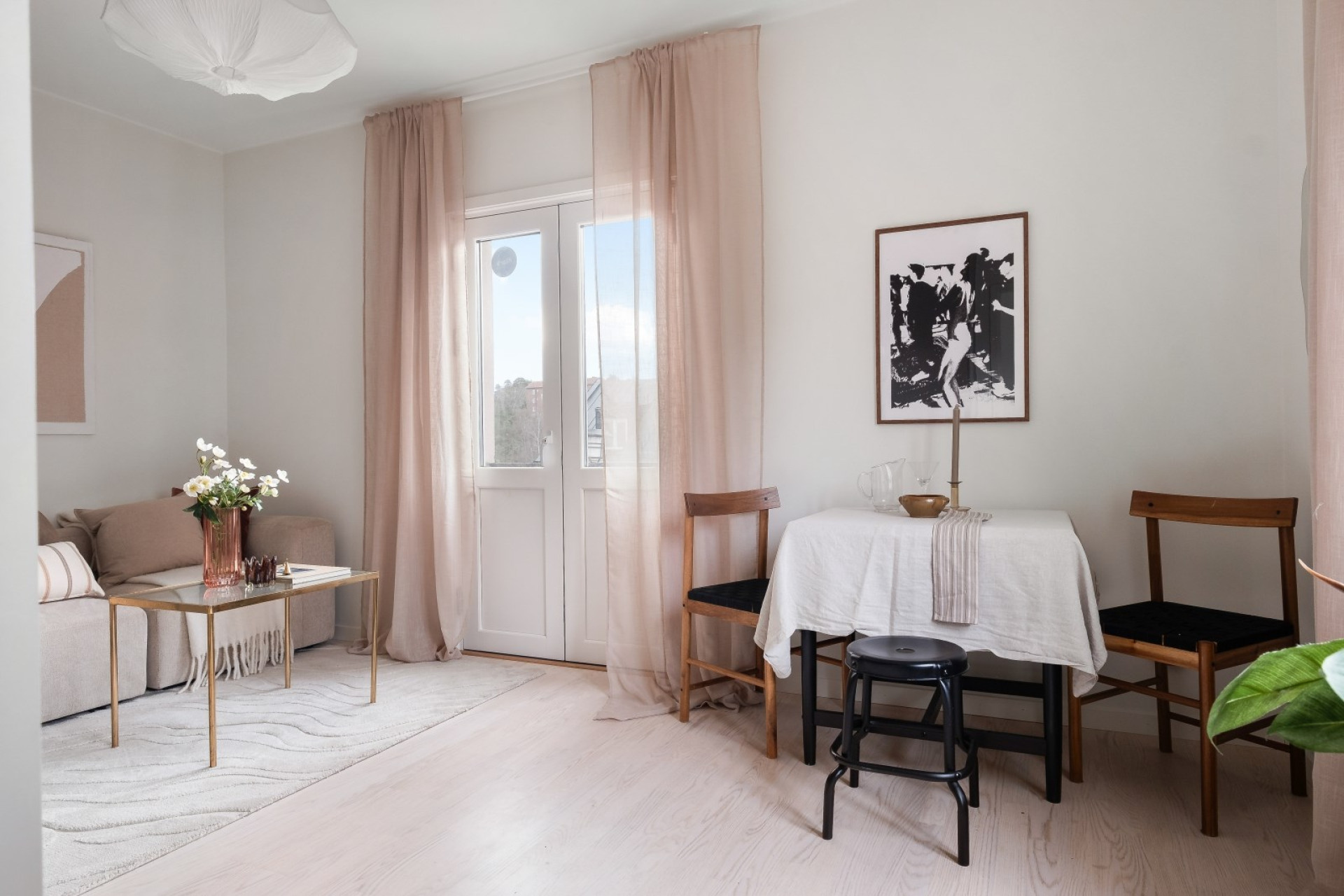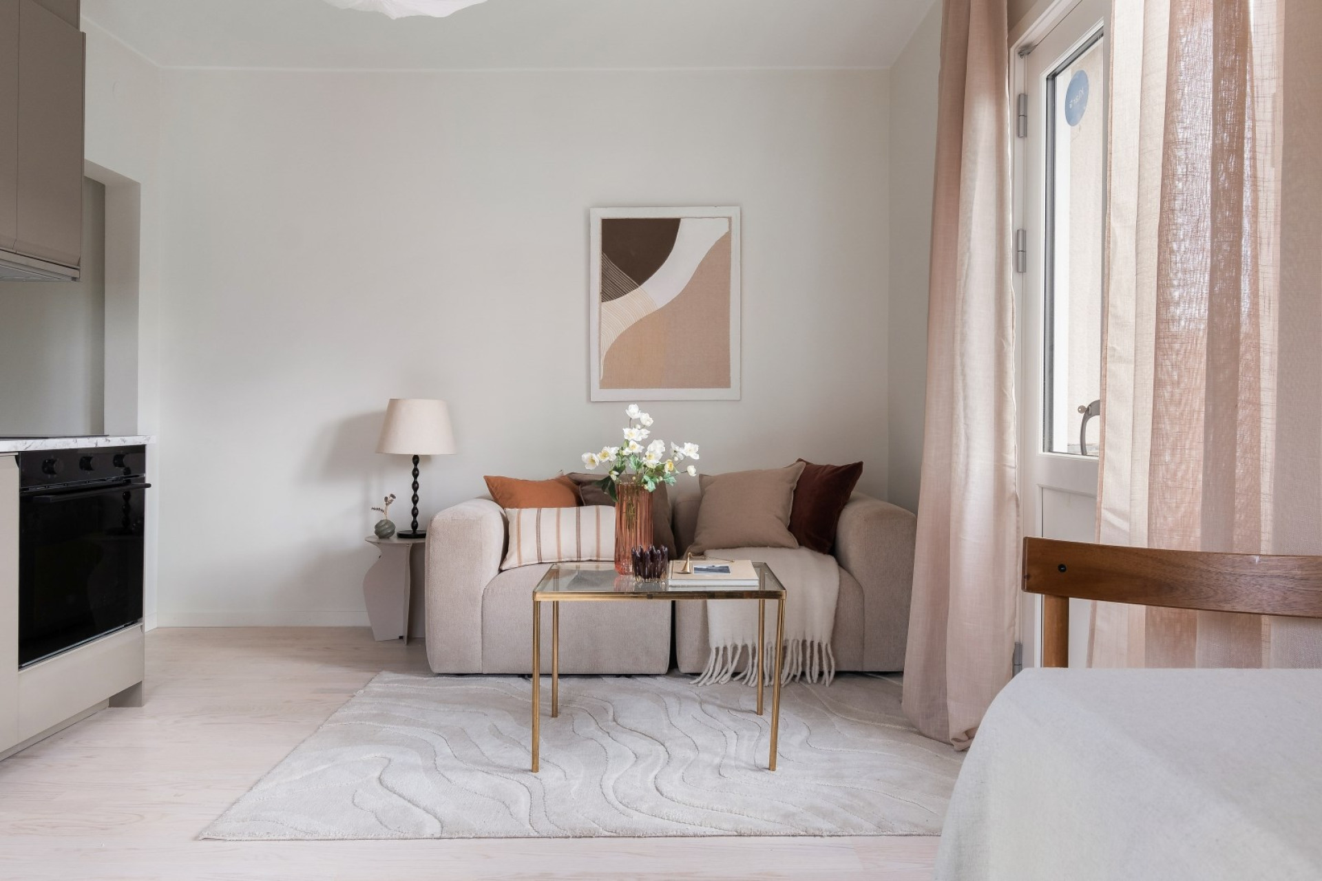 Det sociala vardagsrummet bjuder in till både avkoppling och middagssällskap, med stora fönster som fyller rummet med ljus. Köket är smakfullt och yteffektivt, med god förvaring och arbetsyta. Det rofyllda sovrummet ligger avskilt och erbjuder plats för både säng och garderober. Badrummet är fräscht och funktionellt.