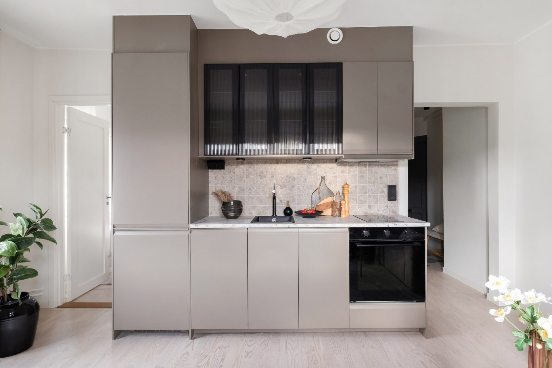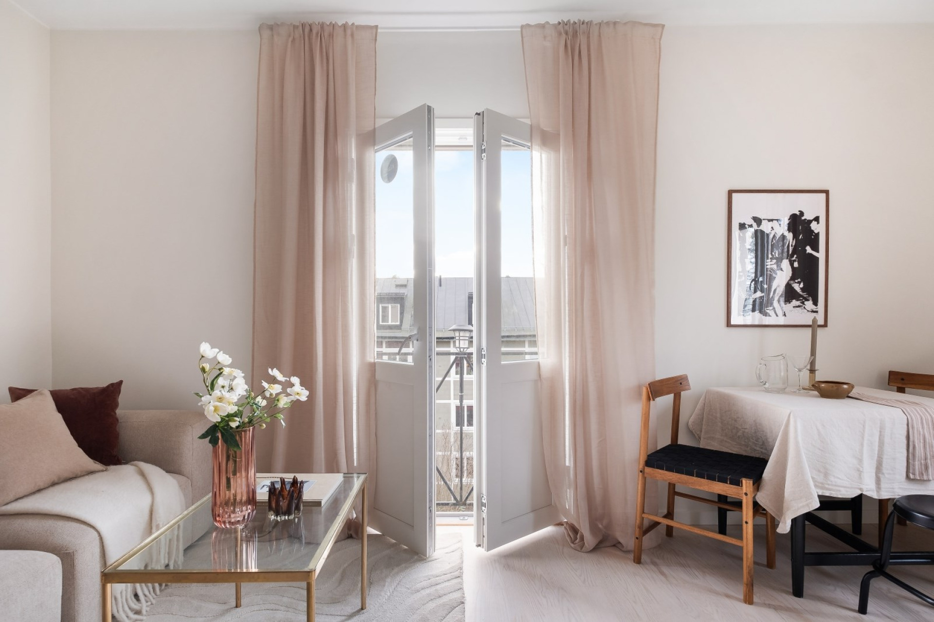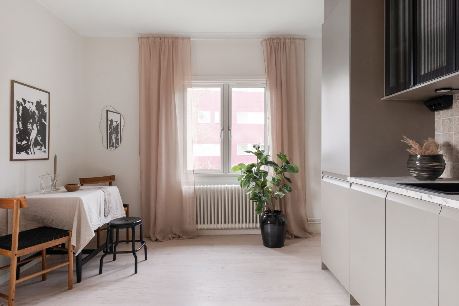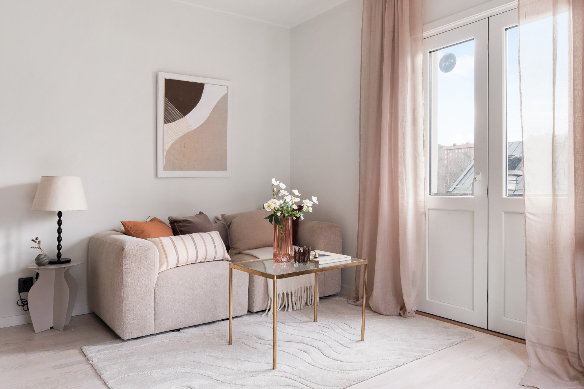 Det sociala vardagsrummet bjuder in till både avkoppling och middagssällskap, med stora fönster som fyller rummet med ljus. Köket är smakfullt och yteffektivt, med god förvaring och arbetsyta. Det rofyllda sovrummet ligger avskilt och erbjuder plats för både säng och garderober. Badrummet är fräscht och funktionellt.