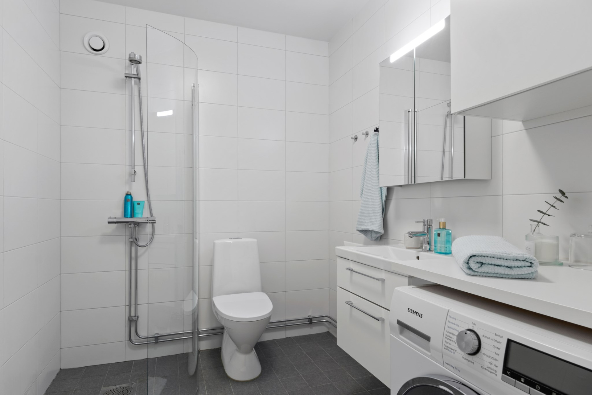 Helkaklat badrum i tidlös design med duschhörna, wc, handfat med kommod samt spegelskåp. Tvättmaskin under en praktisk arbetsbänk gör vardagen smidig och effektiv.