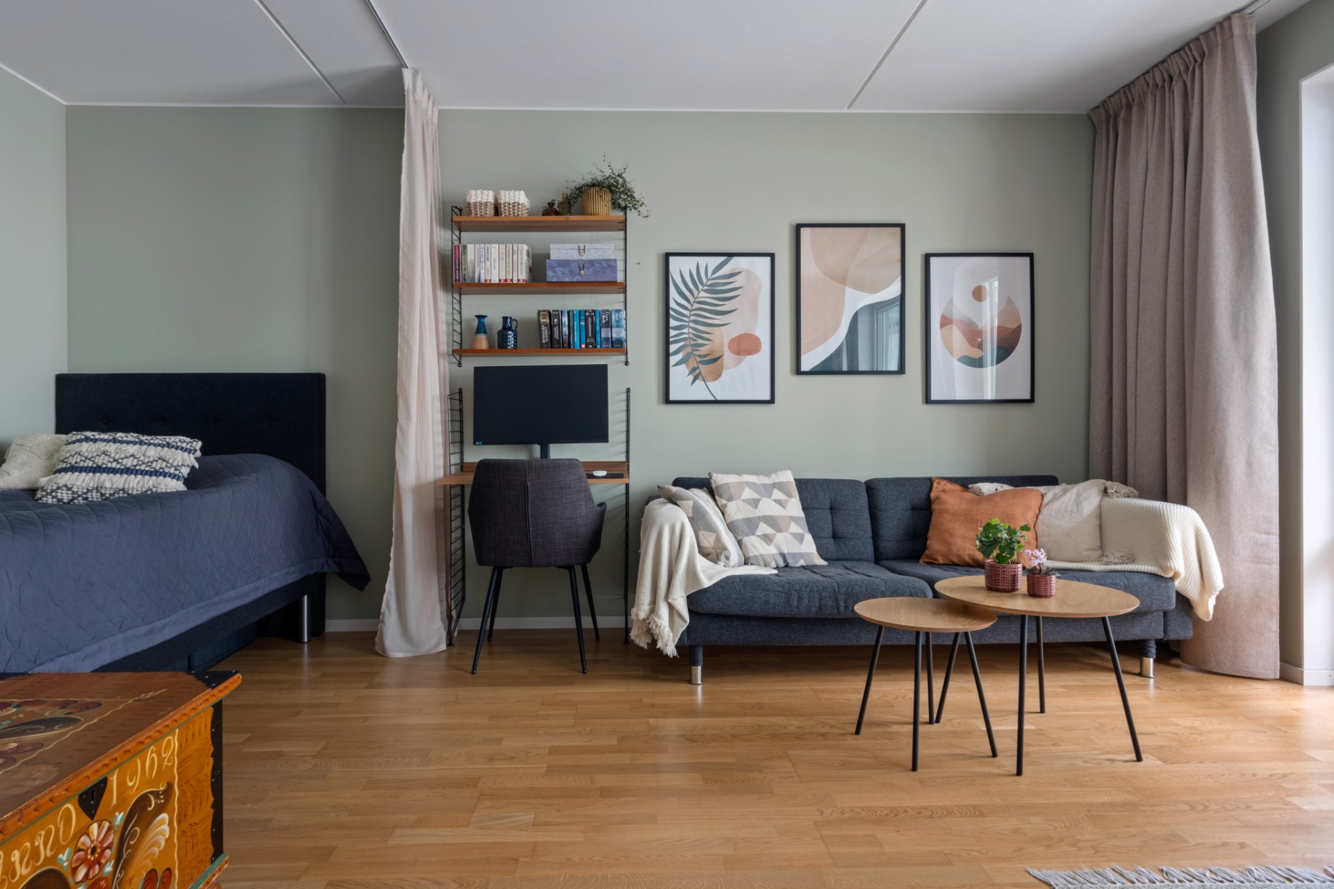 Ljust och rymligt allrum med plats för både soffa, säng och matbord. De stora fönsterpartierna skapar ett härligt ljusinsläpp och en luftig känsla. Här finns också en praktisk sovalkov.