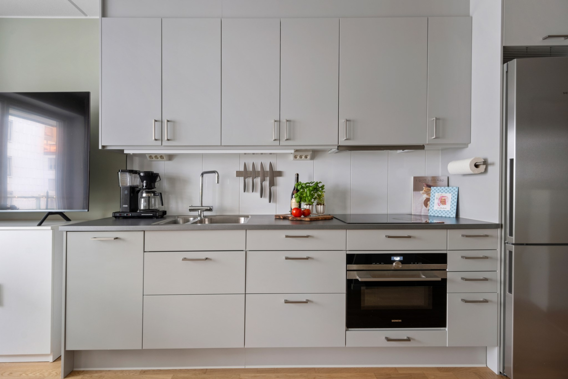Stort och modernt kök i stilren design med fina vitvaror, bra arbetsytor och gott om förvaring. Perfekt för dig som gillar att laga mat och bjuda hem vänner.