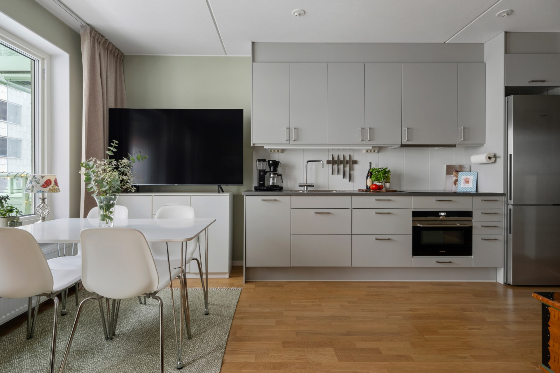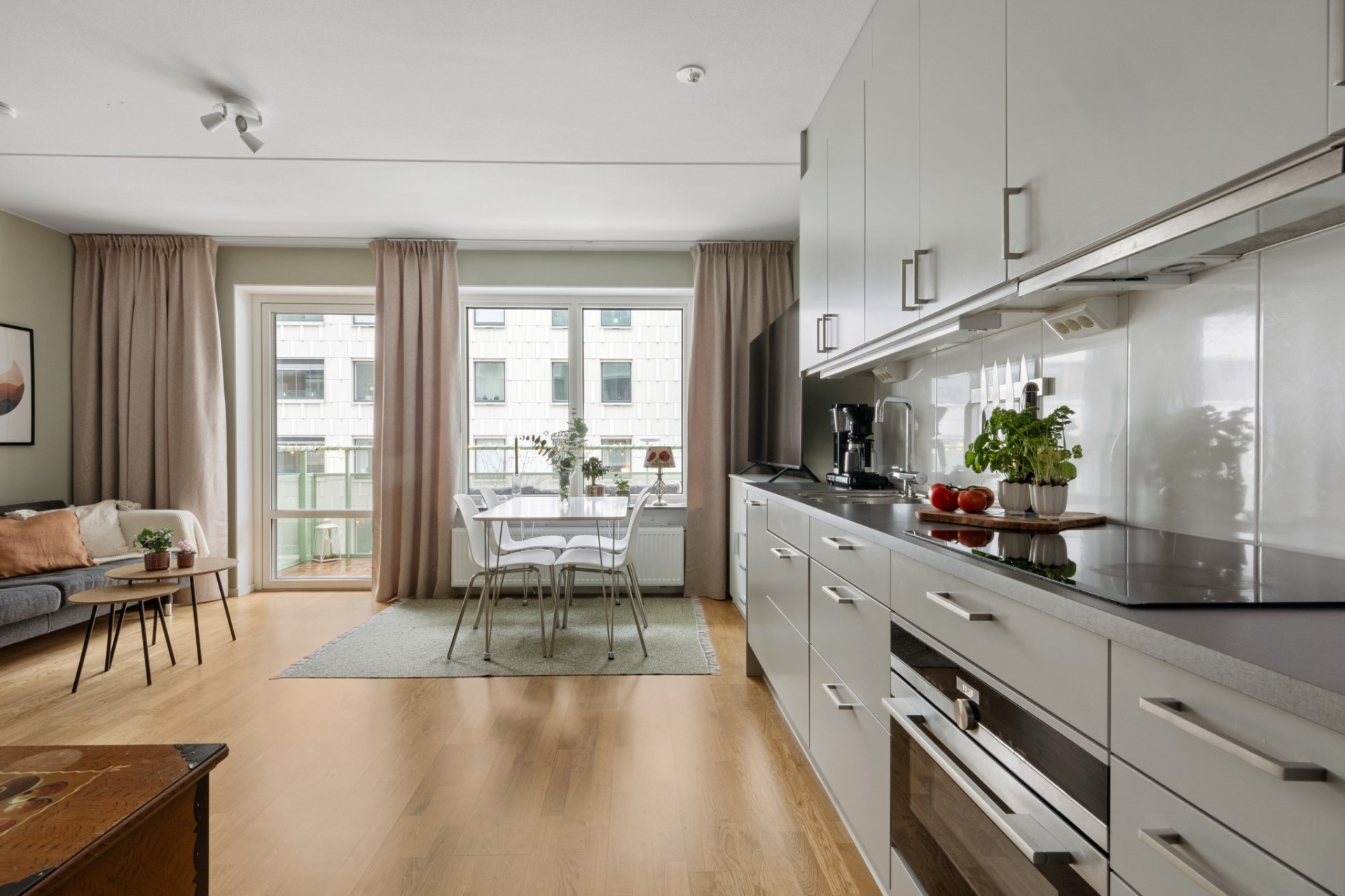 Här möts du av en ovanligt välplanerad lägenhet där varje kvadratmeter är genomtänkt. Det stora köket bjuder in till matlagning och umgänge, allrummet är ljust och luftigt tack vare generösa fönsterpartier och det helkaklade badrummet ger en känsla av vardagslyx. Lägenheten har en stilren och modern känsla som gör det enkelt att inreda efter smak och behov.