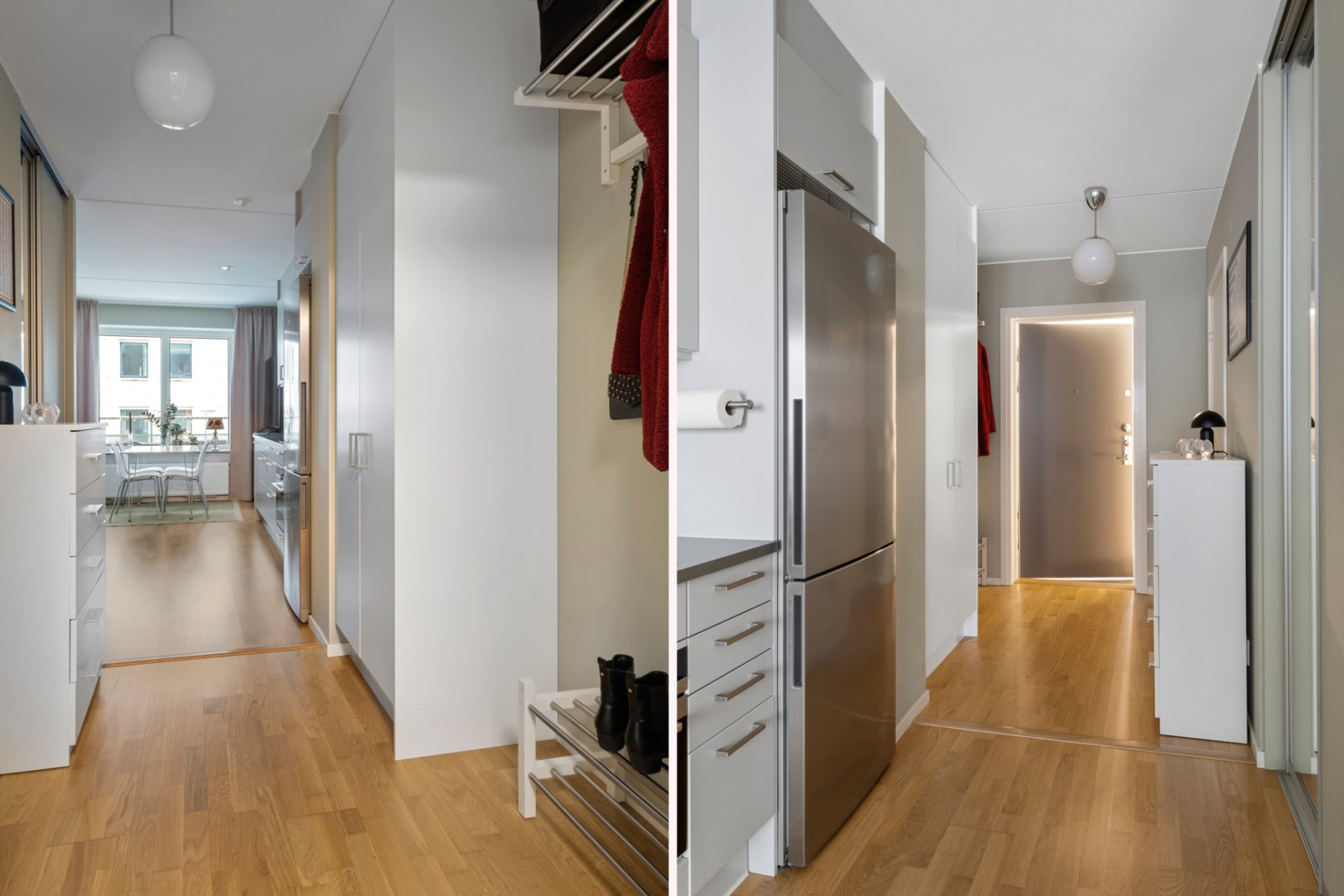 Välkomnande hall som erbjuder gott om förvaring för både kläder och skor. Stilrena materialval och ett enhetligt golv leder dig vidare in i bostaden.
